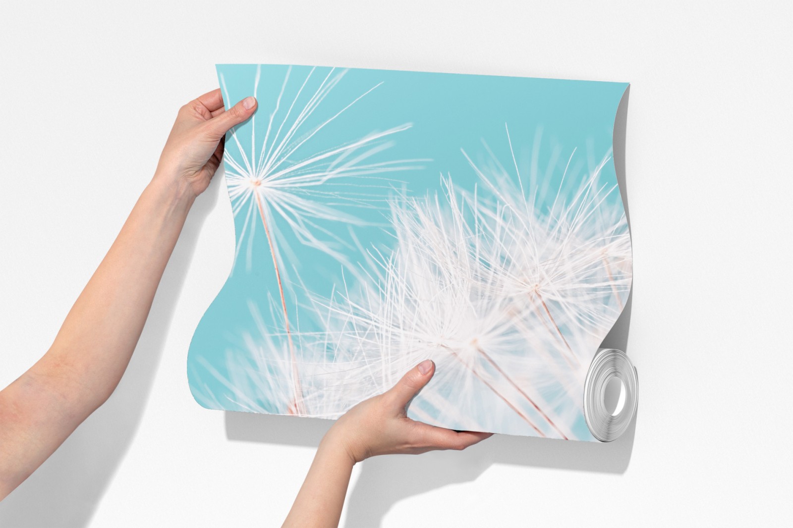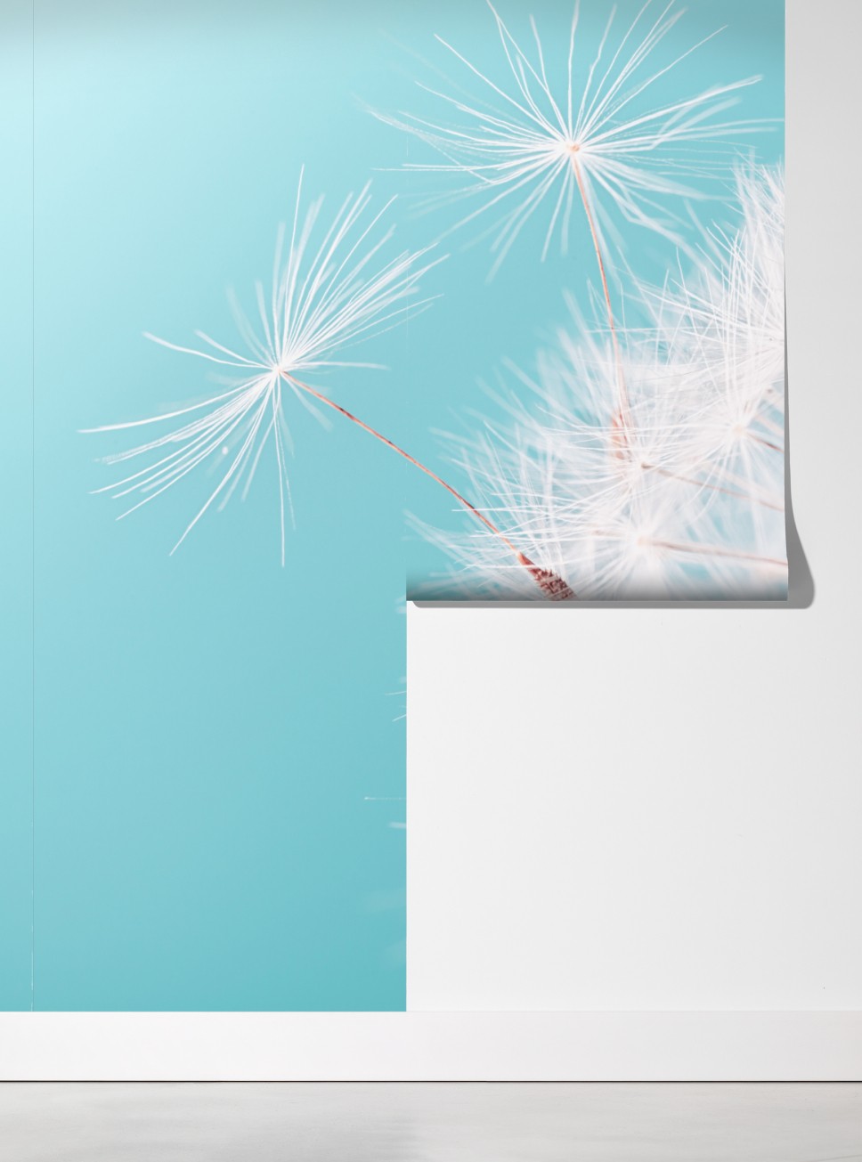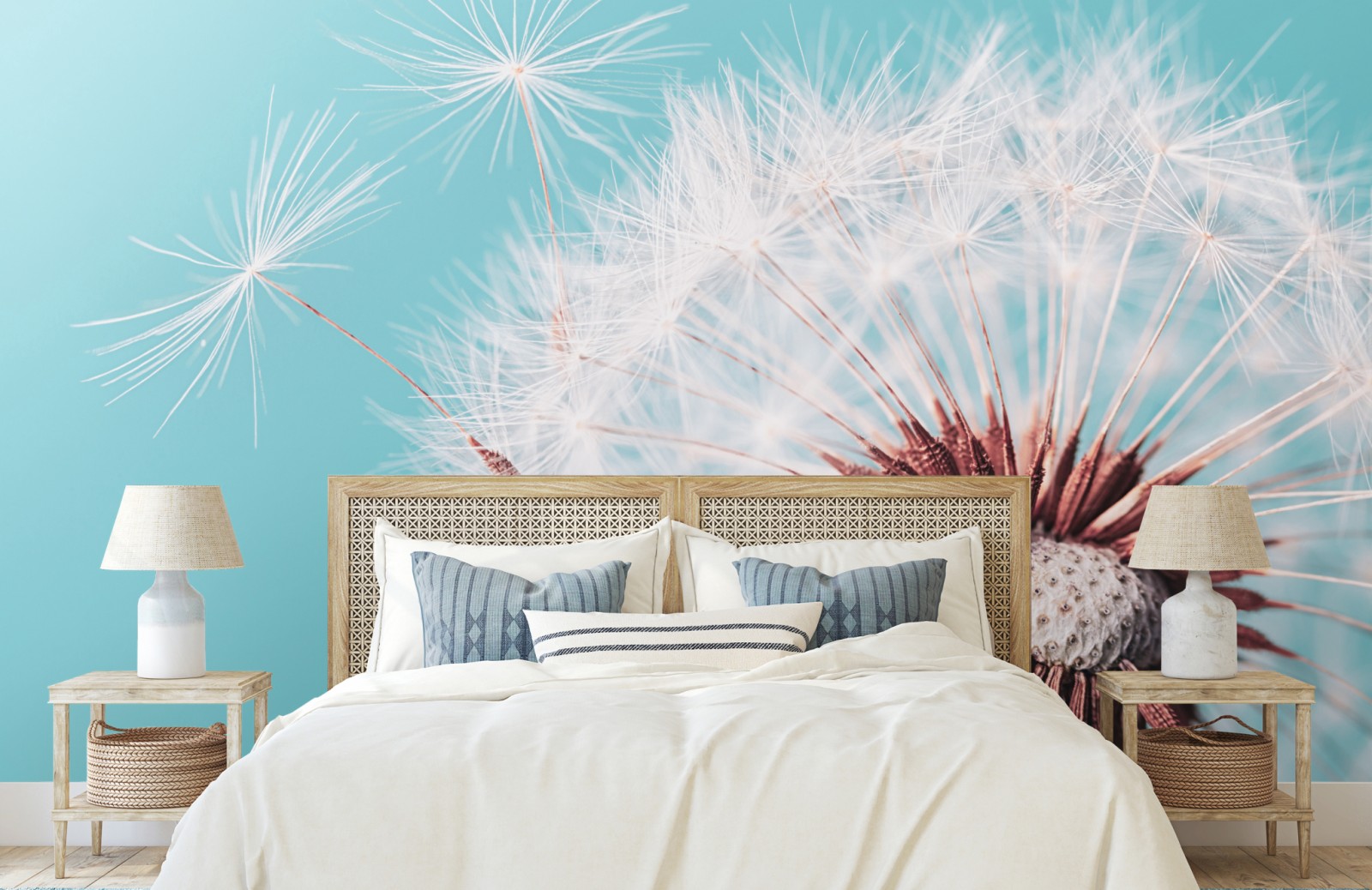 Delikatne nasiona dmuchawca unoszą się na kojącym turkusowym tle, wprowadzając do wnętrza naturalną aurę spokoju.