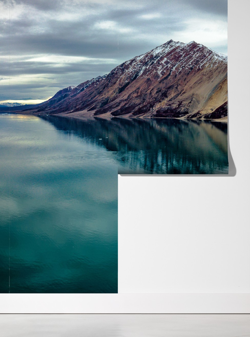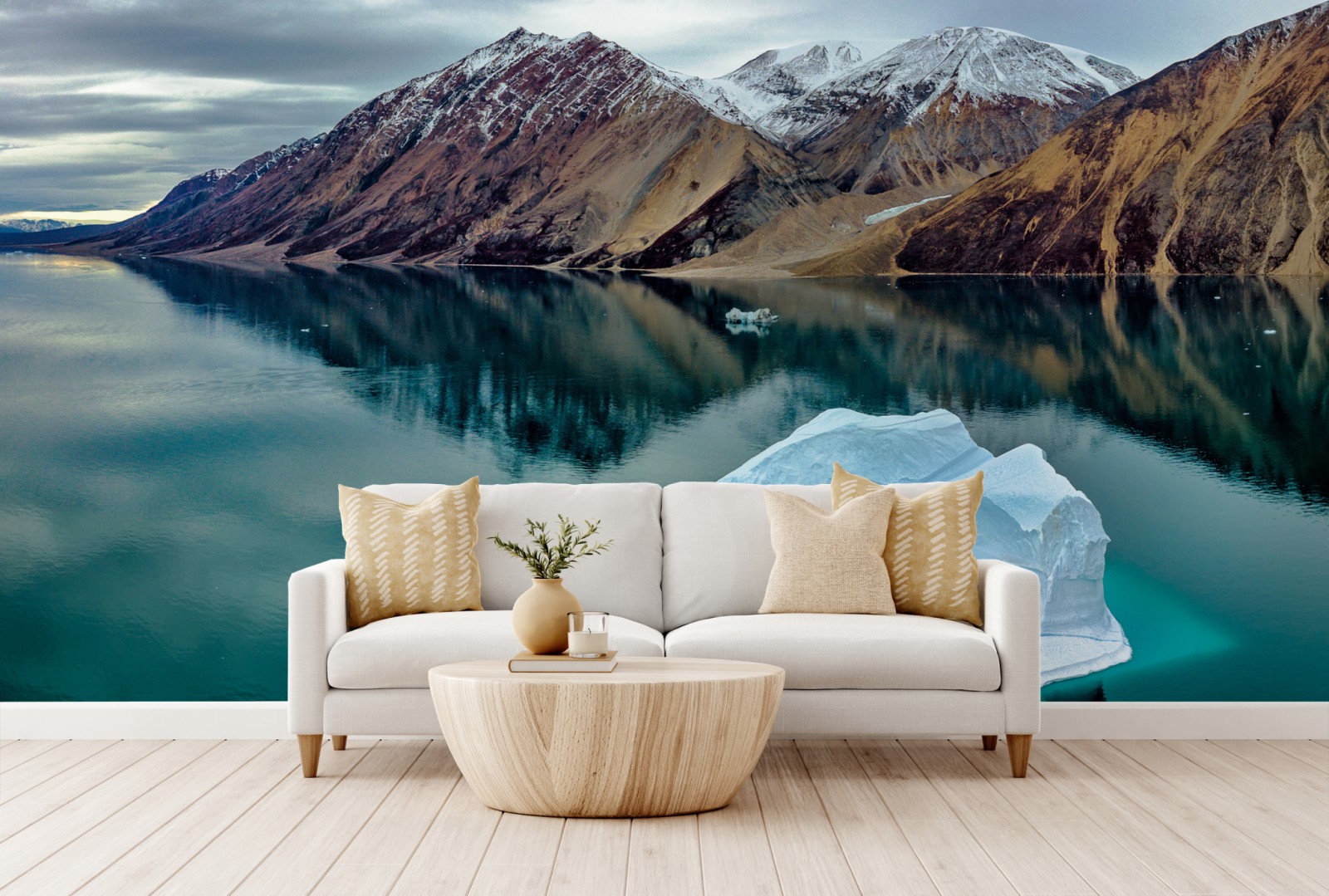 Wprowadź do wnętrza spokojną arktyczną scenerię z turkusową wodą, rzeźbioną górą lodową i dramatycznymi odbiciami gór.