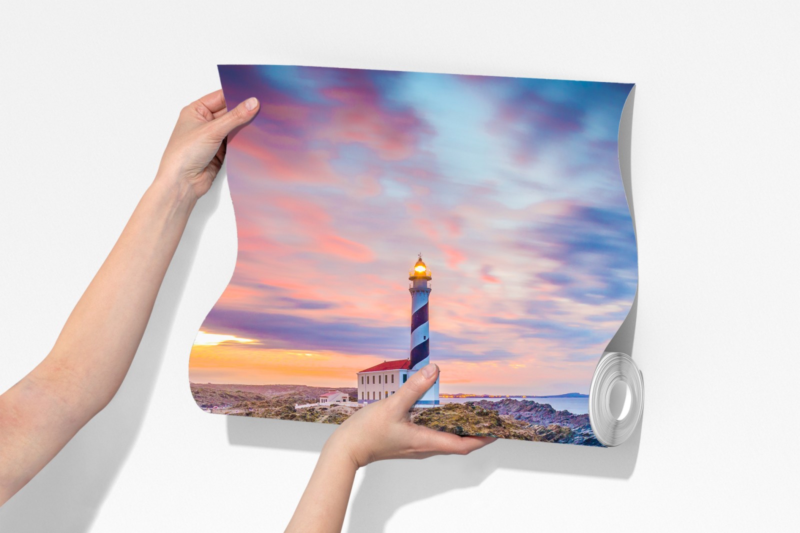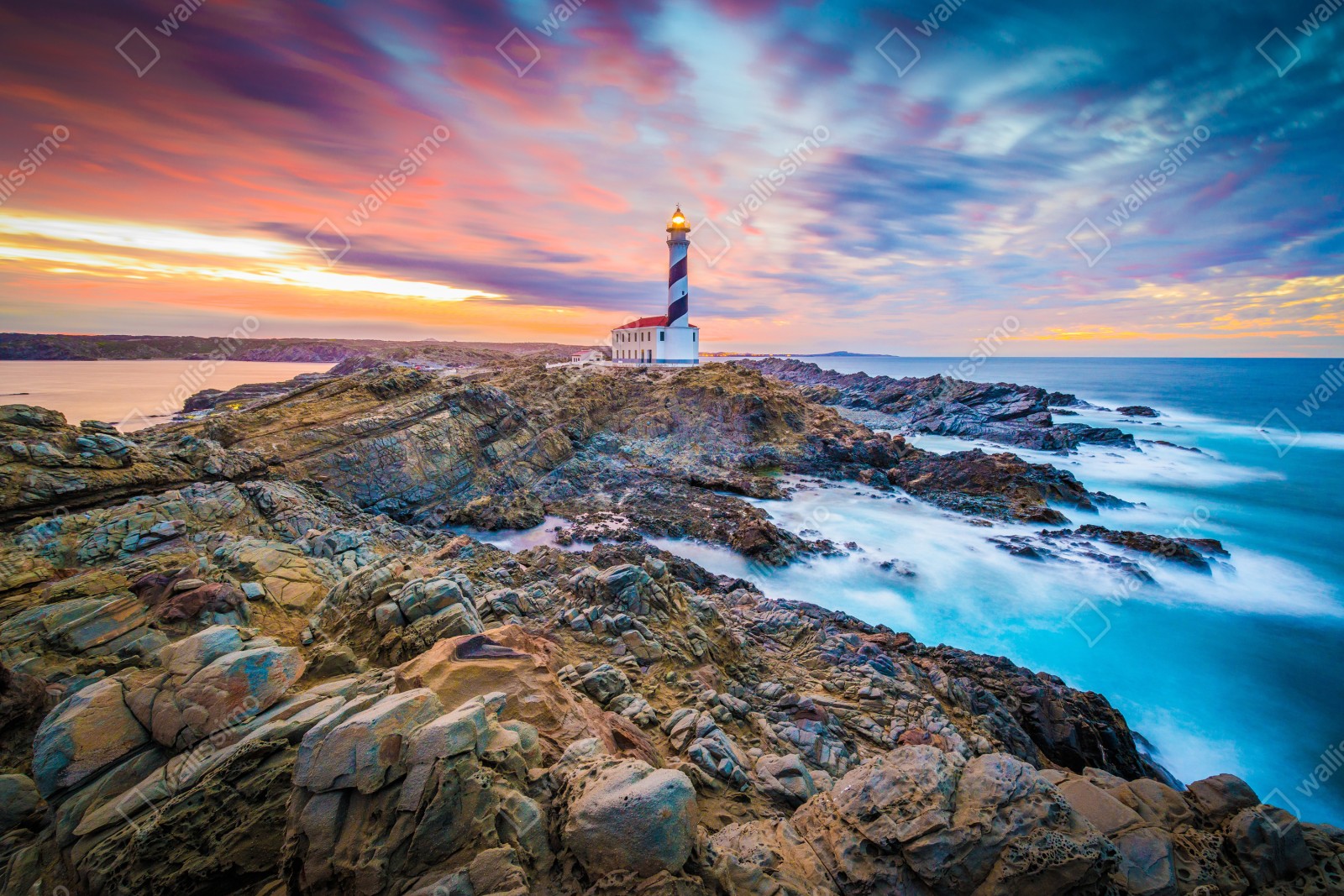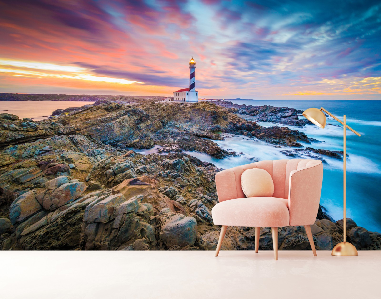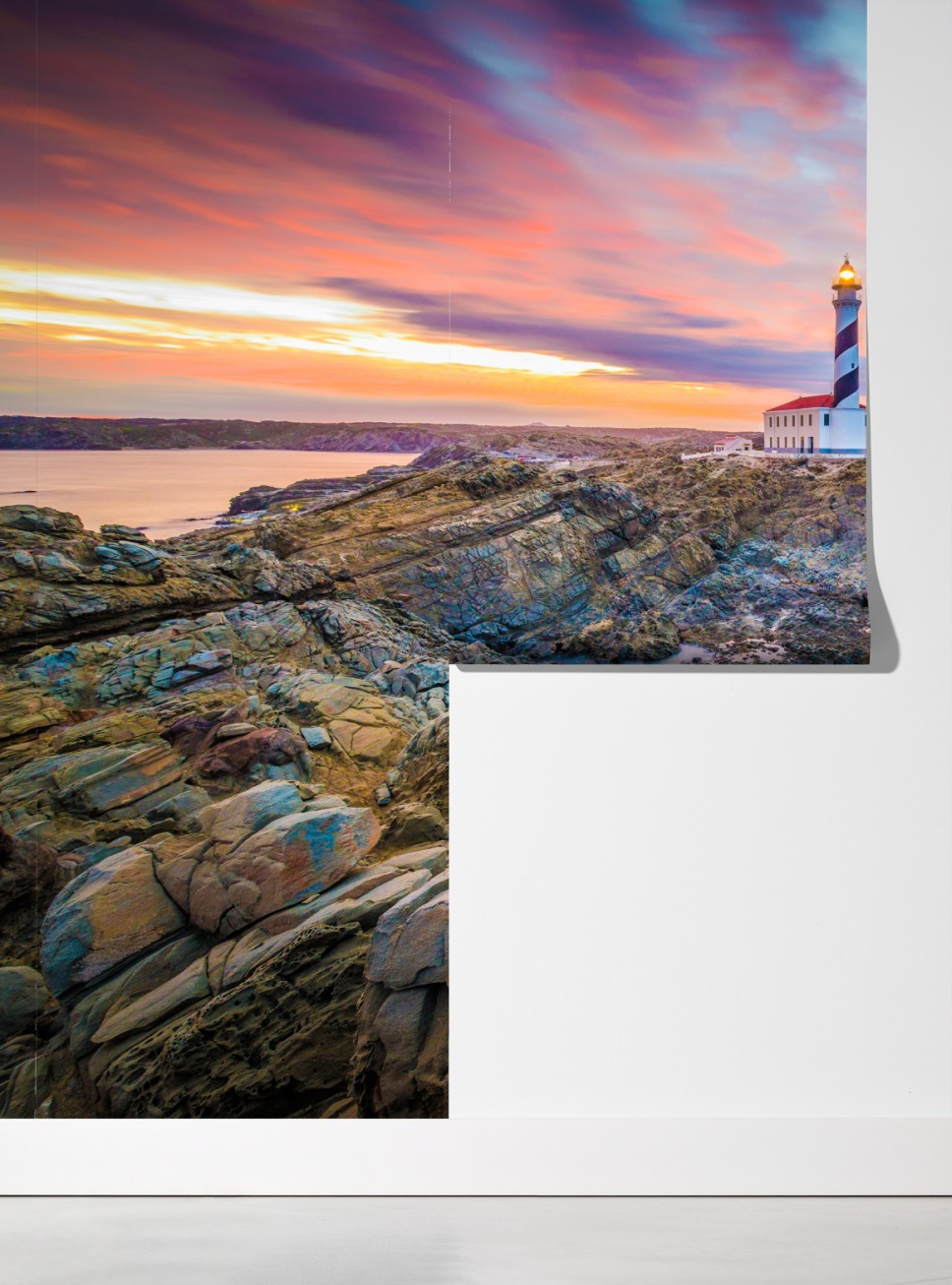 Wprowadź nadmorską atmosferę do wnętrza dzięki dramatycznemu zachodowi słońca przy latarni Favaritx na Minorce, z intensywnymi barwami nieba i surowymi skałami.