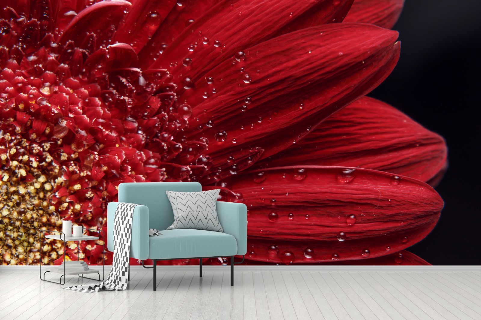 Fototapeta Czerwona gerbera makro z kroplami rosy