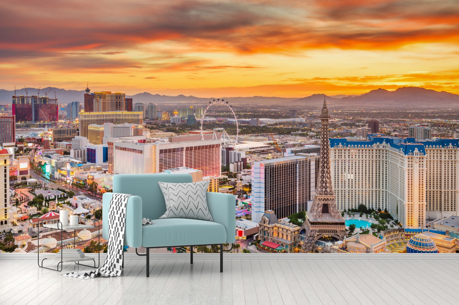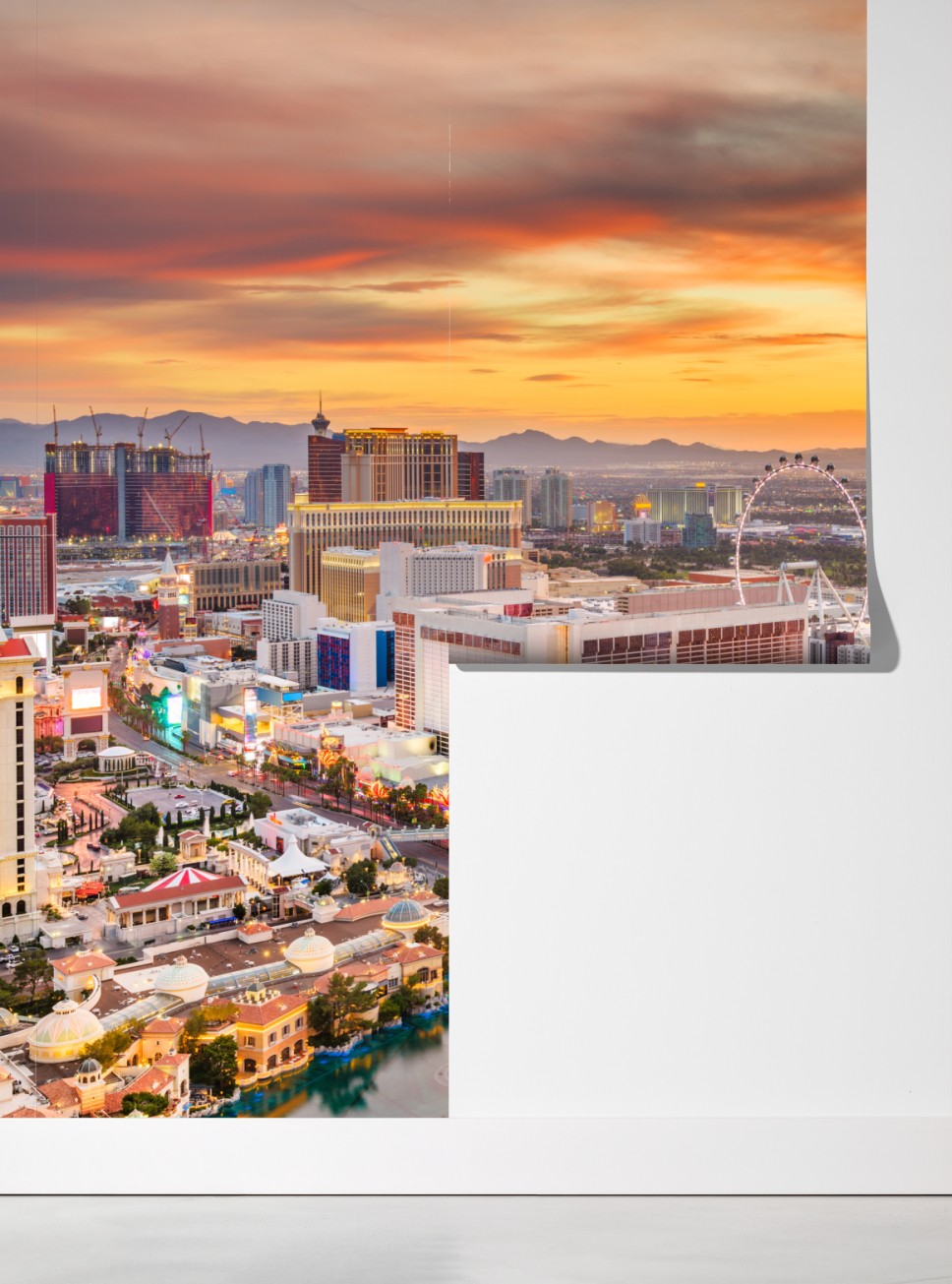 Wprowadź dynamiczną energię Las Vegas do swojego wnętrza dzięki tej imponującej fotografii panoramy miasta o zmierzchu.