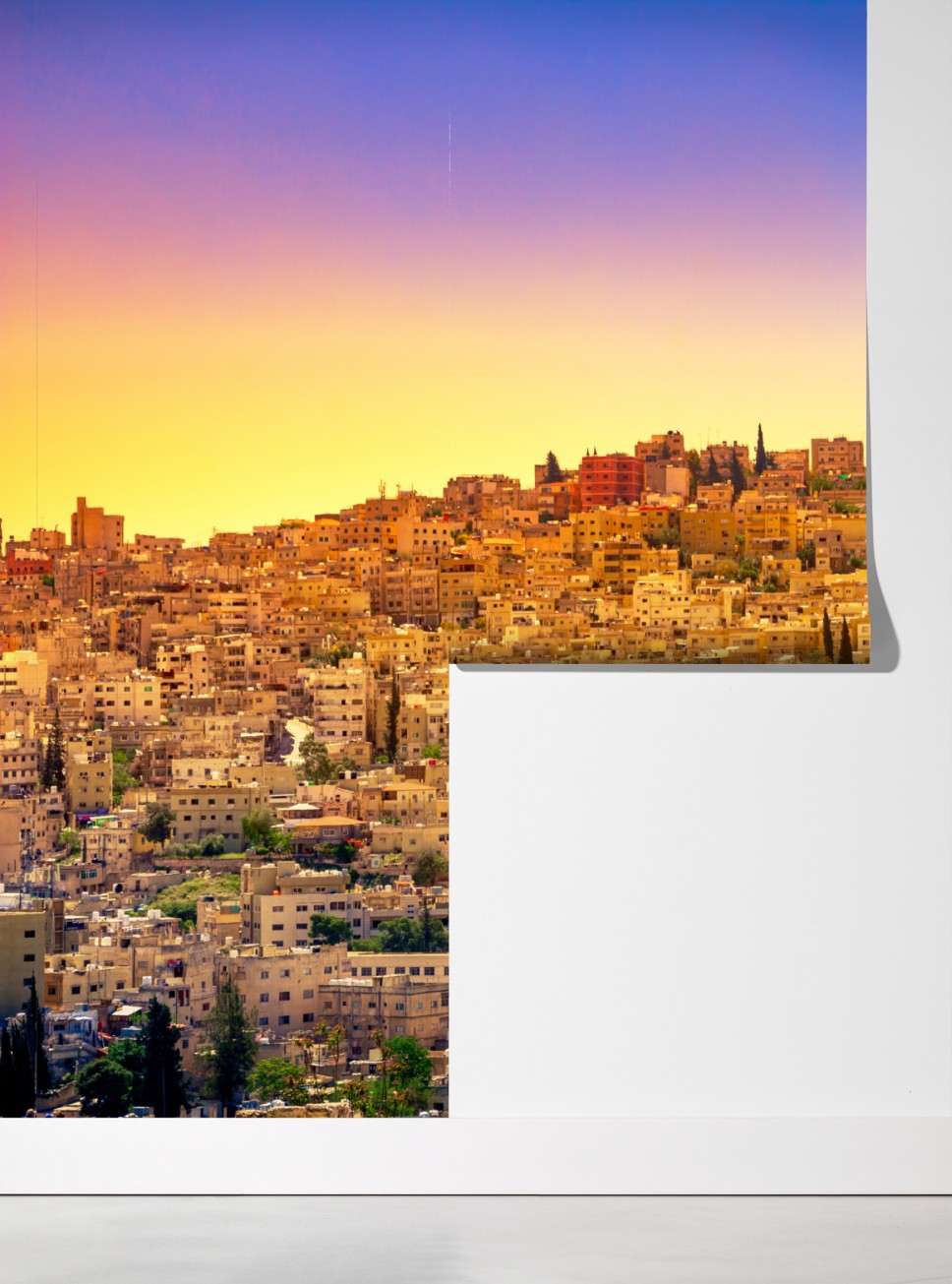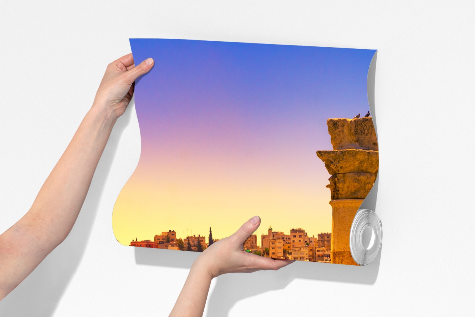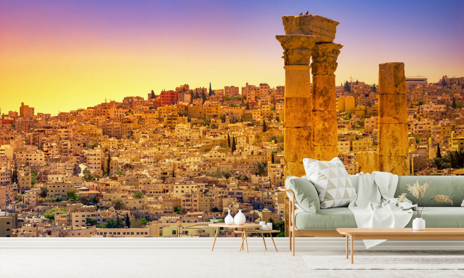 Dodaj ciepły, historyczny akcent do wnętrza dzięki złotej panoramie Ammanu z antycznymi kolumnami o zachodzie słońca.