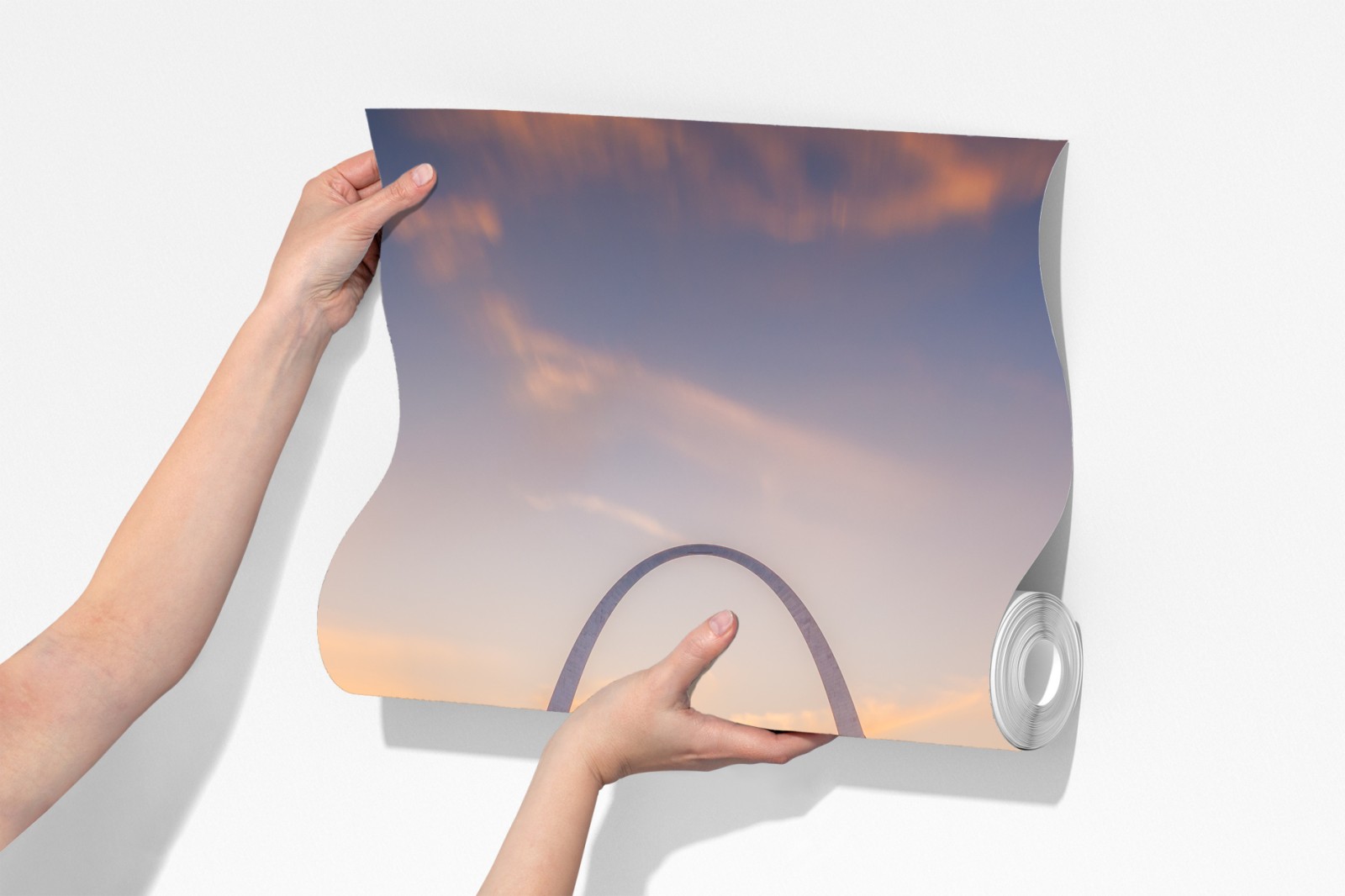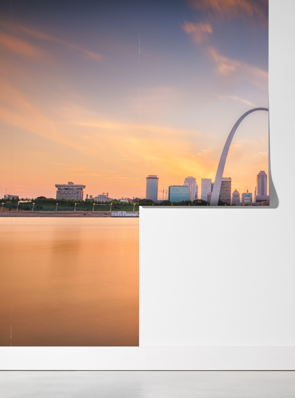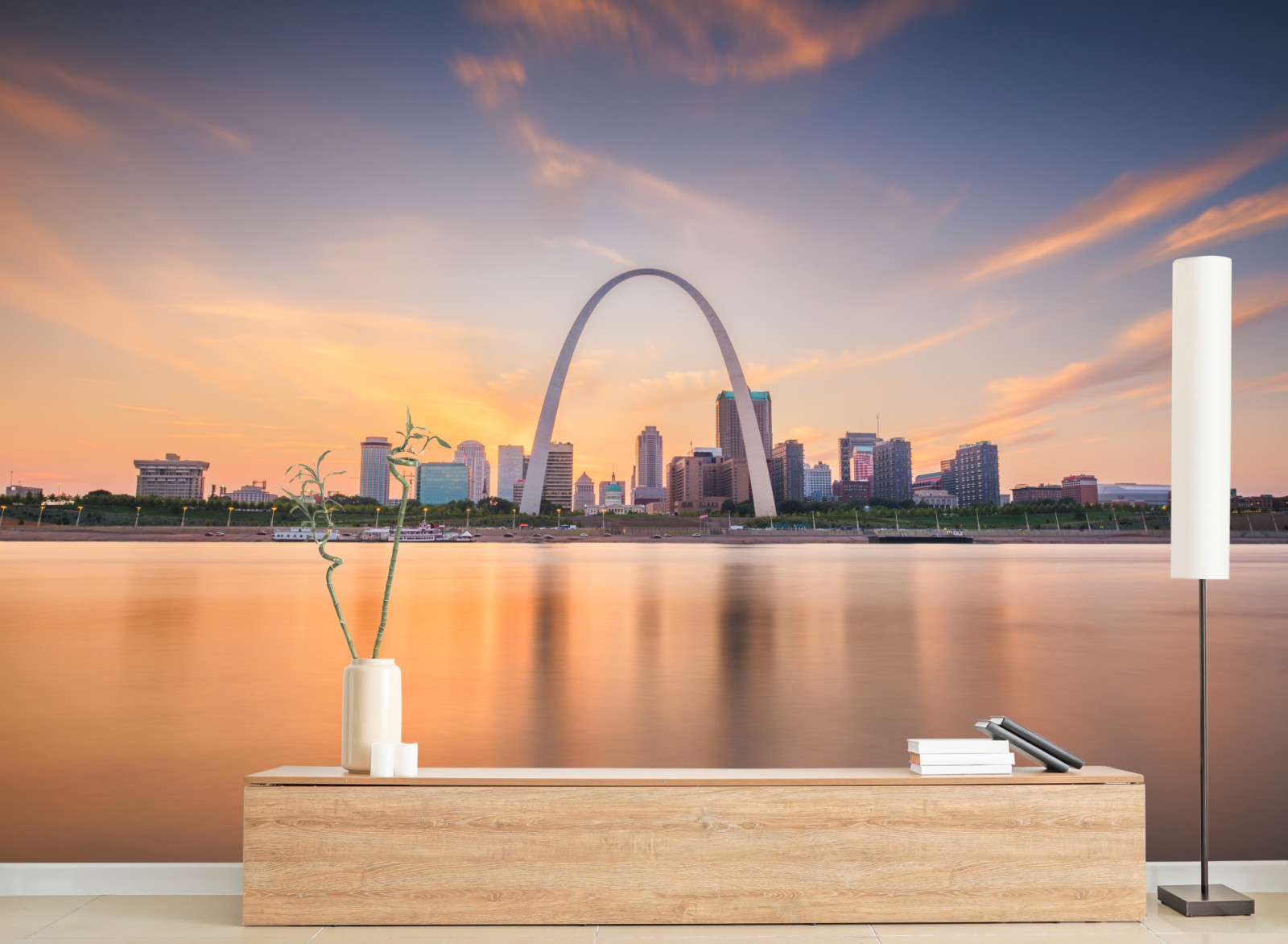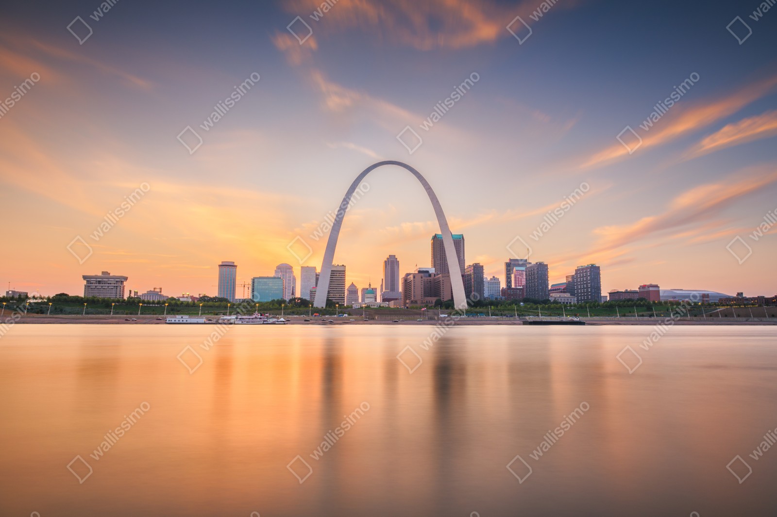 Uchwyć spokojne piękno St. Louis o zmierzchu dzięki temu ciepłemu zdjęciu miejskiego krajobrazu z odbiciem w rzece.