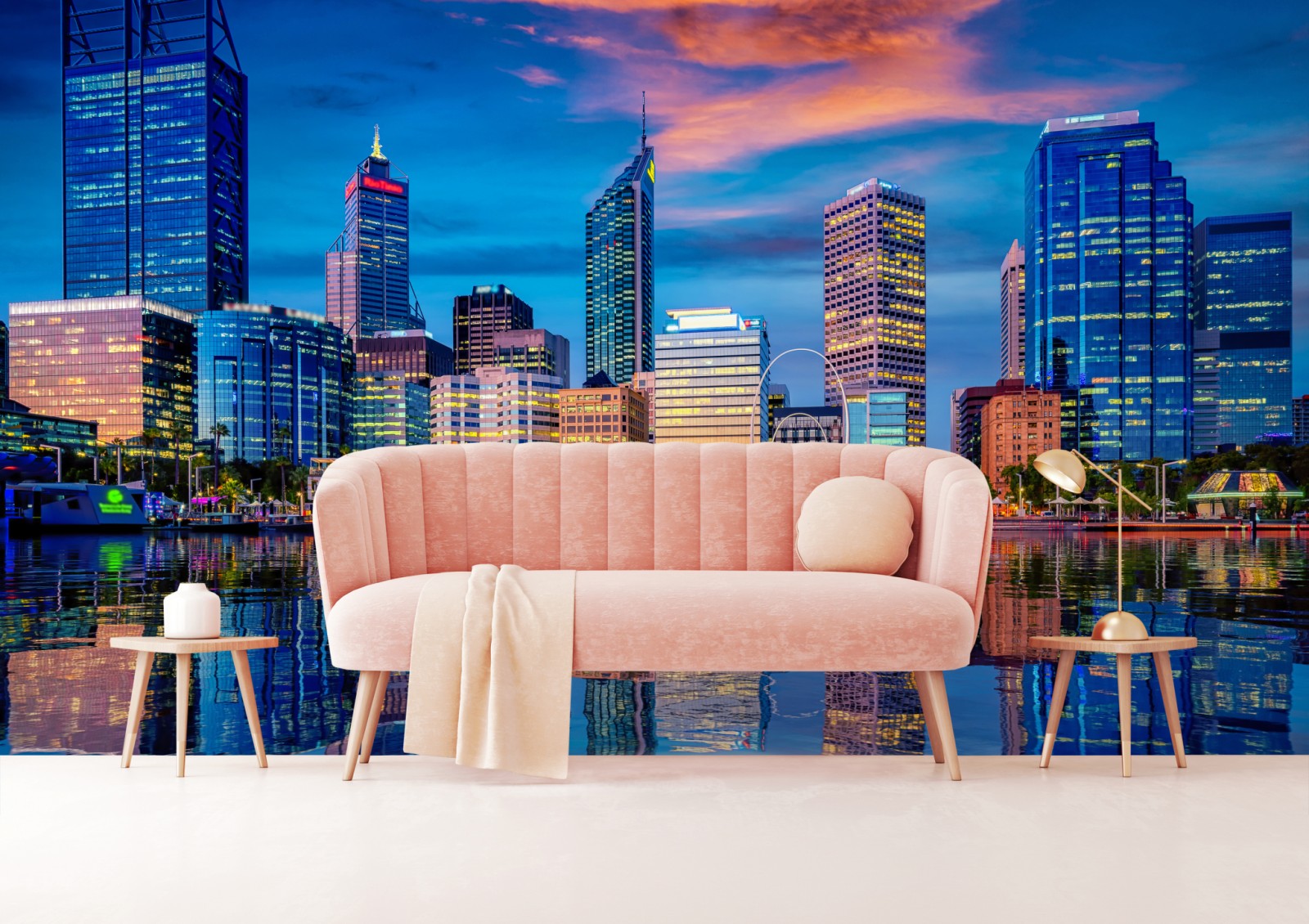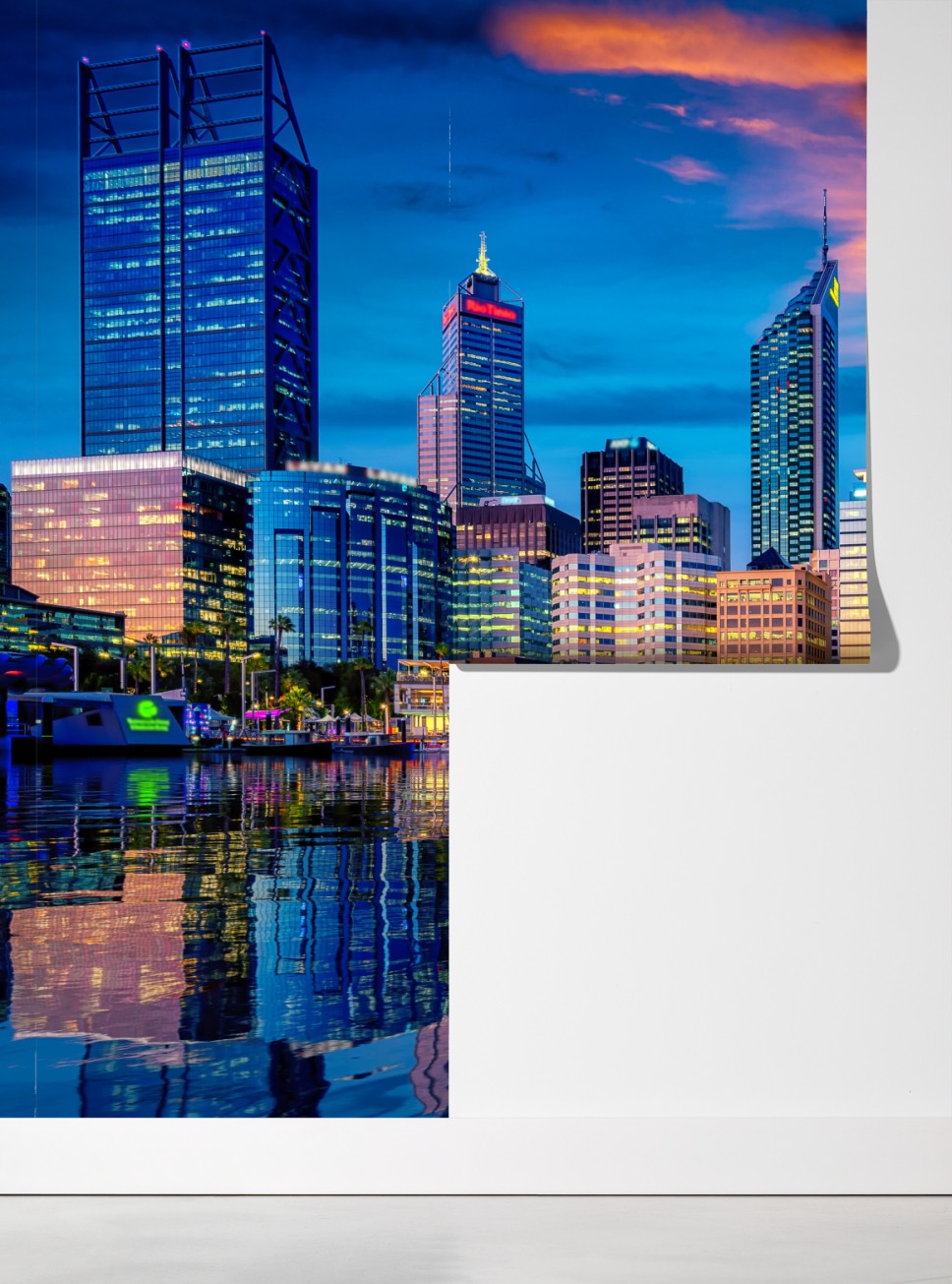Wprowadź żywiołowy klimat nadbrzeża Perth do swojego wnętrza dzięki tej barwnej panoramie miasta ze świetlistymi odbiciami.