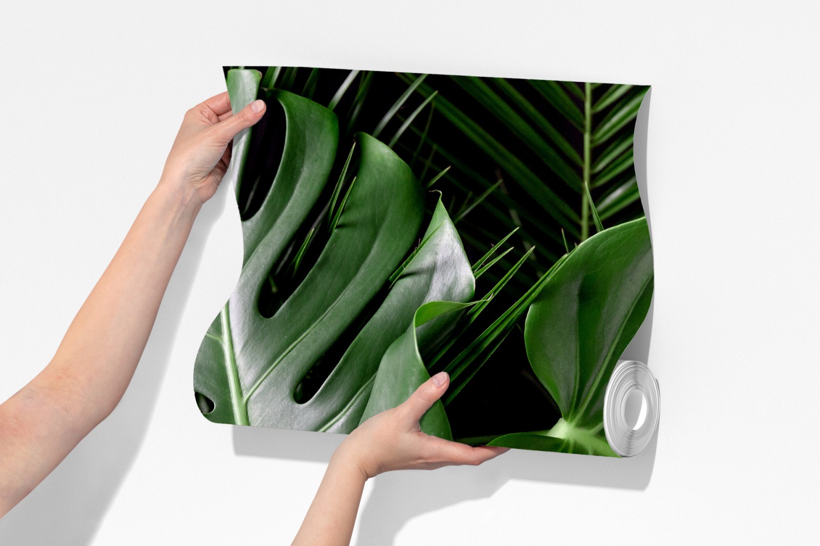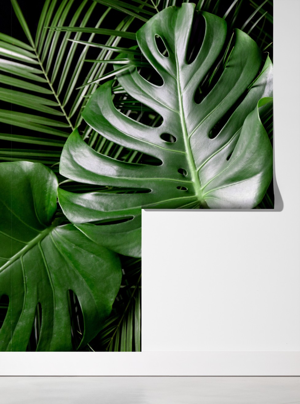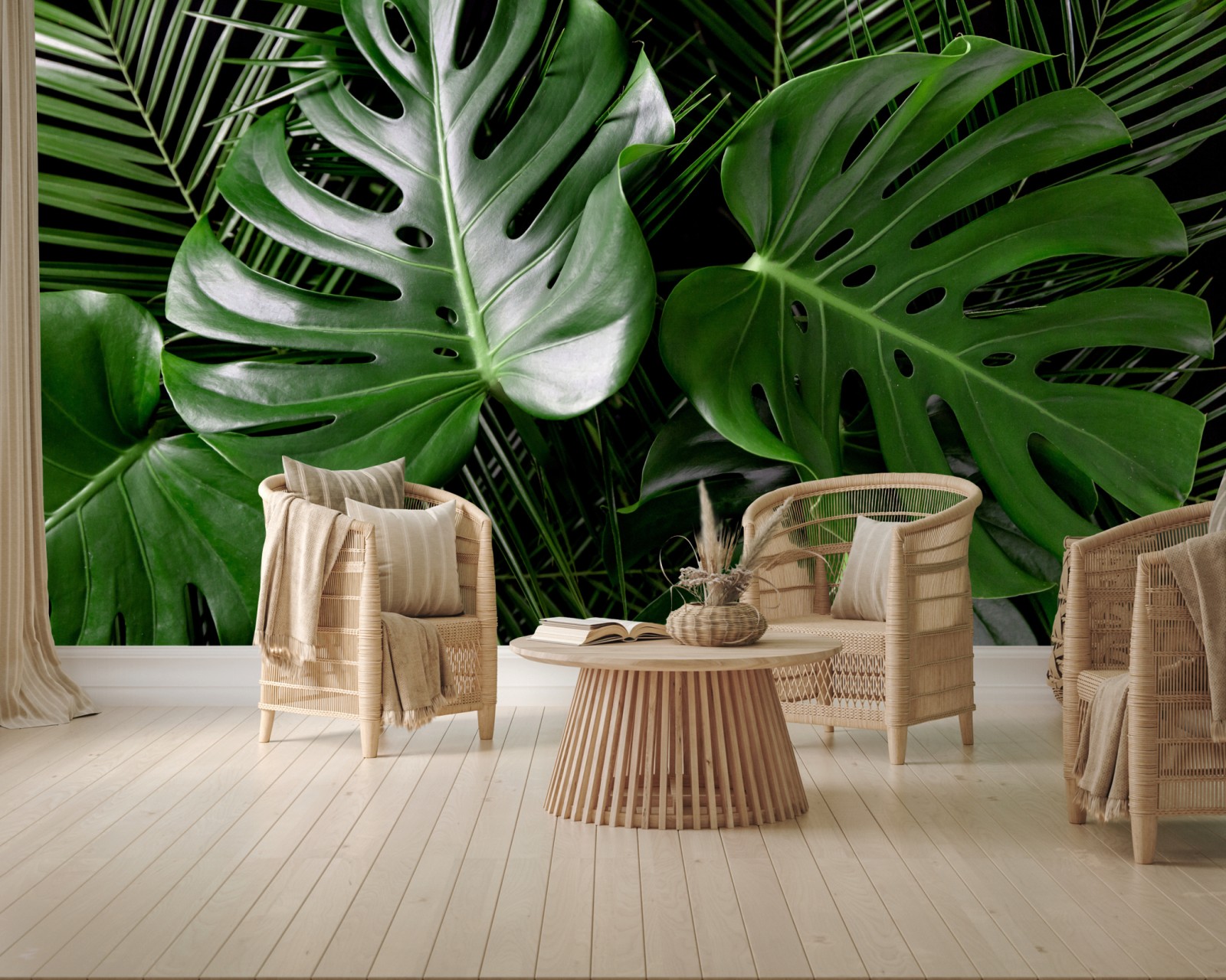 Wprowadź tropikalny klimat do wnętrza dzięki żywym liściom monstery i palm na ciemnym tle.