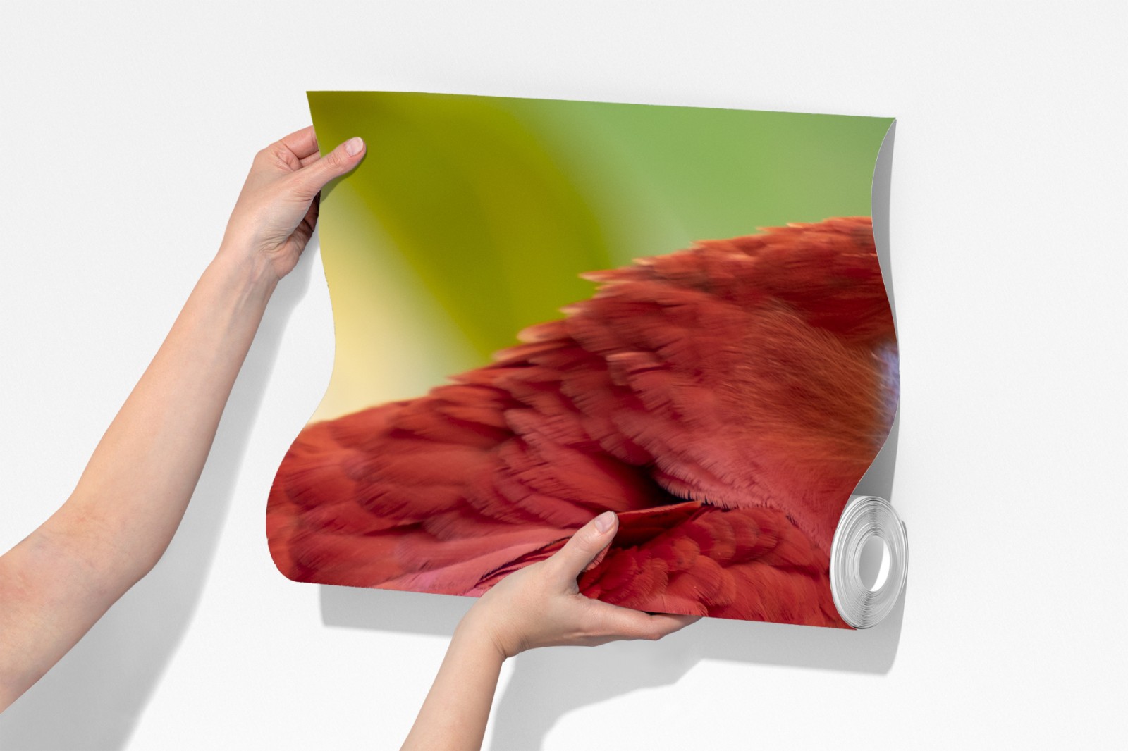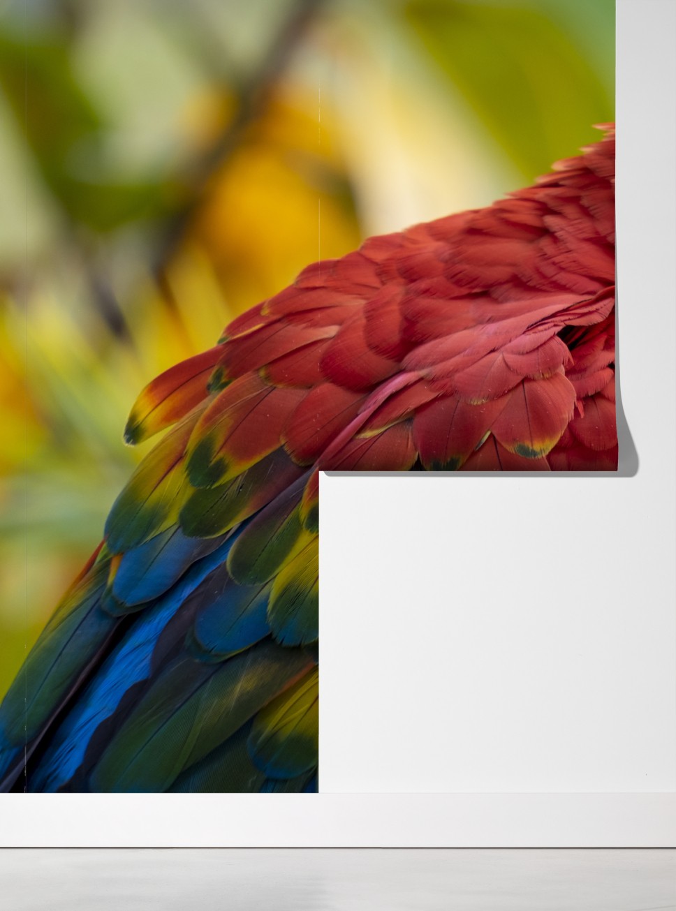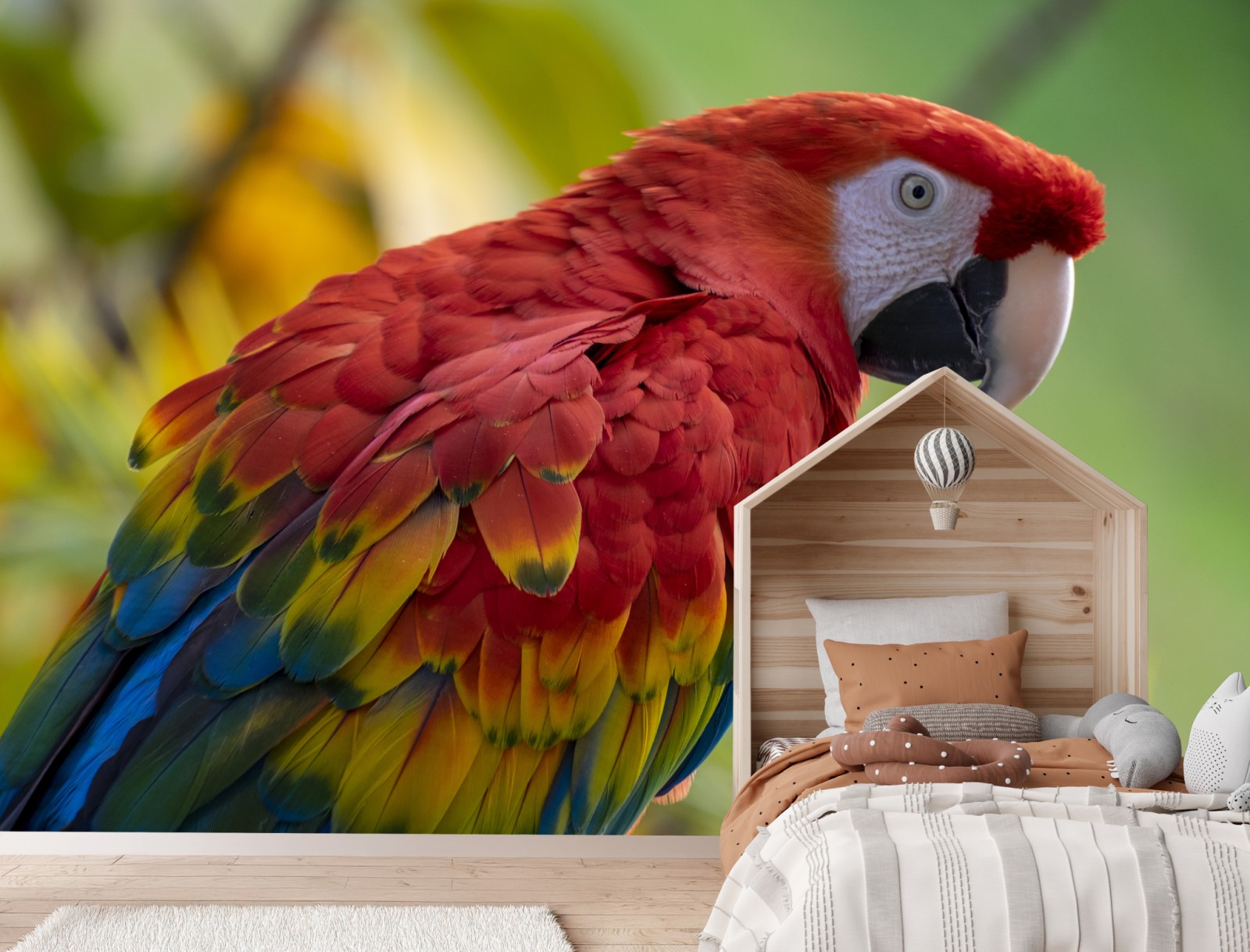 Wprowadź tropikalne kolory do wnętrza dzięki wyraźnemu portretowi ary szkarłatnej, ukazującemu żywe czerwienie, żółcie i błękity.