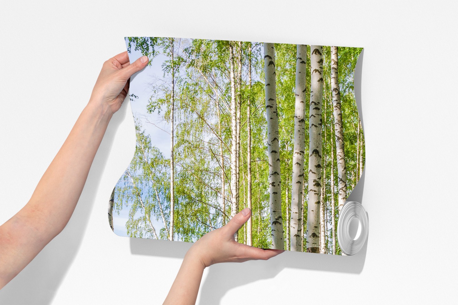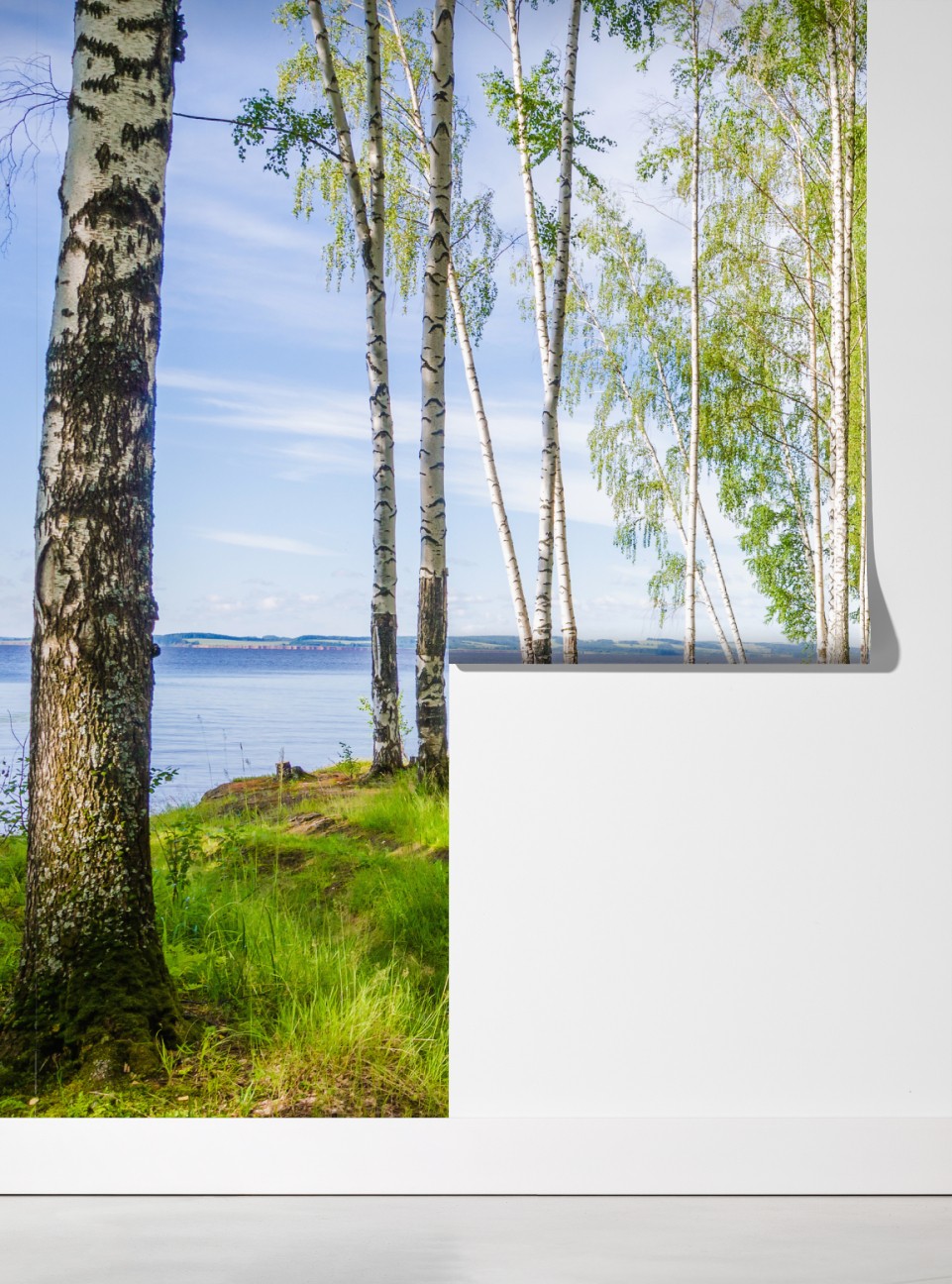 Dodaj do wnętrza spokój i naturalne piękno dzięki temu słonecznemu zagajnikowi brzozowemu nad wodą.