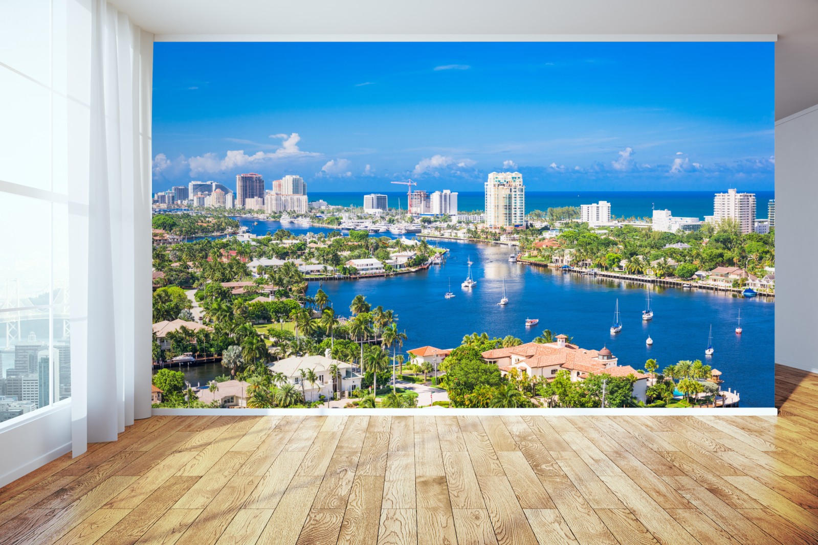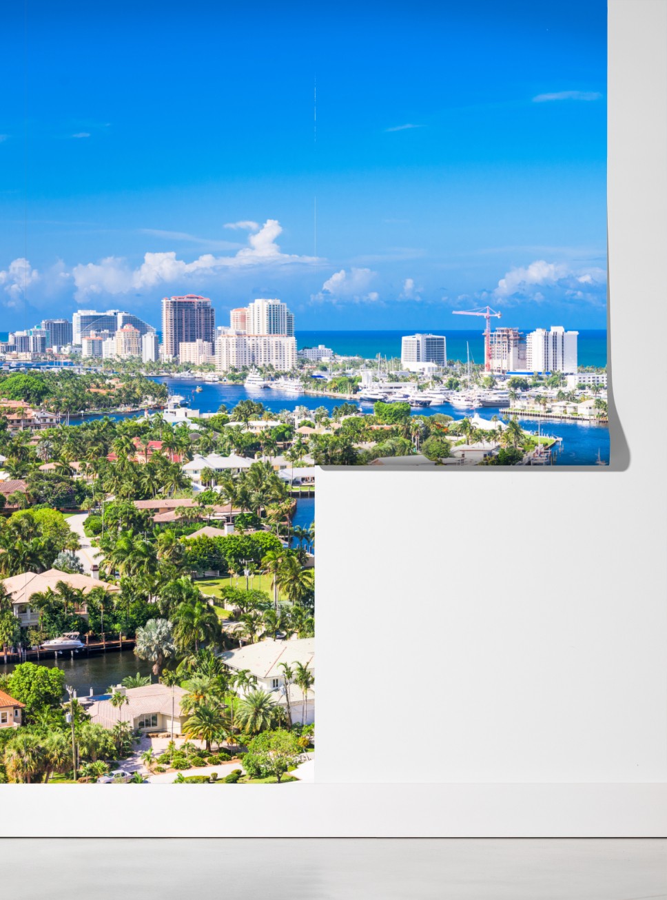 Dodaj nadmorskiego uroku do wnętrza dzięki żywej fotografii panoramicznej Fort Lauderdale z mariną i jachtami pod jasnym, niebieskim niebem.