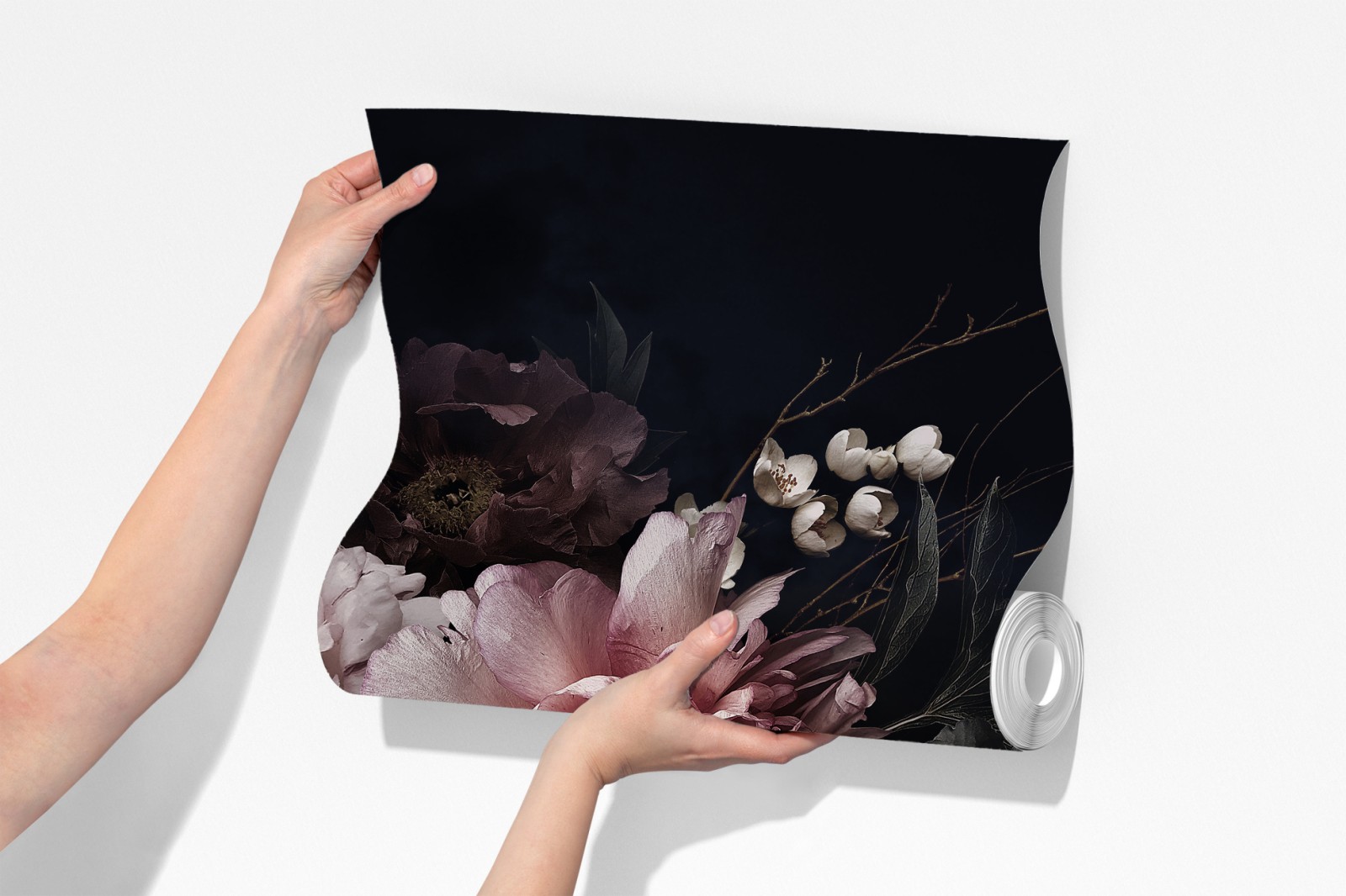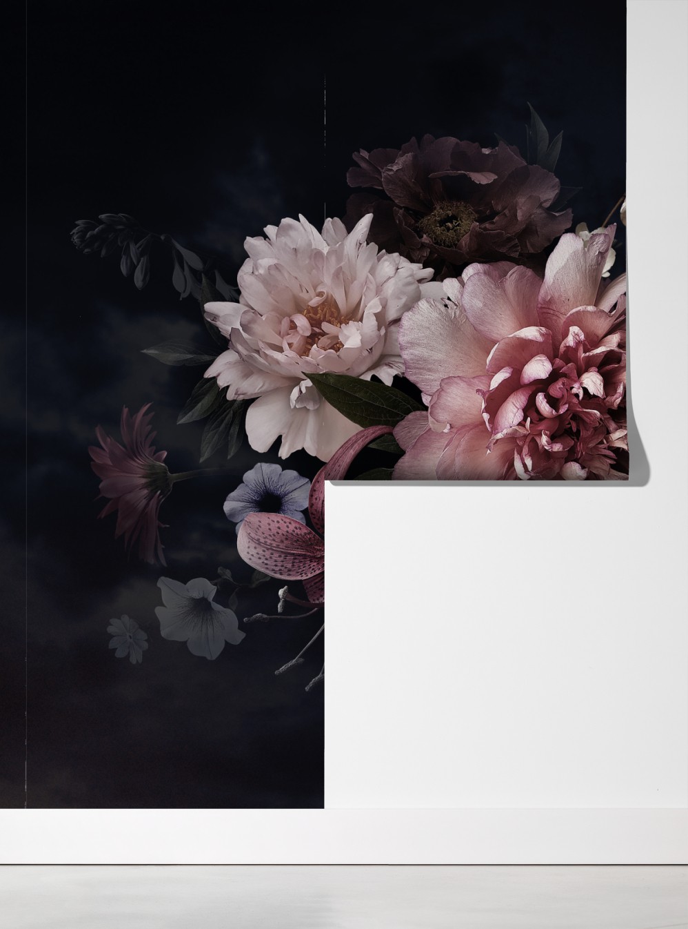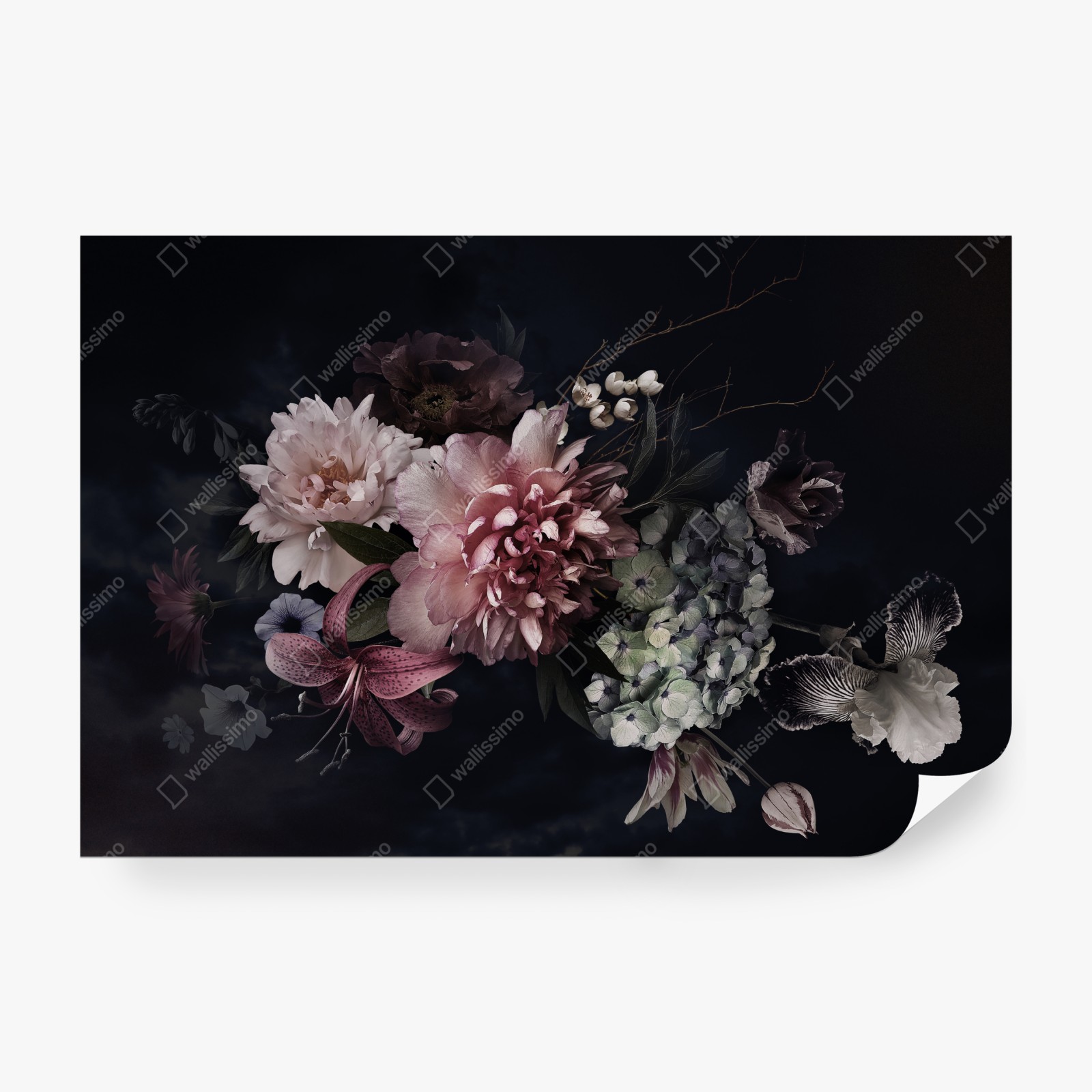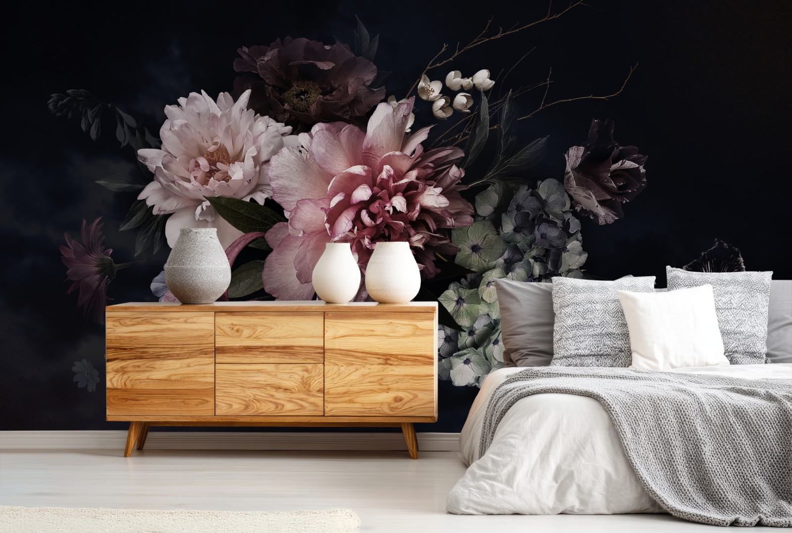 Dodaj elegancji wnętrzu dzięki tej mrocznej kompozycji kwiatowej z piwoniami i hortensjami w artystycznych odcieniach.