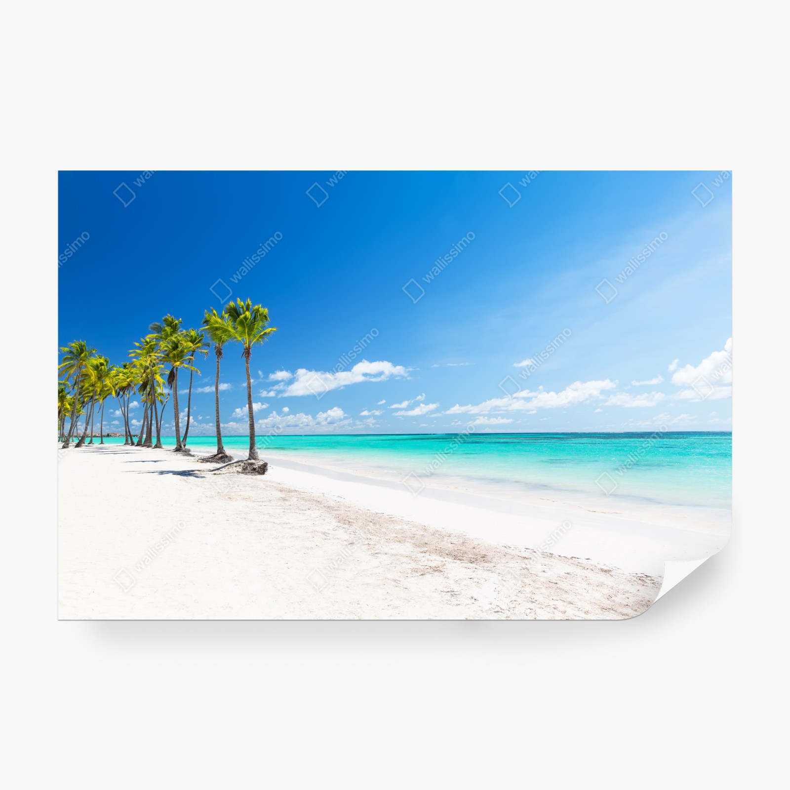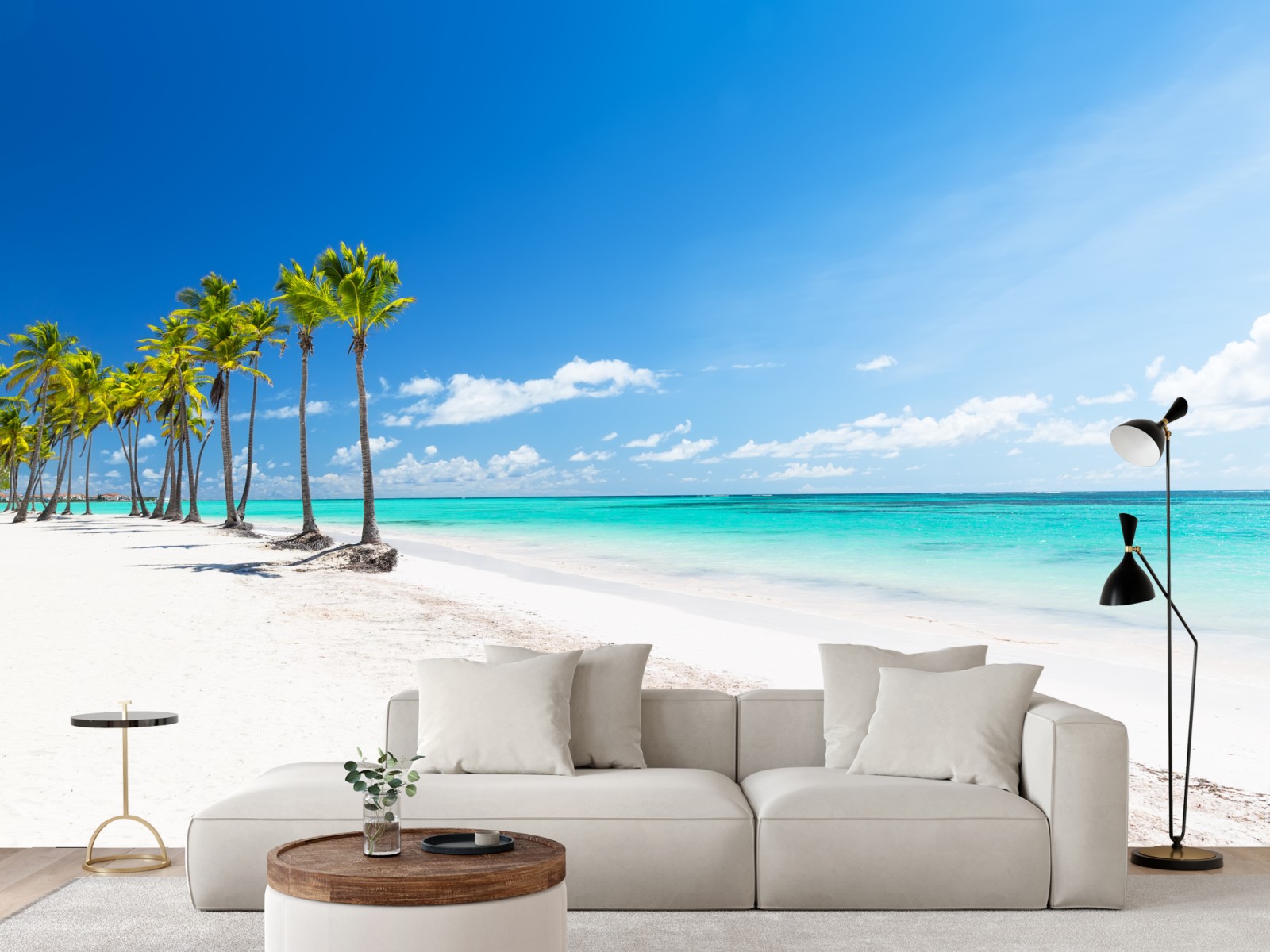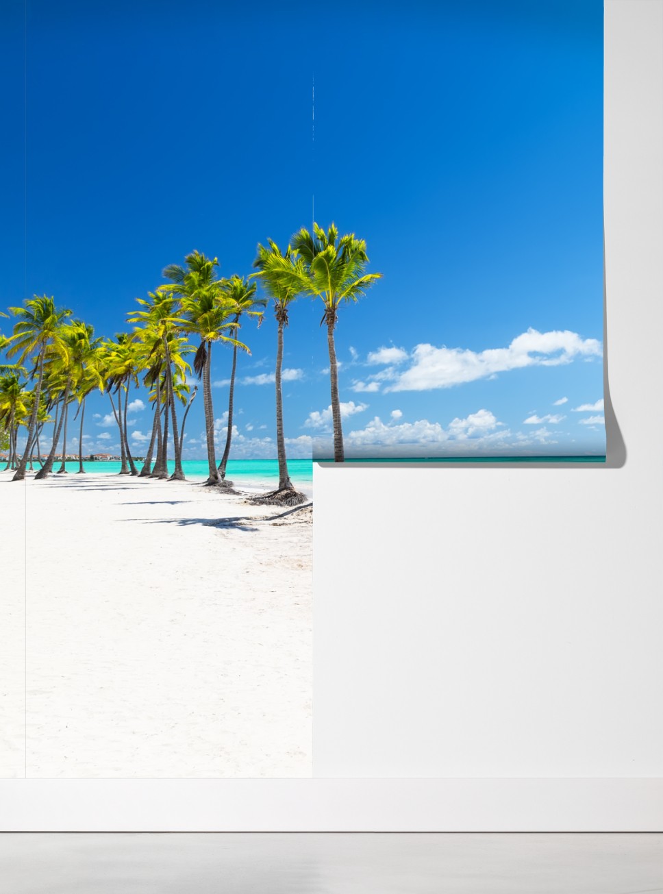 Wprowadź tropikalny spokój do wnętrza dzięki temu żywemu zdjęciu plaży z palmami, białym piaskiem i turkusową wodą.