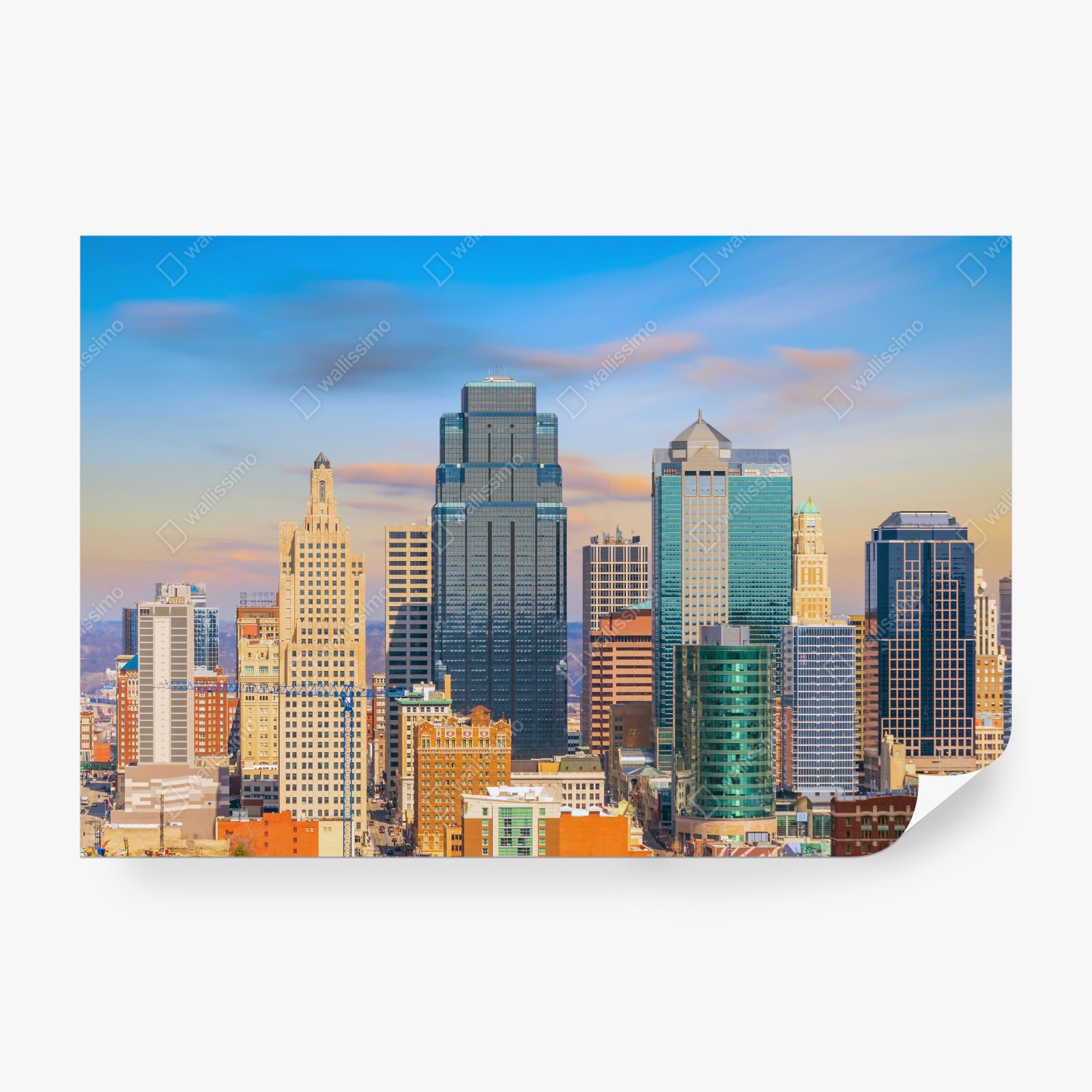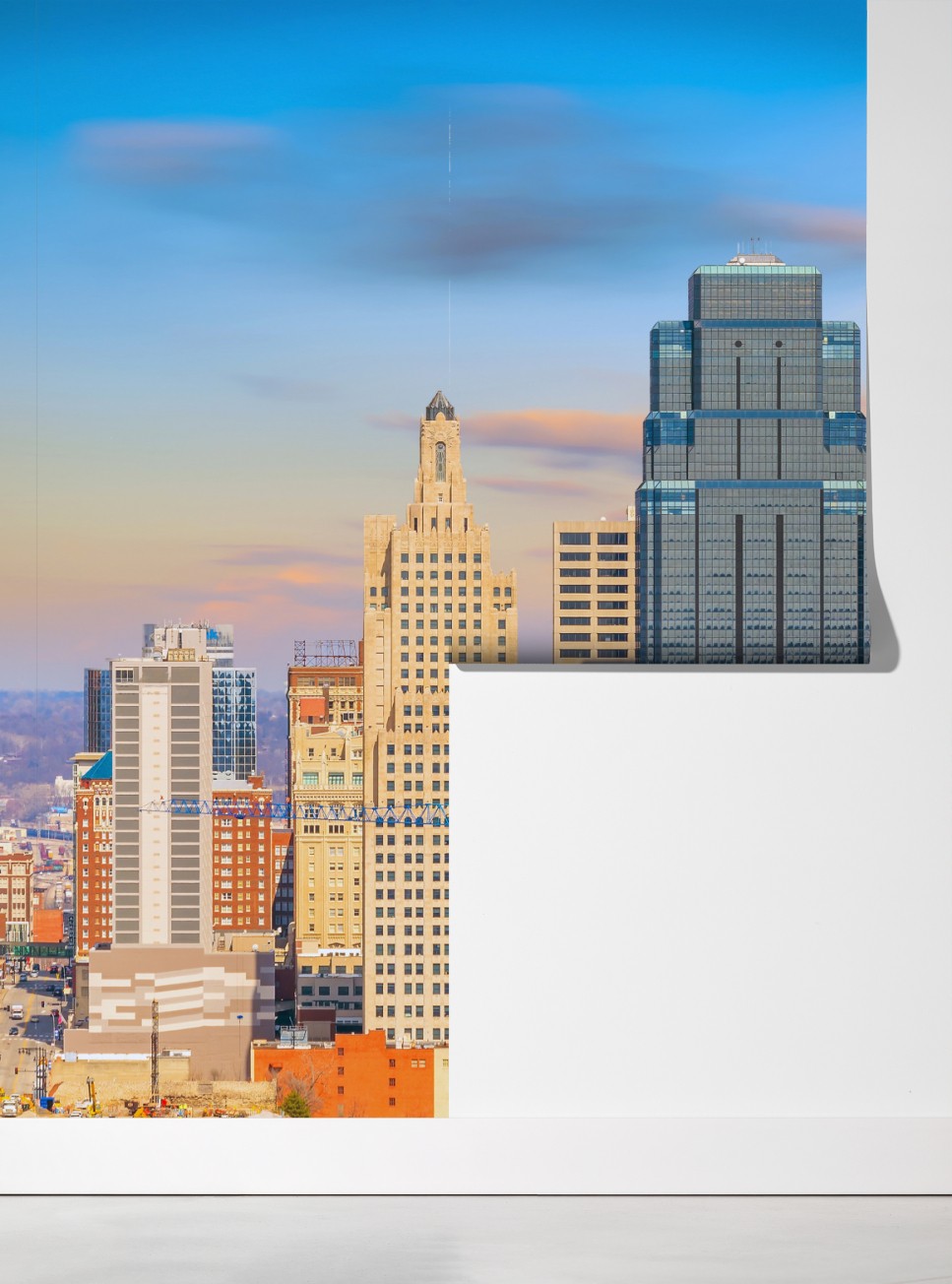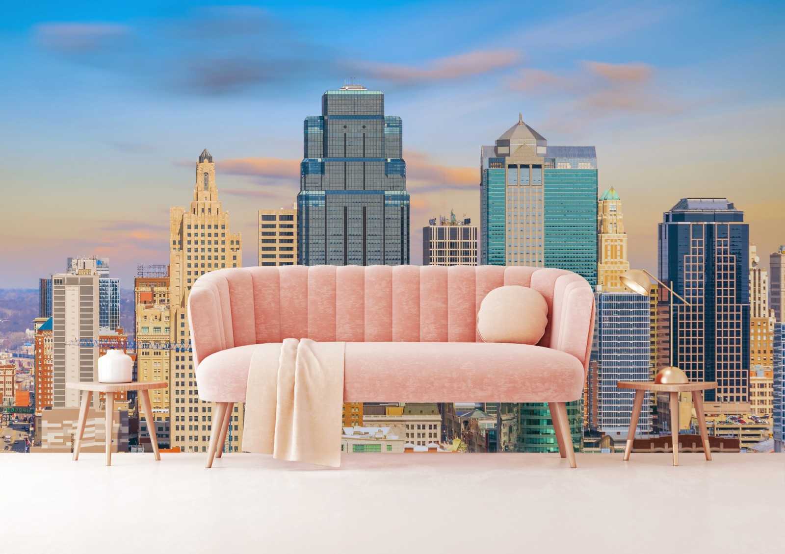 Przyciągający wzrok widok panoramy Kansas City o zachodzie słońca dodaje miejskiego charakteru każdemu wnętrzu.