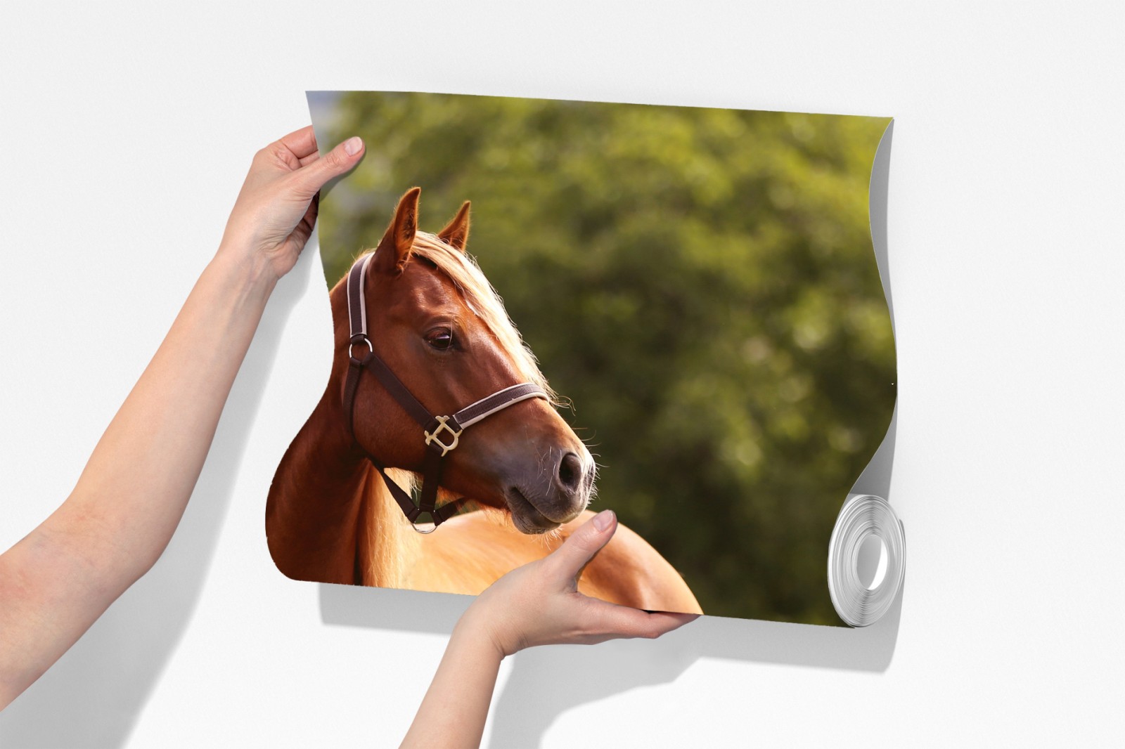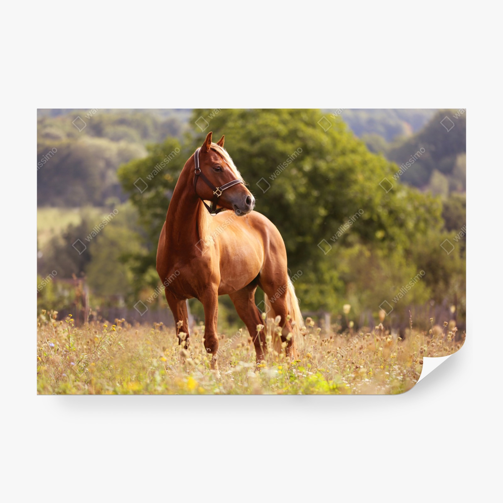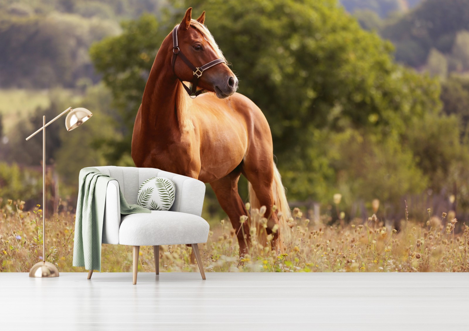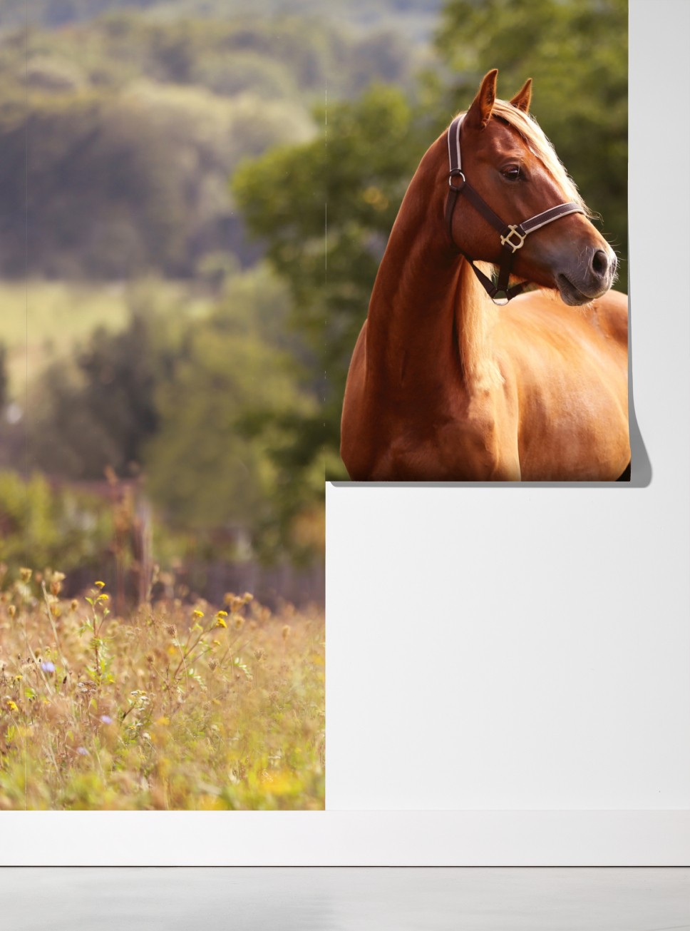 Dodaj wiejski urok do wnętrza dzięki majestatycznemu kasztanowemu koniowi stojącemu na słonecznej łące.