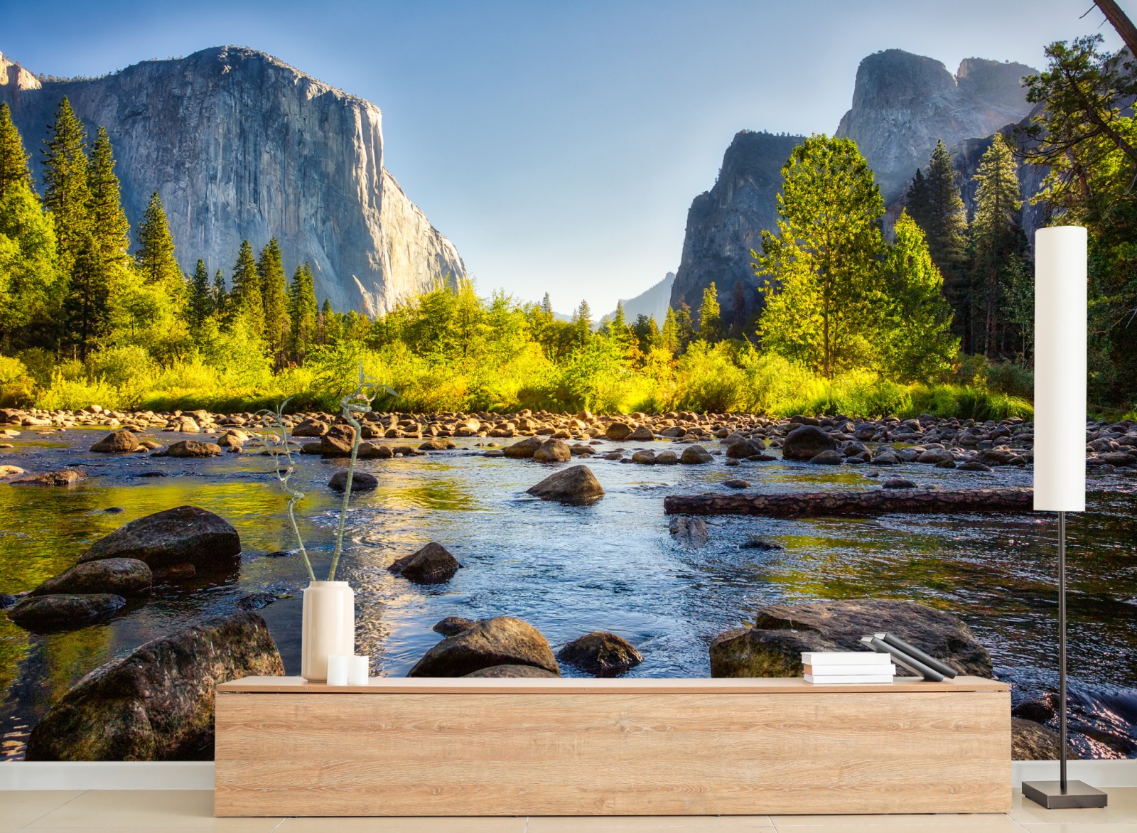 Wprowadź do wnętrza spokojny widok górskiej rzeki przedstawiony w żywych barwach z odbiciami i słonecznym światłem.
