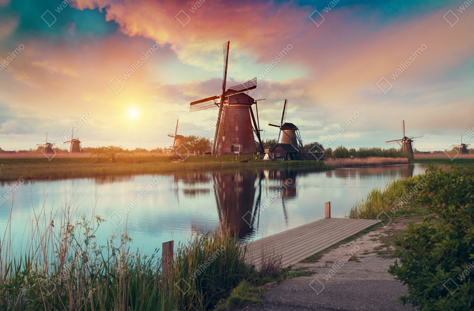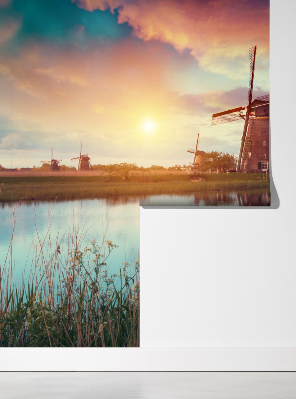 Poczuj spokój wiejskiego krajobrazu o zachodzie słońca z odbiciami na wodzie i klasycznymi wiatrakami.