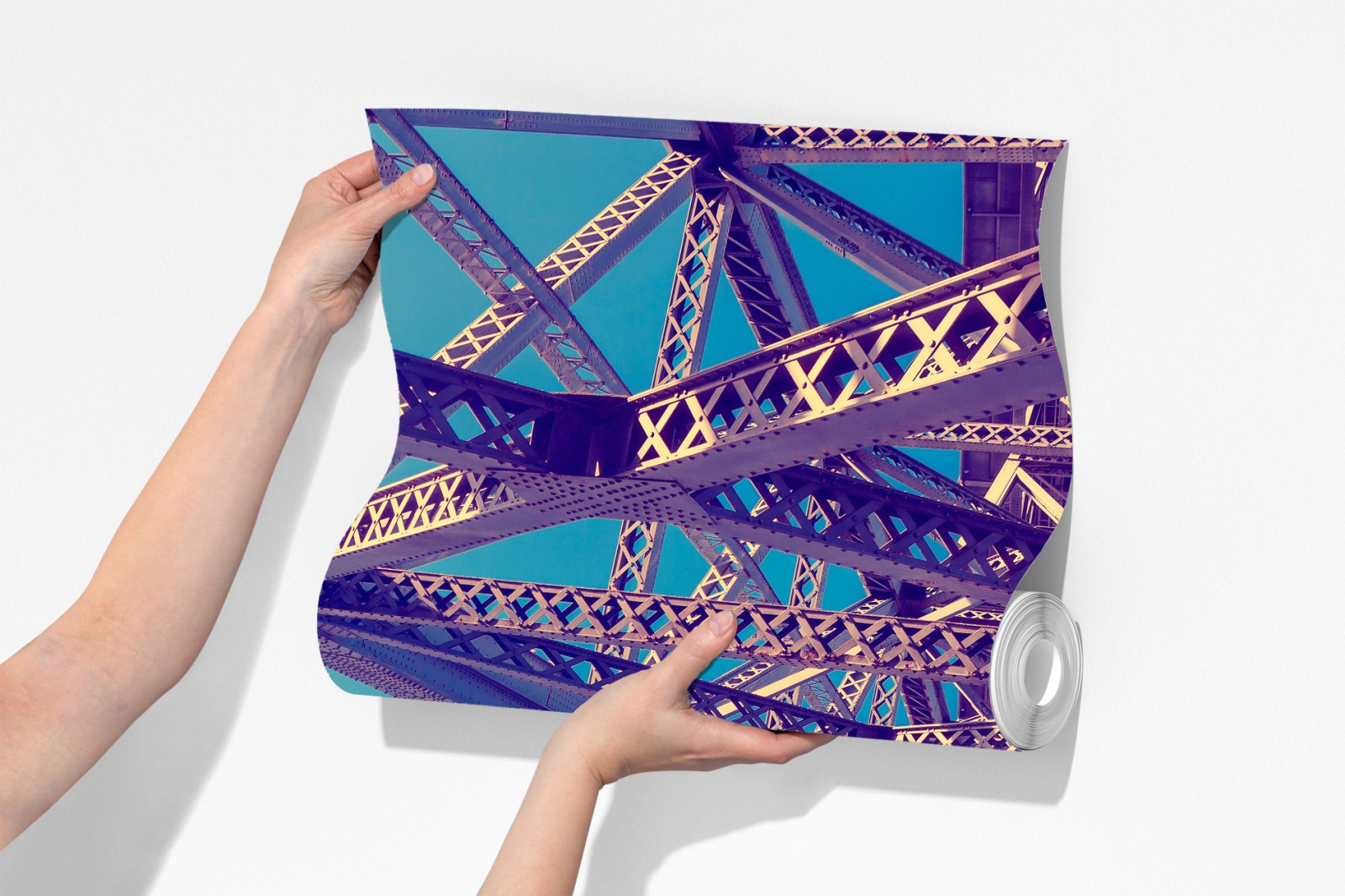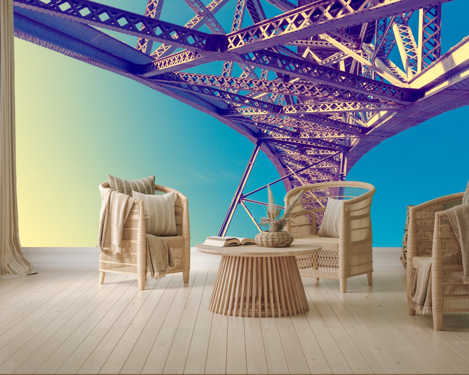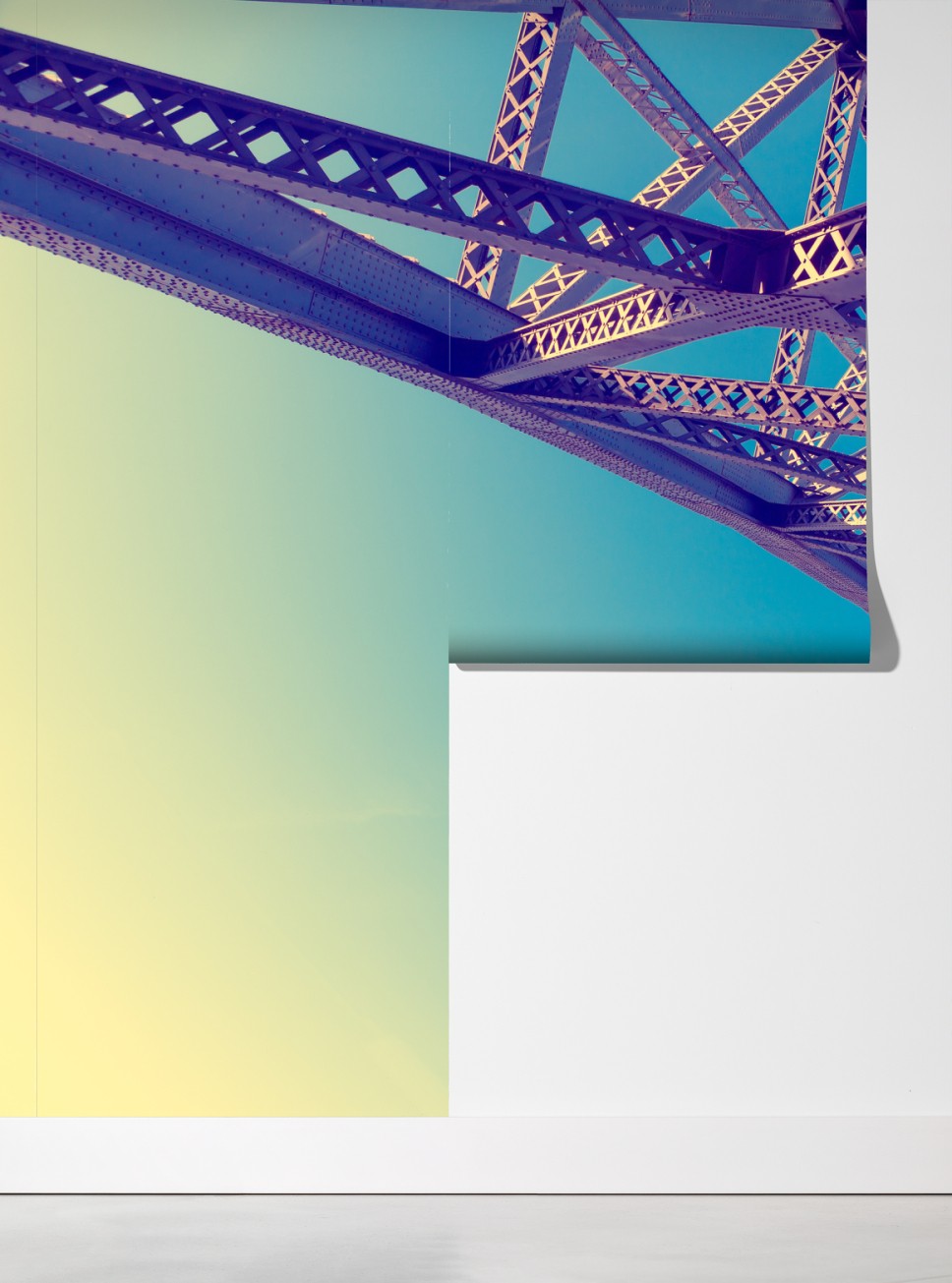 Dodaj wnętrzu nowoczesny akcent dzięki abstrakcyjnej perspektywie stalowej konstrukcji mostu w wyrazistych turkusowych i ciepłych tonach.