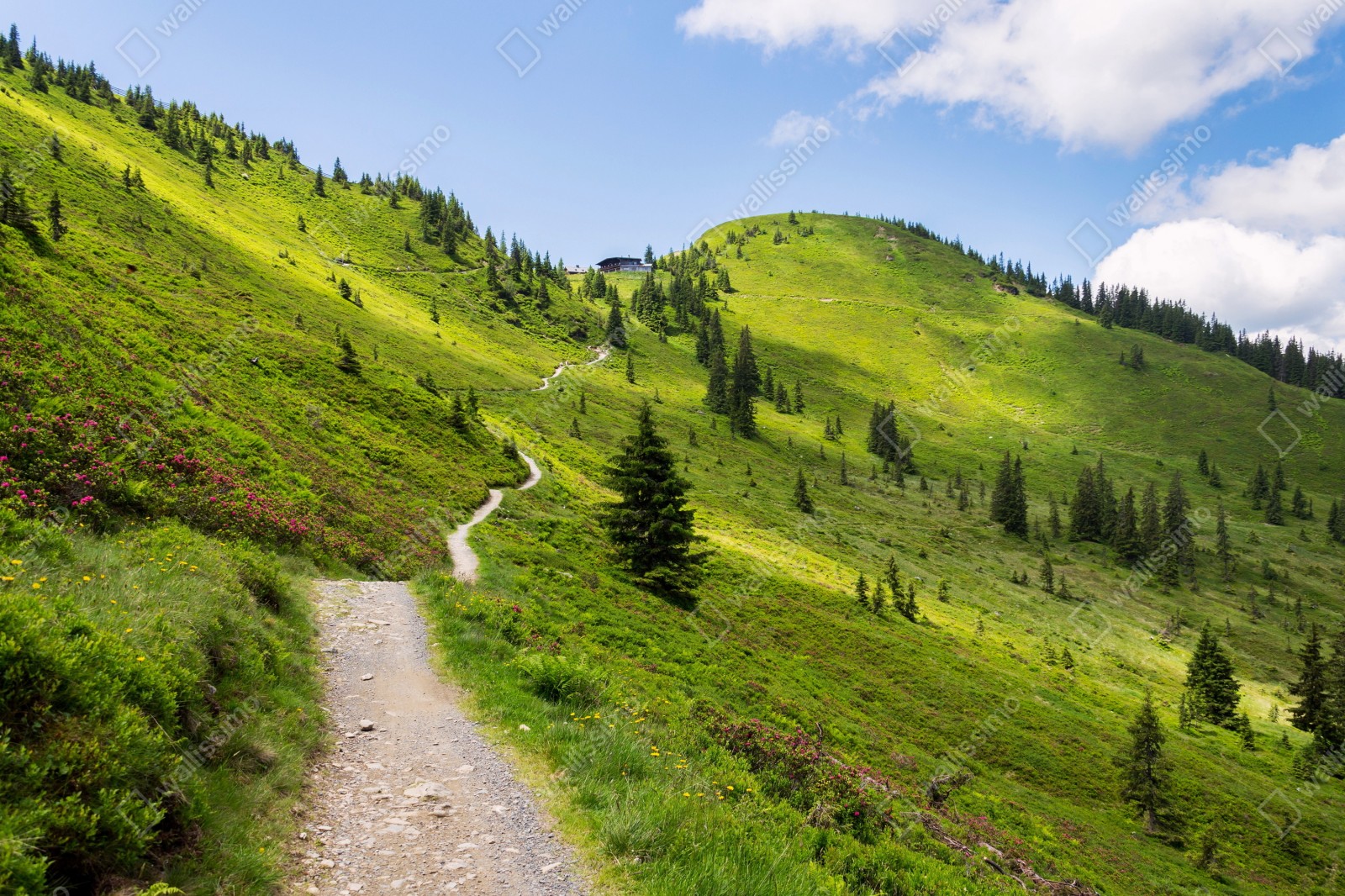 Fototapeta Słoneczna górska ścieżka przez zieloną łąkę