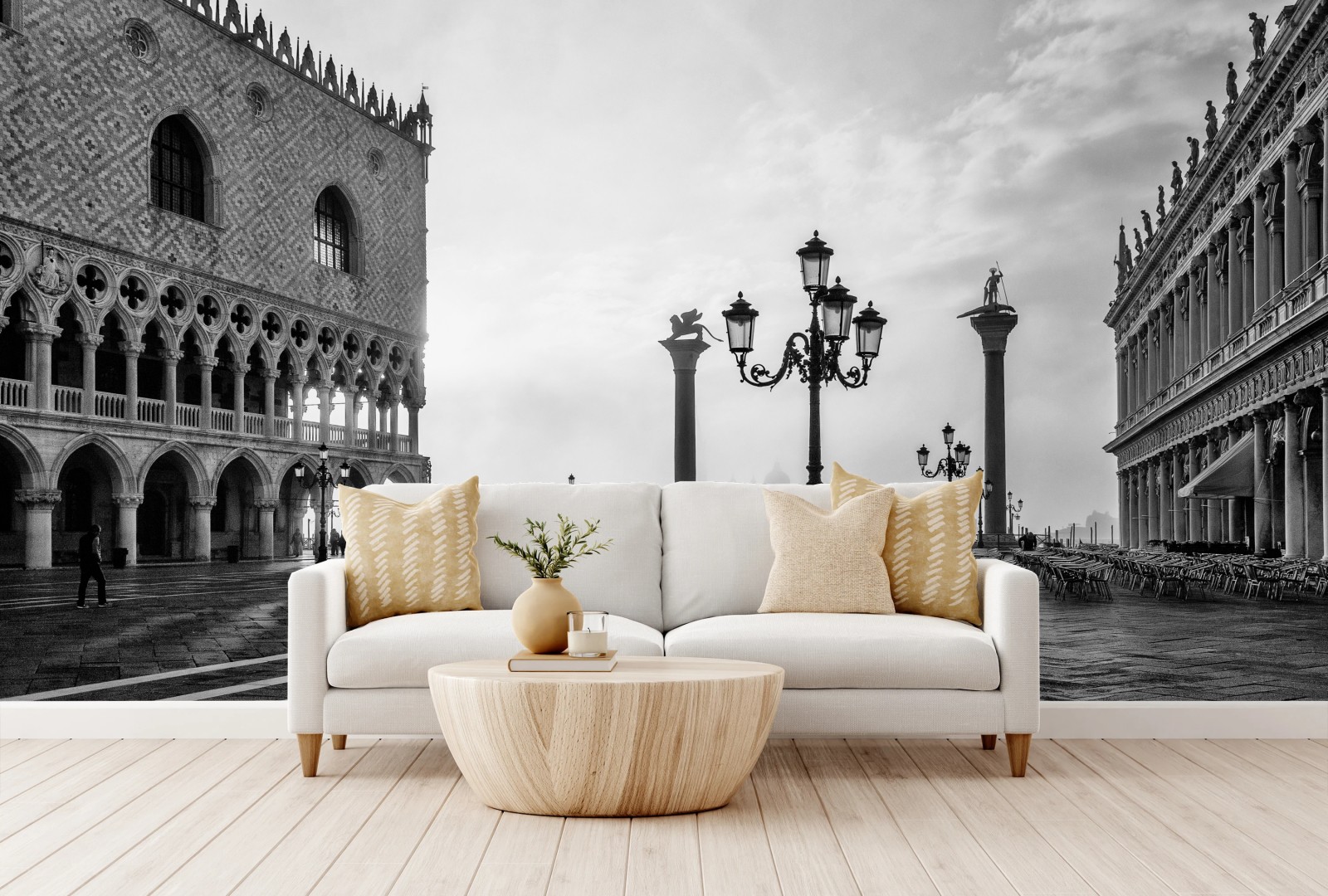 - zabytki, podróże, architektura, czarno-białe, wenecja, miasto, pejzaż miejski, kolumny, plac, kawiarnie