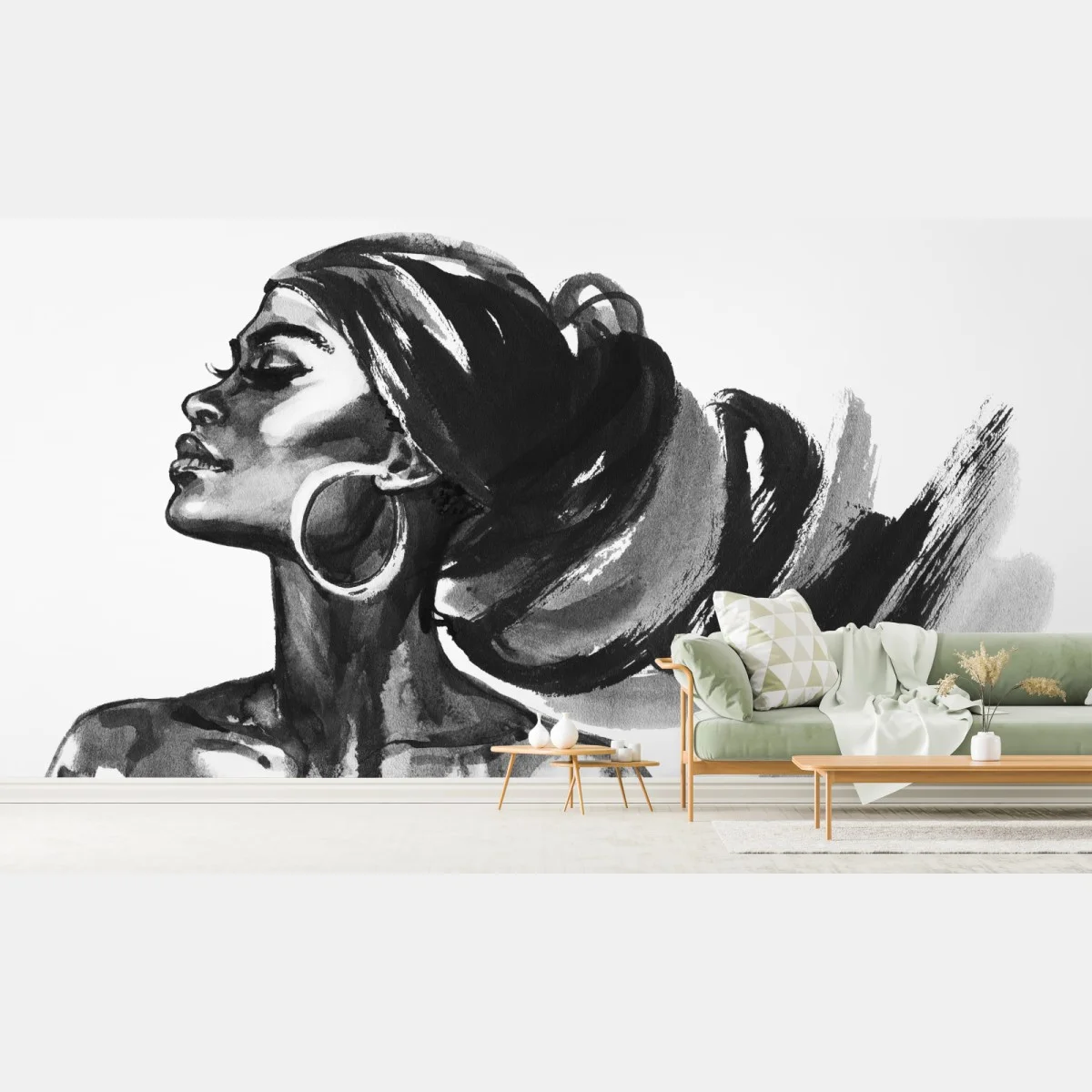 - minimalistyczny, czarno-białe, elegancki, akwarela, portret, afrykańska kobieta, piękno, ilustracja mody, turban, kolczyki koła