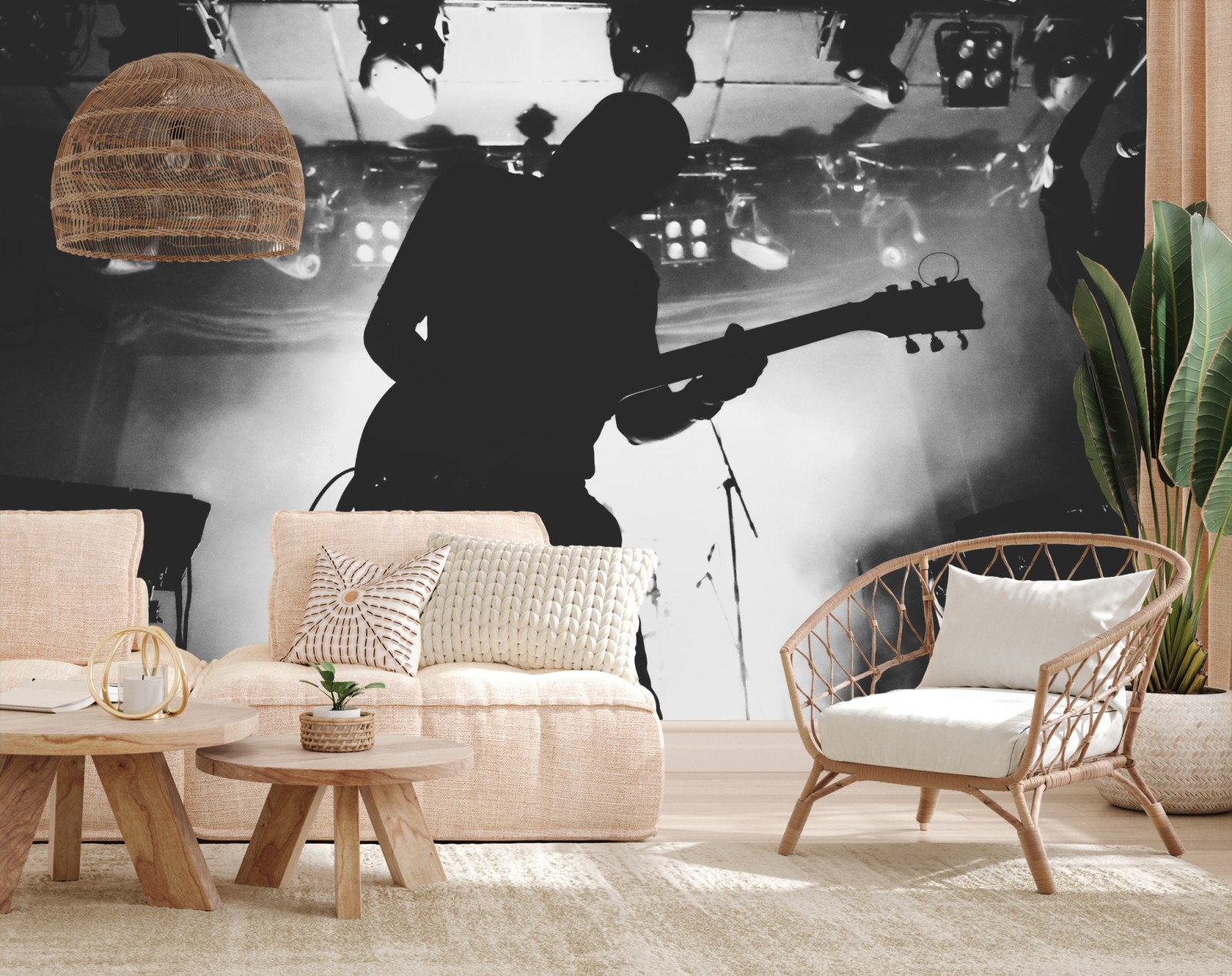 Dodaj energii swojej ścianie dzięki tej wyrazistej czarno-białej sylwetce gitarzysty, idealnej do stworzenia mocnej atmosfery.