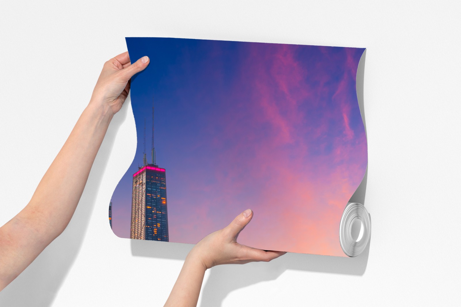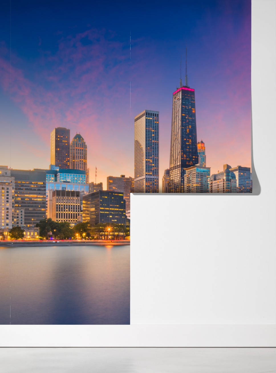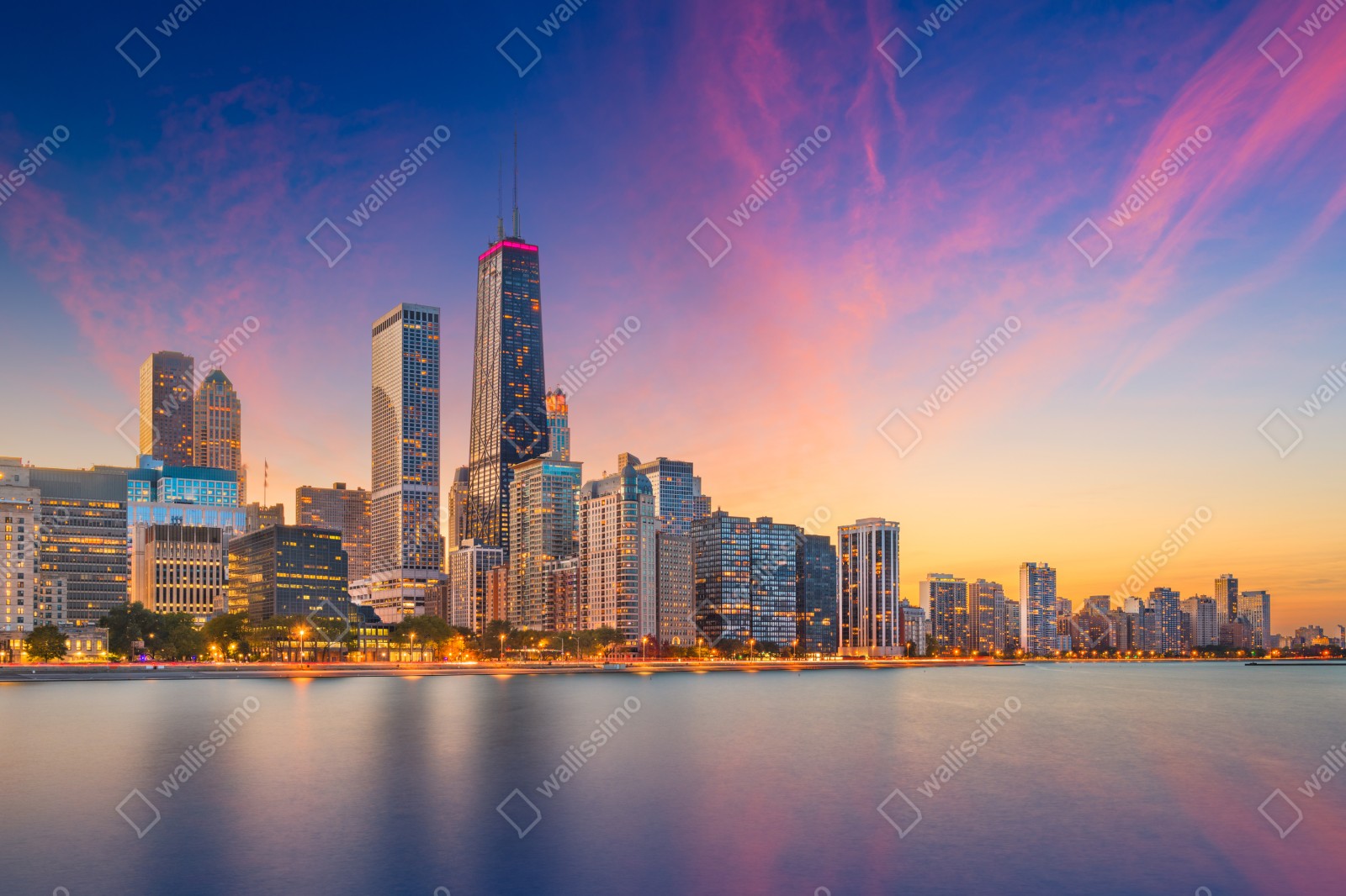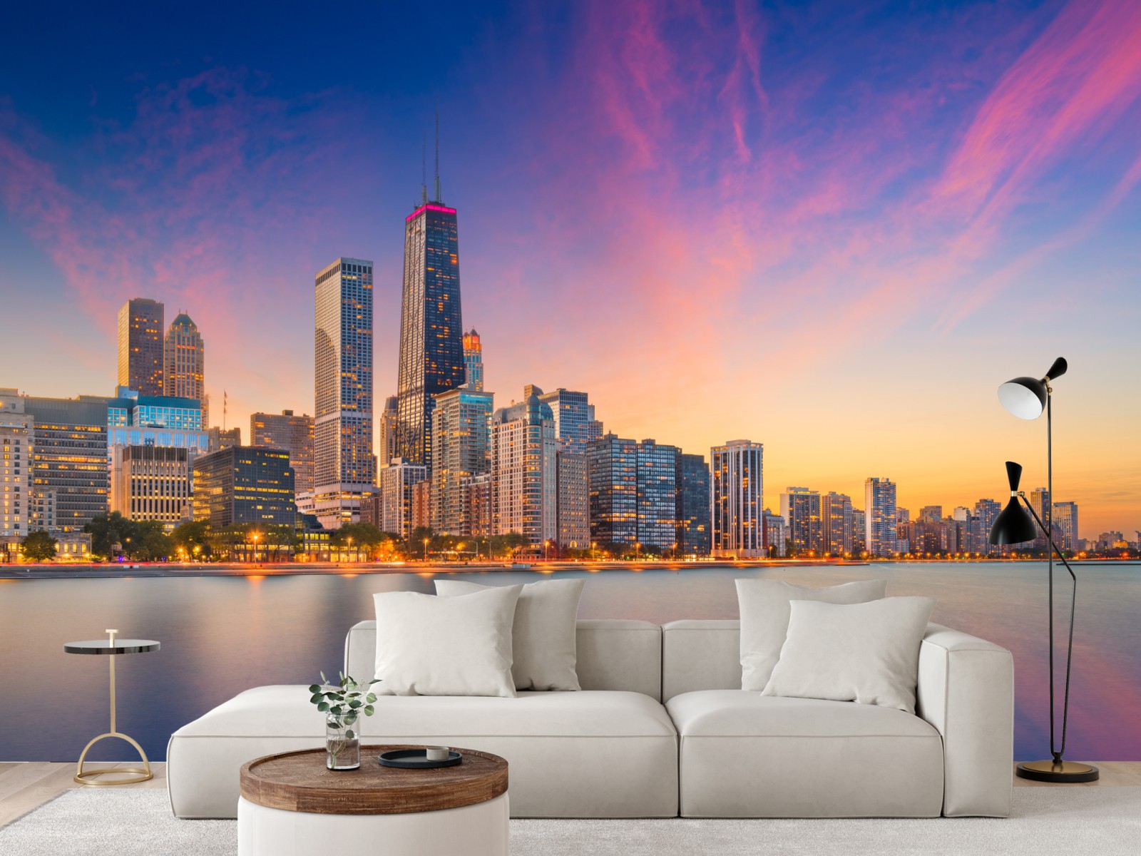 Wprowadź tętniącą życiem panoramę Chicago o zmierzchu do swojego wnętrza, z ciepłymi barwami nieba i spokojnymi odbiciami na jeziorze.