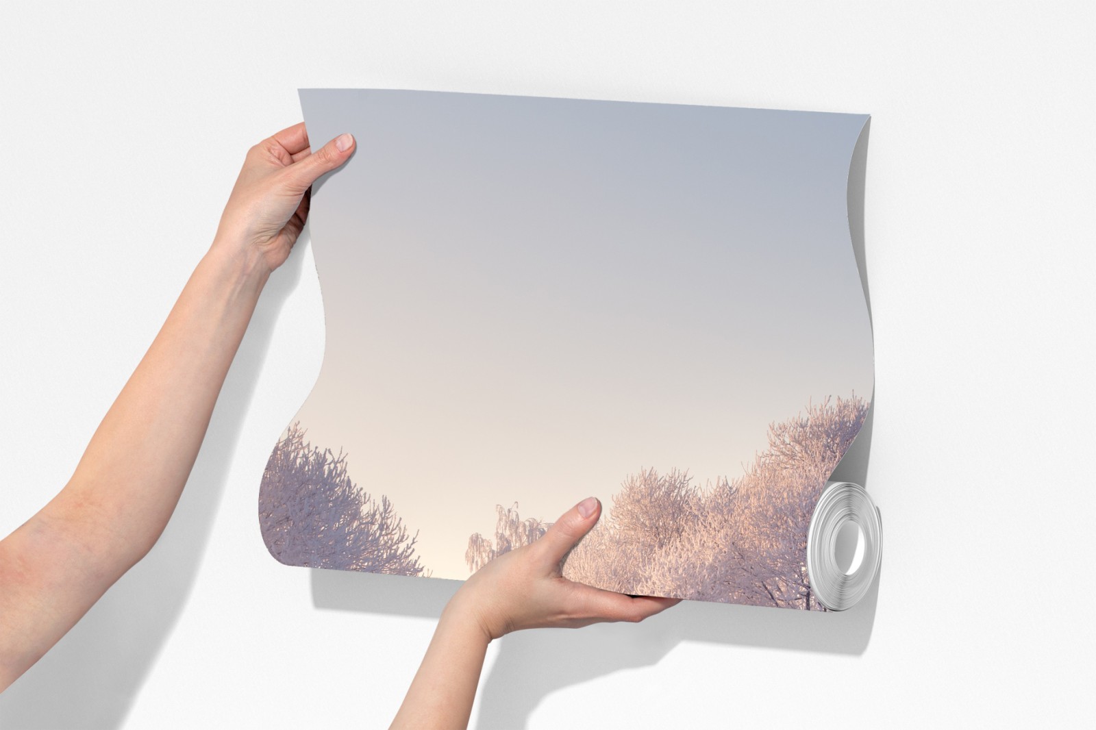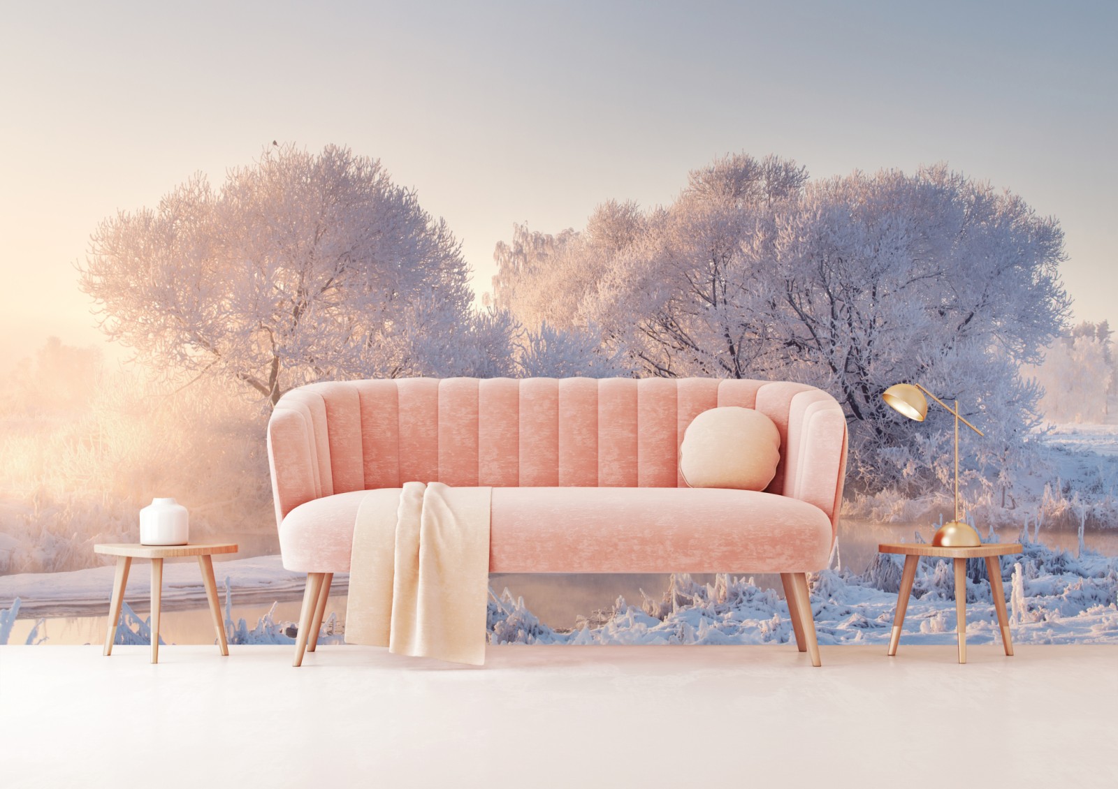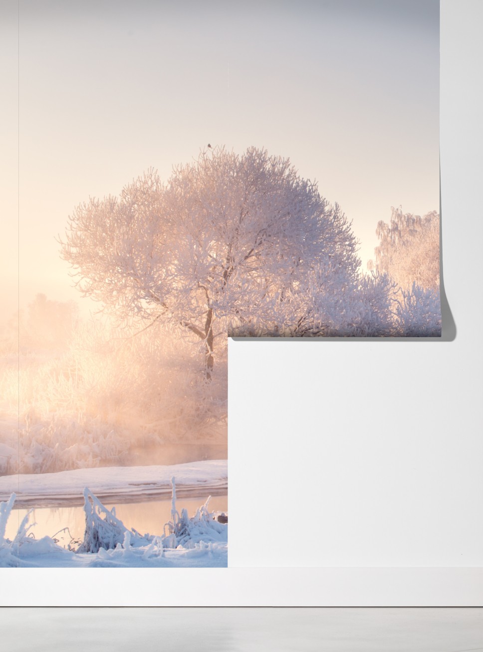 Wprowadź do wnętrza spokojną zimową atmosferę dzięki temu pastelowemu pejzażowi o świcie ze szronem i delikatną mgłą.