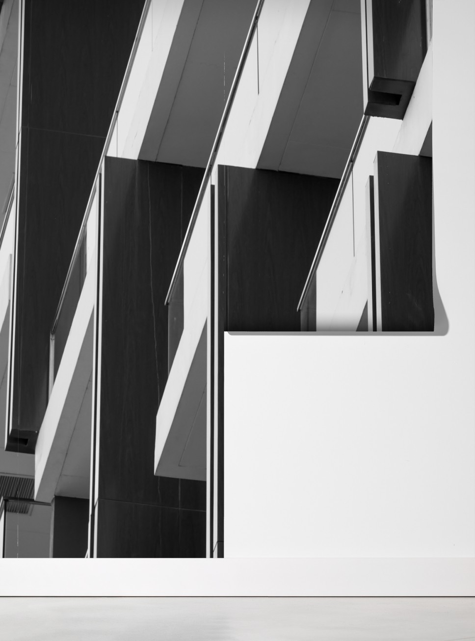 Odważna kompozycja nowoczesnych balkonów w uderzającej skali szarości, idealna do współczesnych wnętrz.