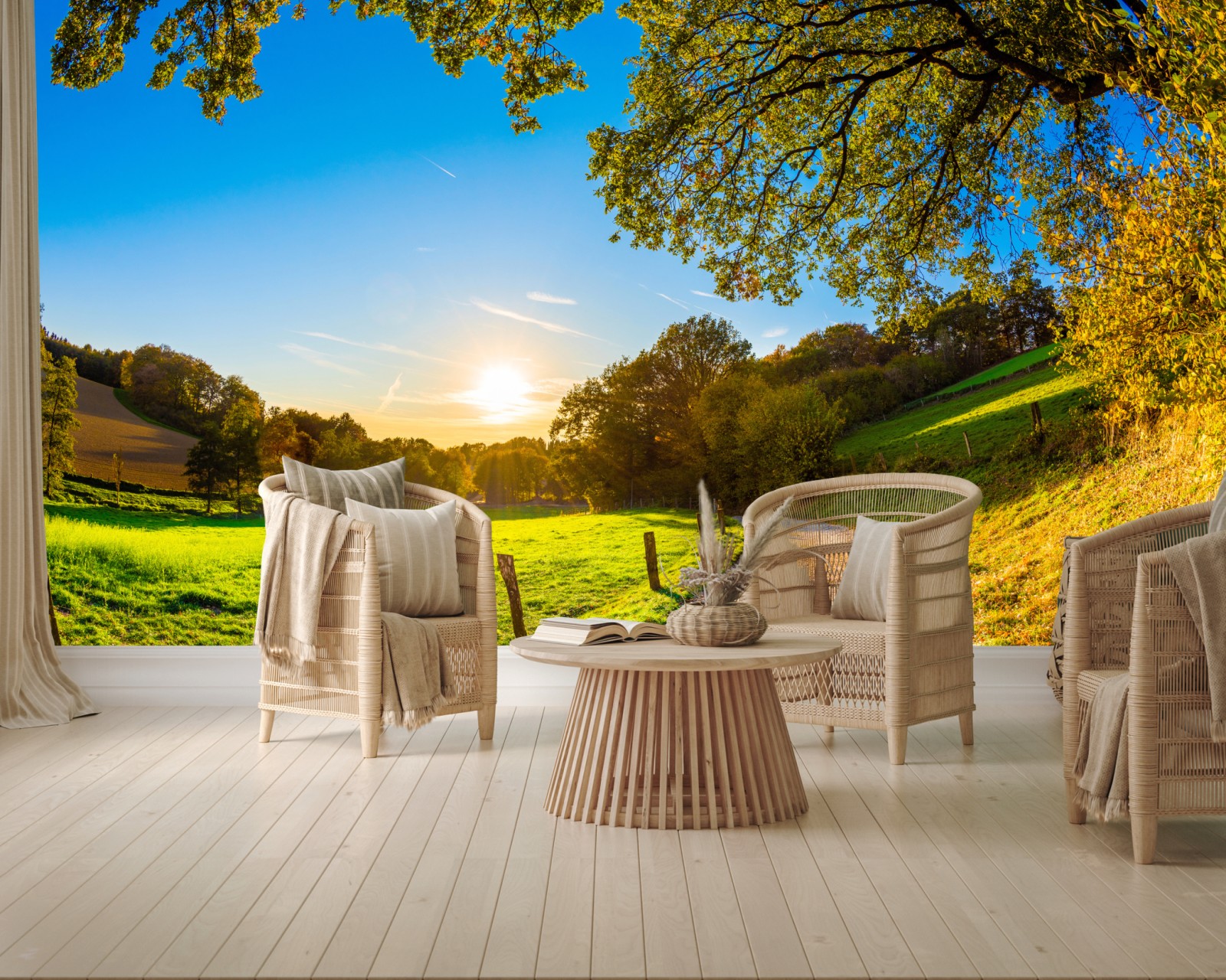 Wprowadź spokój słonecznej łąki do wnętrza dzięki temu żywemu obrazowi z wijącą się drogą i złotym zachodem słońca.