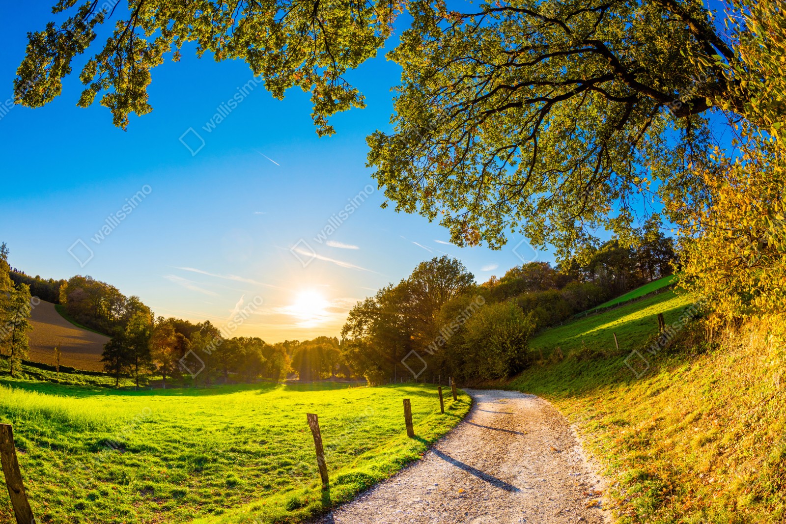 Fototapeta Słoneczna łąka i wiejska droga o zachodzie słońca