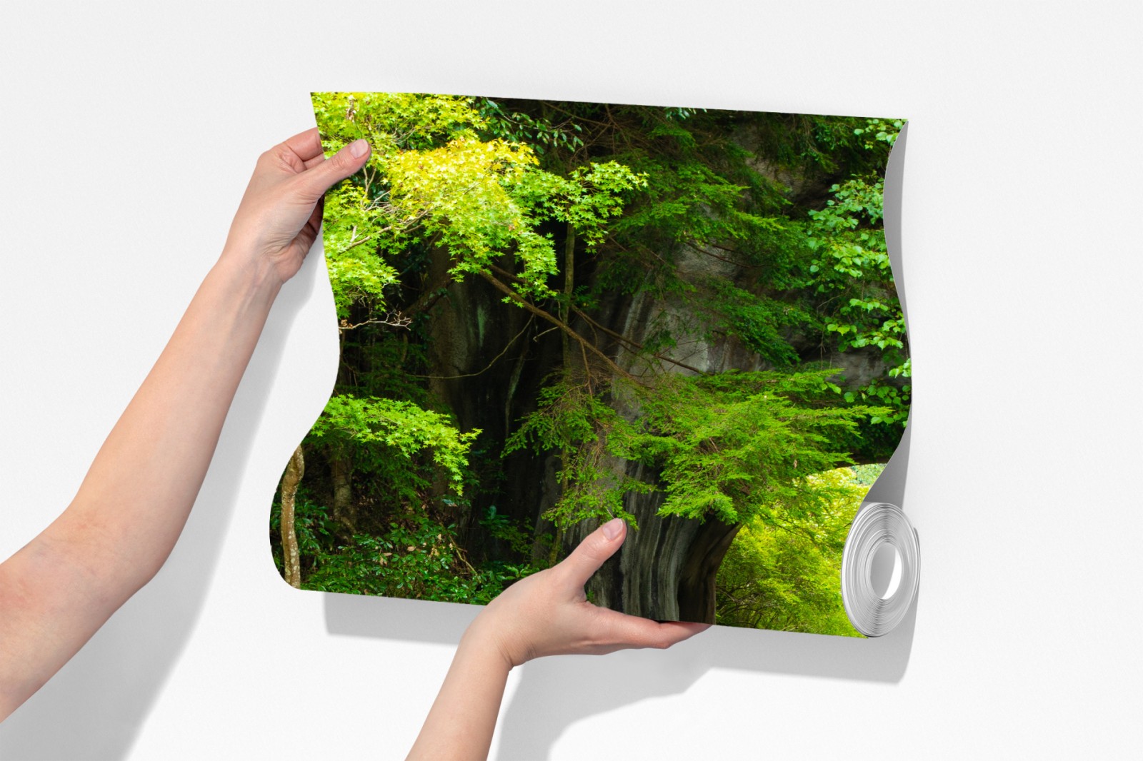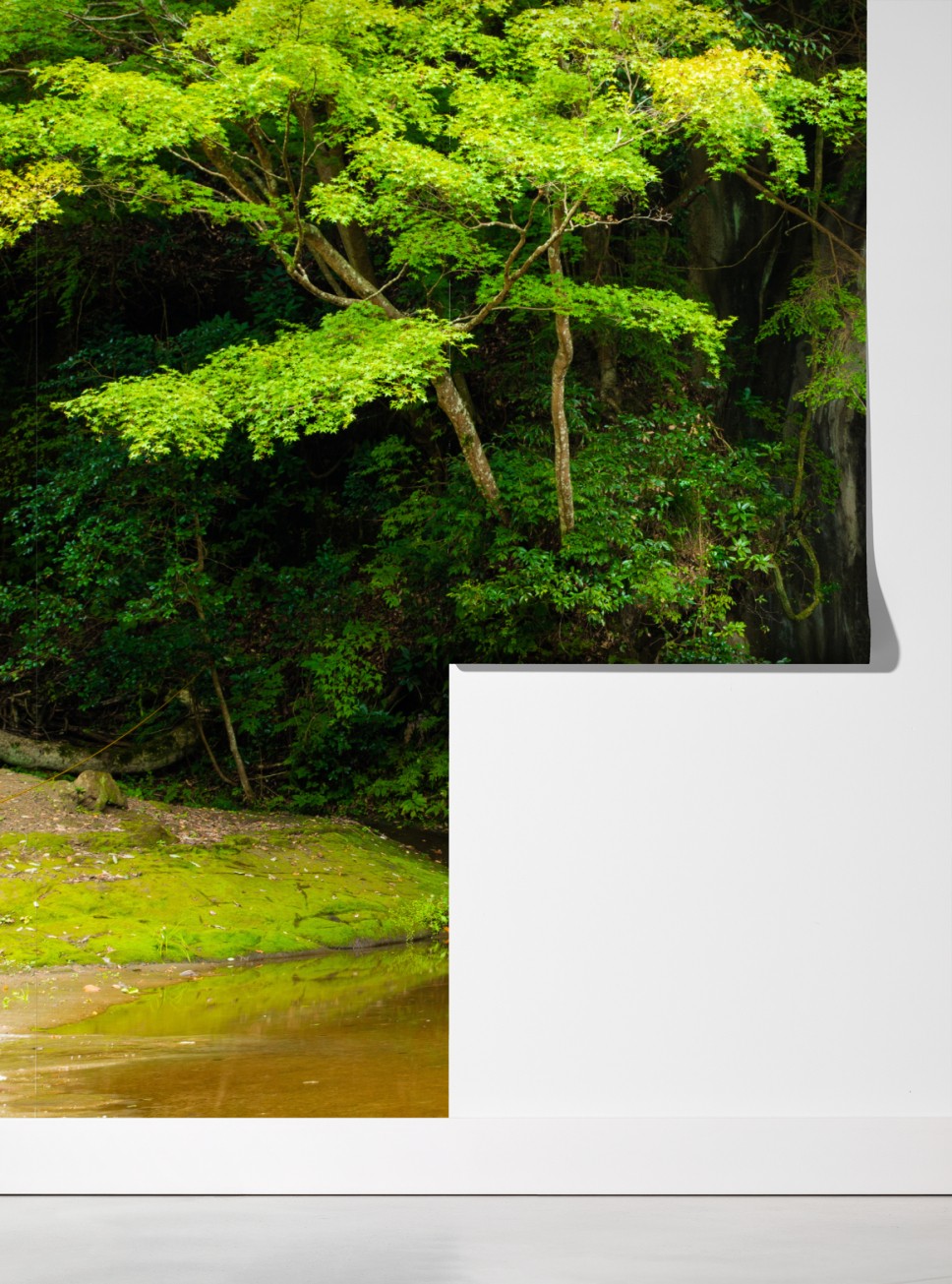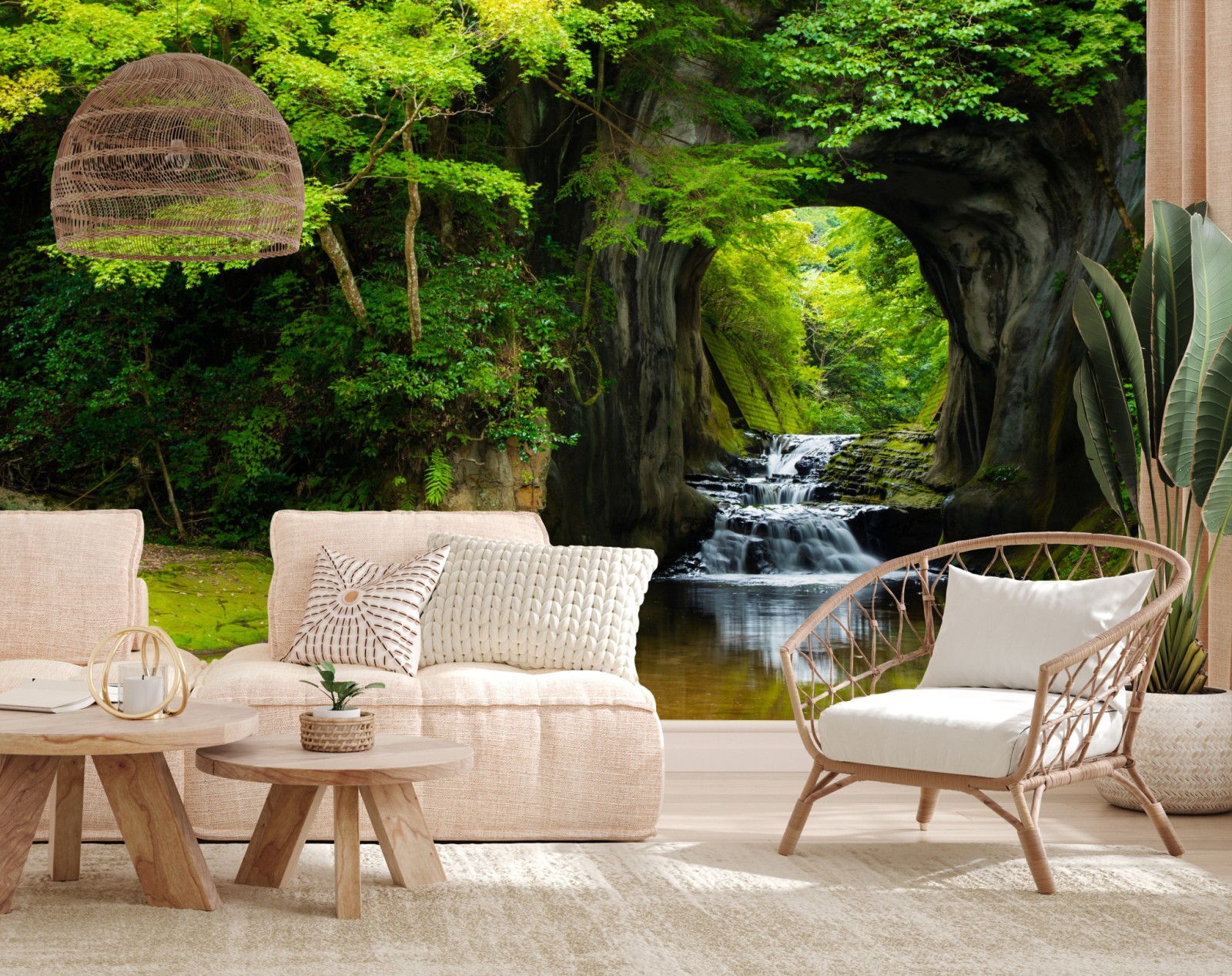 Wprowadź do wnętrza spokój dzięki widokowi wodospadu otoczonego bujną zielenią i naturalnym skalnym łukiem.