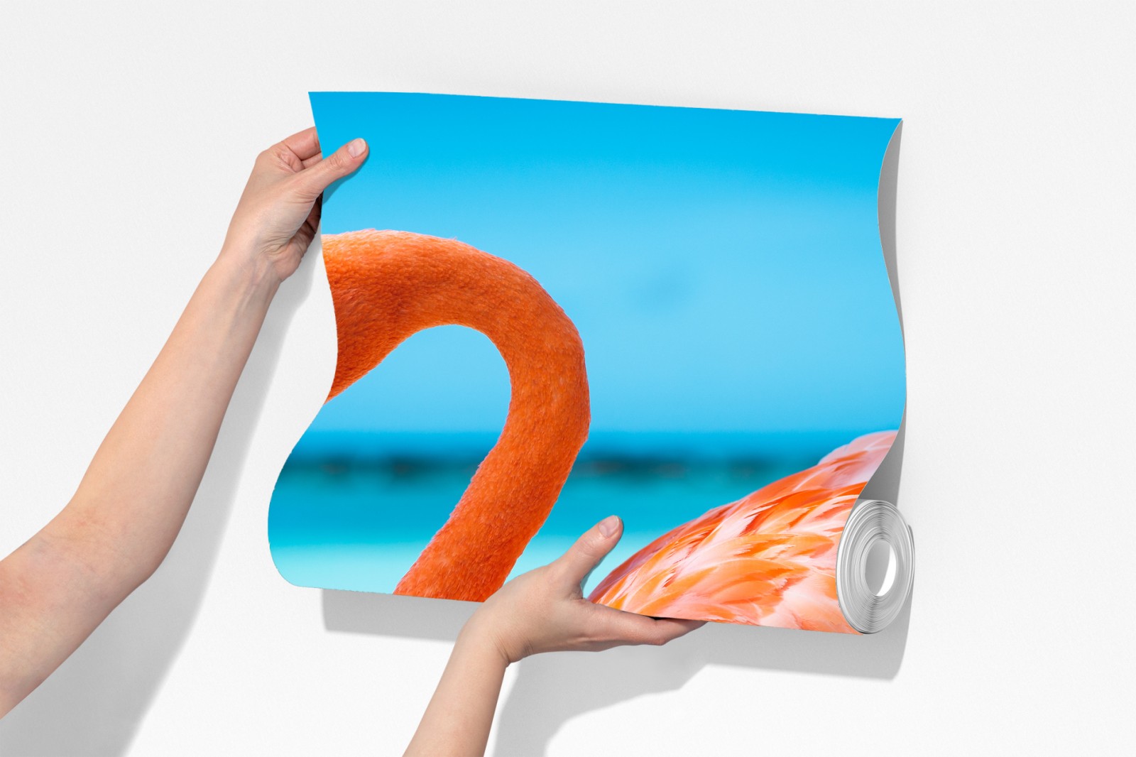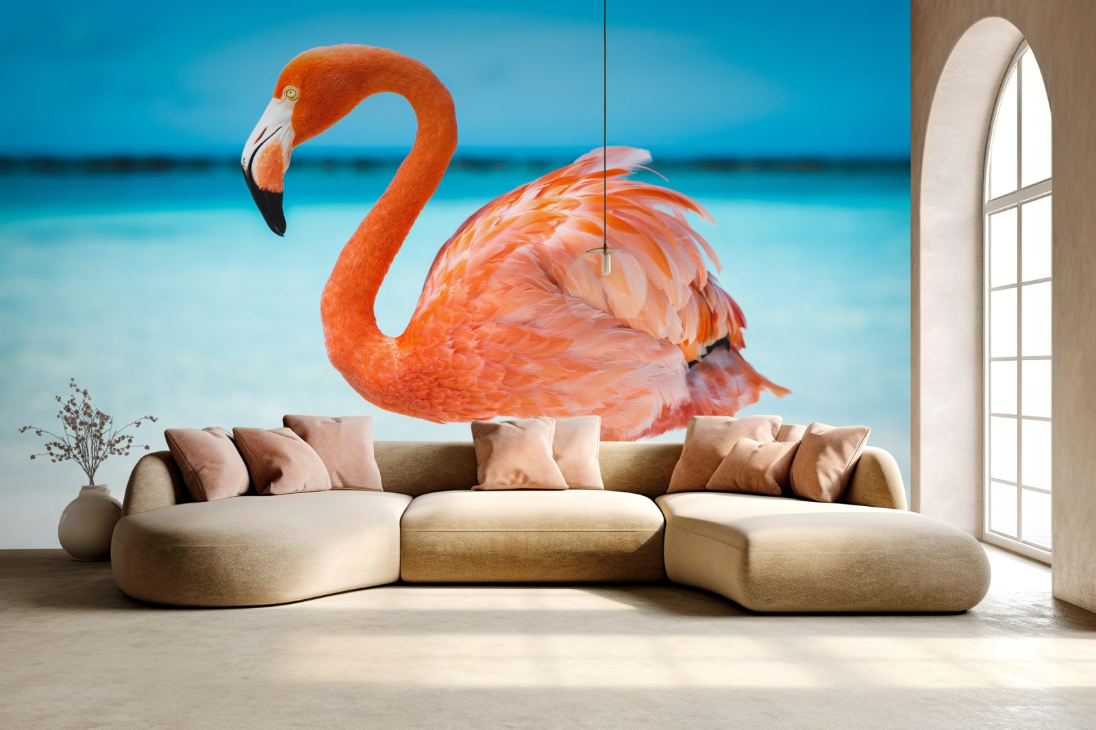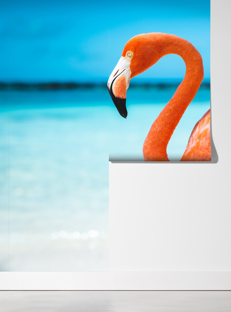 Wprowadź tropikalny klimat do wnętrza dzięki żywemu różowemu flamingowi na turkusowym tle morza. Idealny do salonu, sypialni i pokoju dziecięcego.