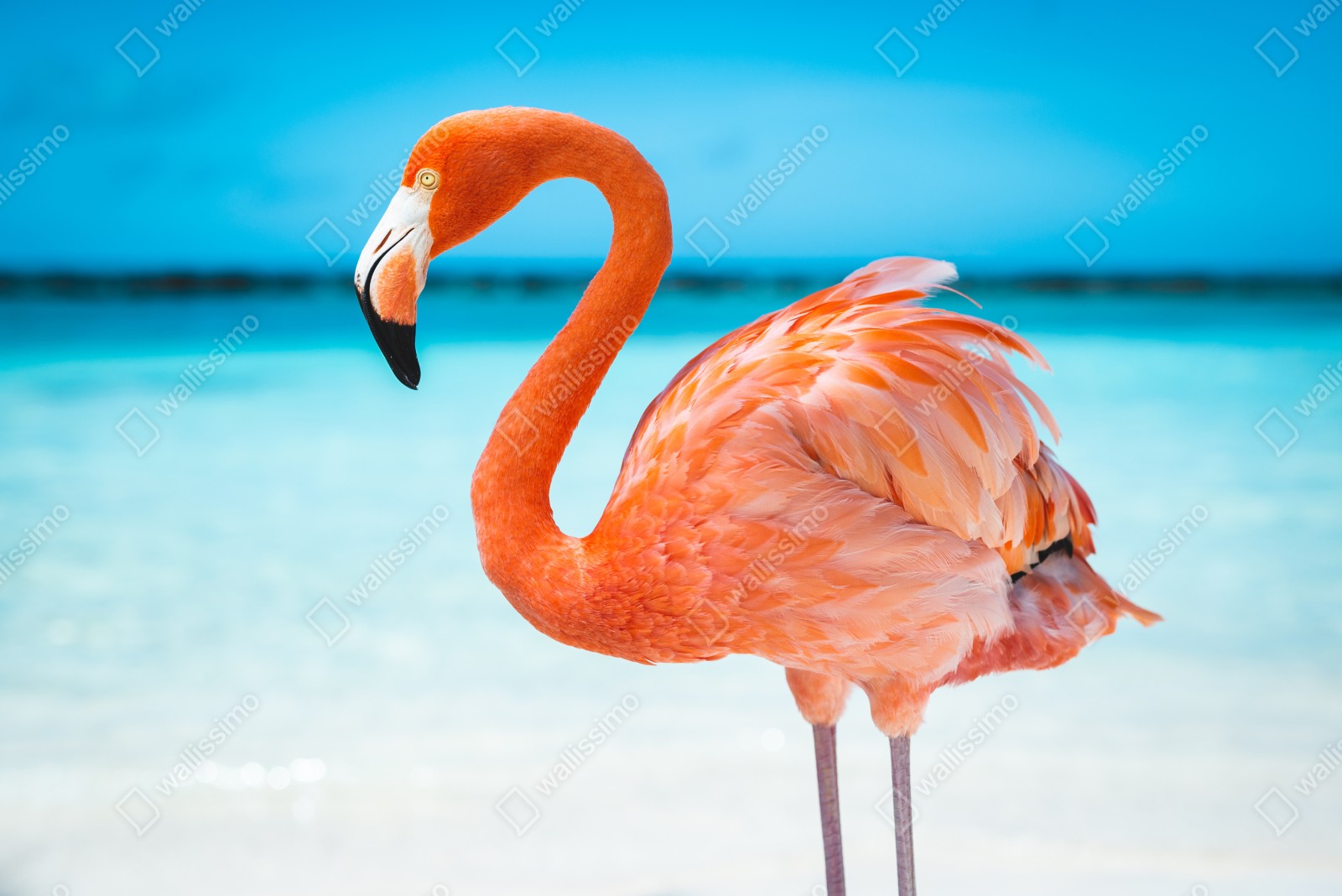 Fototapeta Żywy różowy flaming na turkusowej plaży