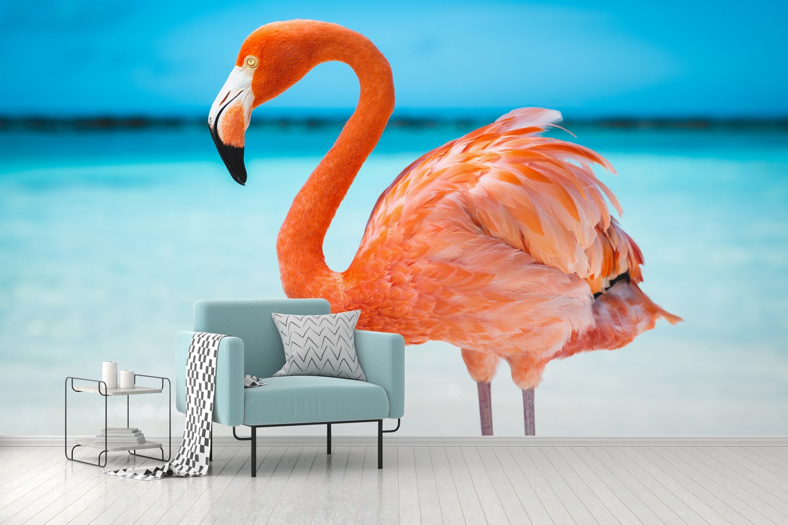 Fototapeta Żywy różowy flaming na turkusowej plaży