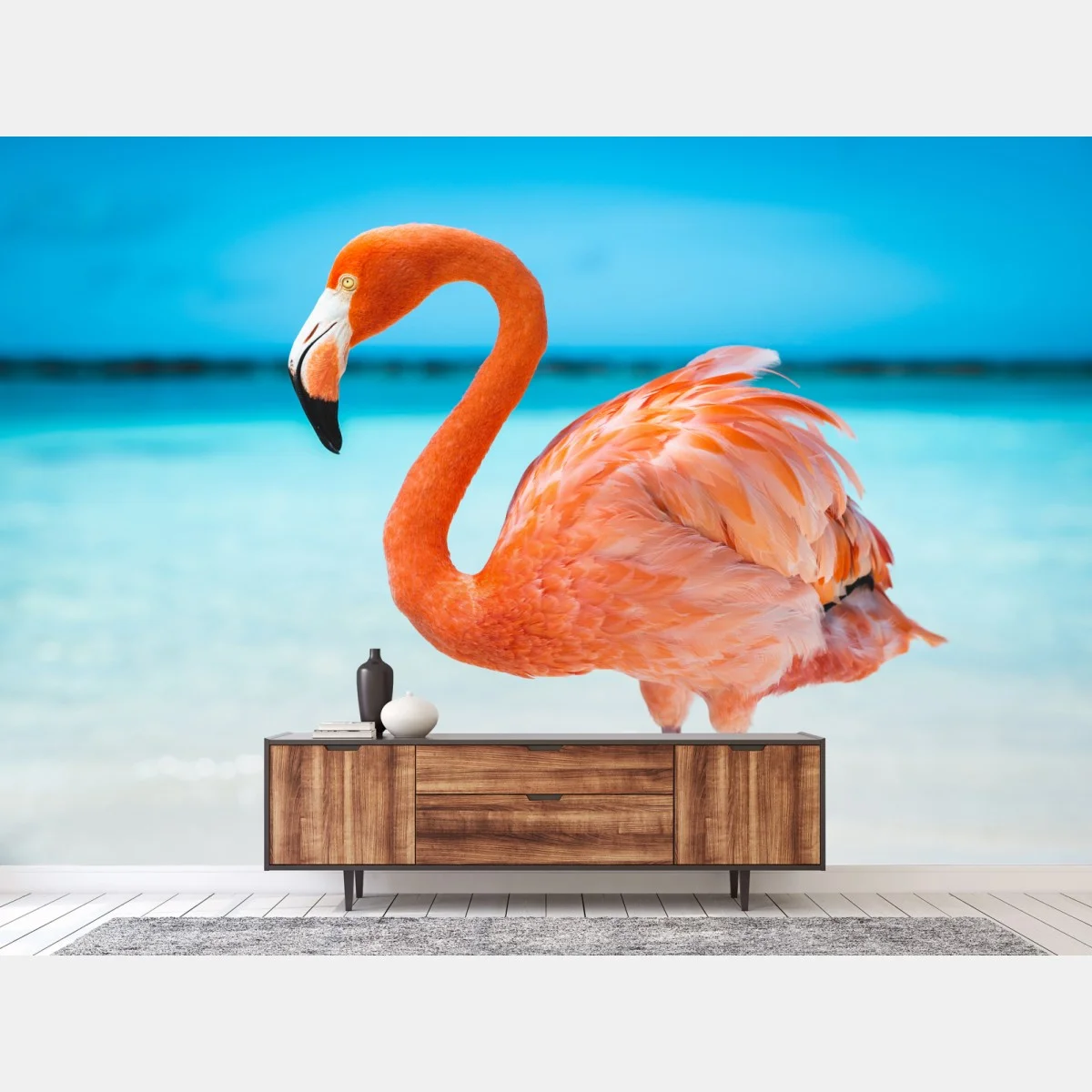 Fototapeta Żywy różowy flaming na turkusowej plaży