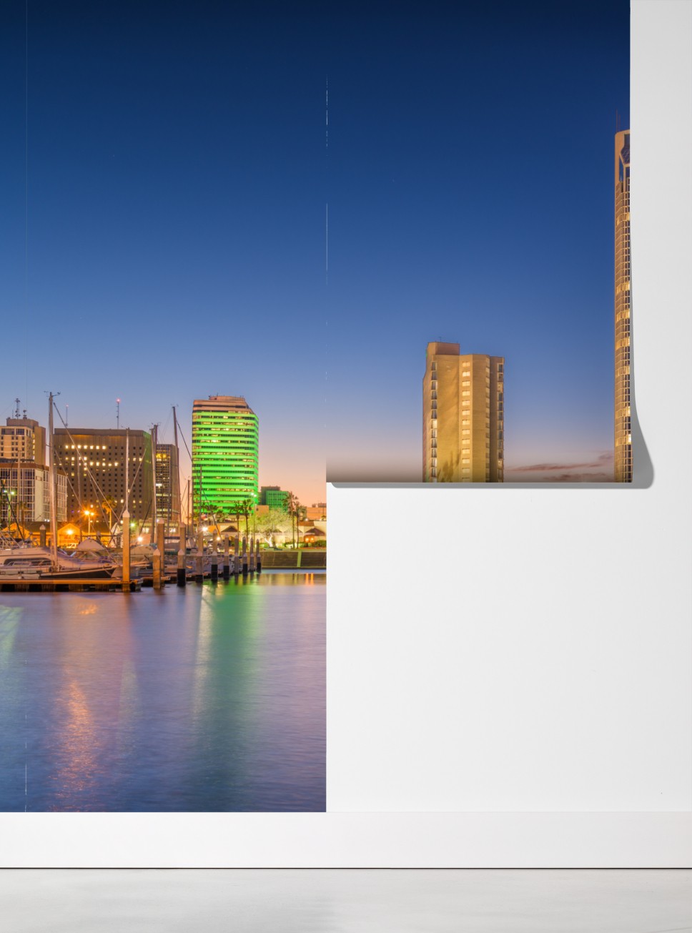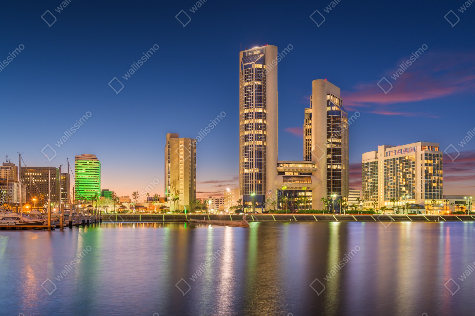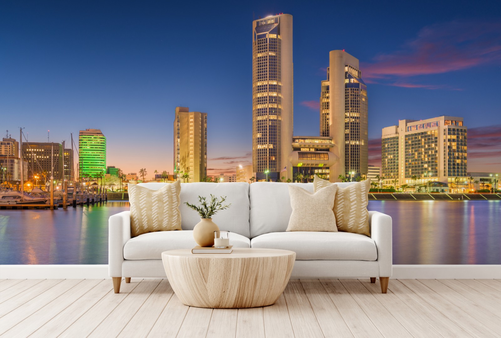 Odkryj spokojne piękno panoramy Corpus Christi o zmierzchu z lśniącymi odbiciami i miejskim klimatem, idealne do ozdobienia wnętrza.