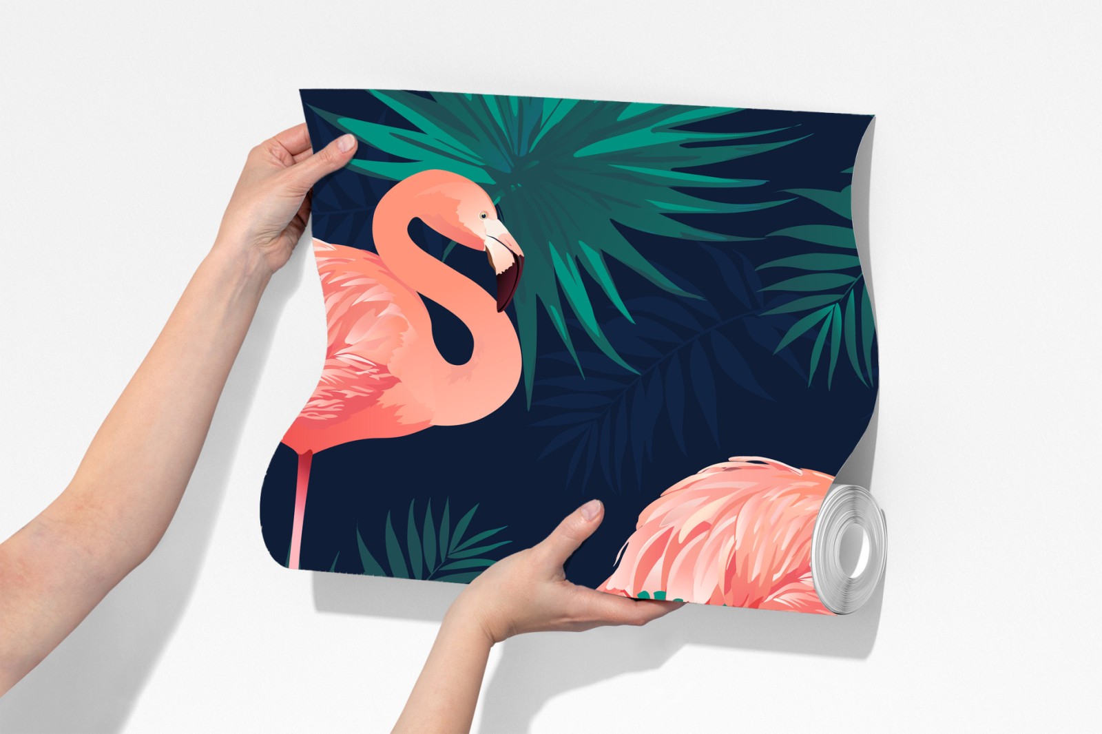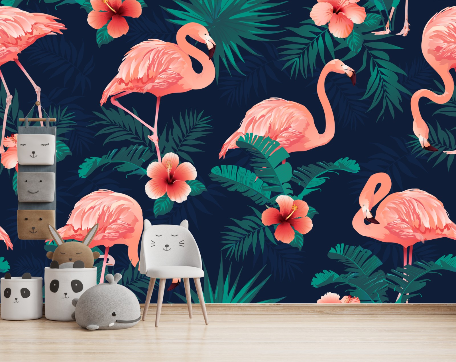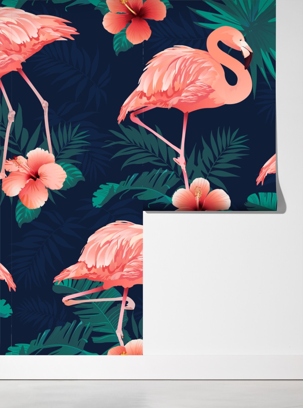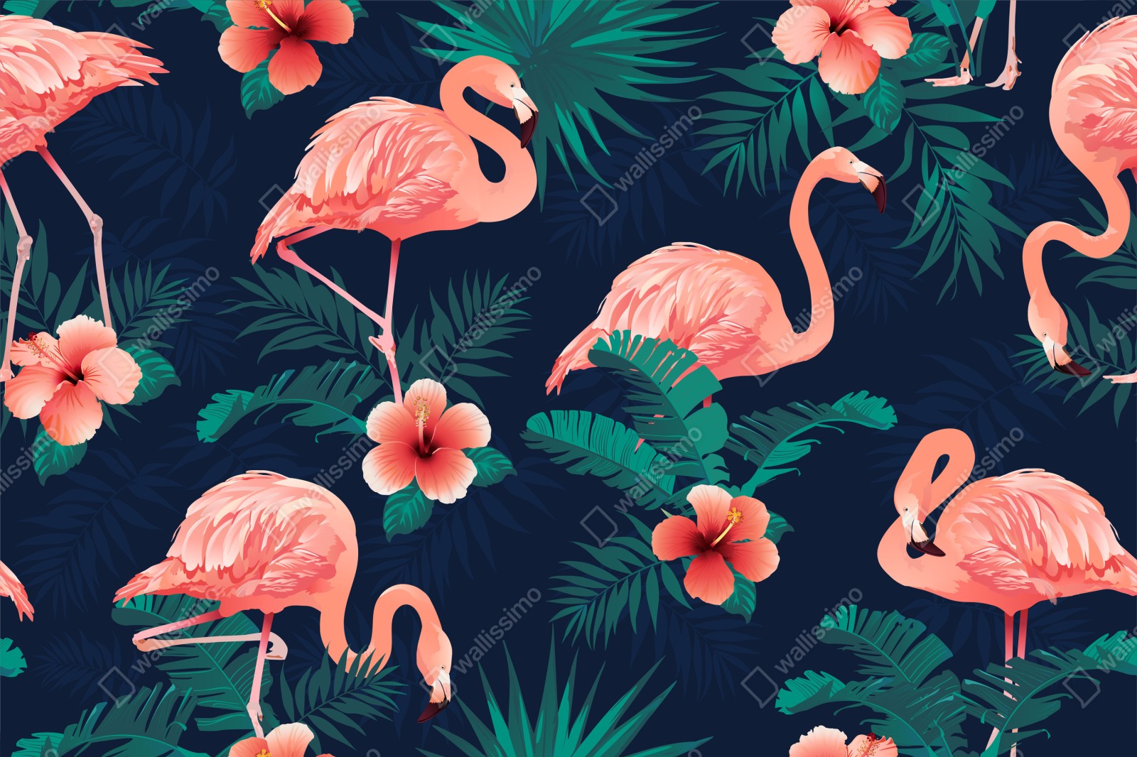 Dodaj tropikalnego uroku do wnętrza dzięki żywym różowym flamingom i bujnej zielonej roślinności na głębokim granatowym tle.