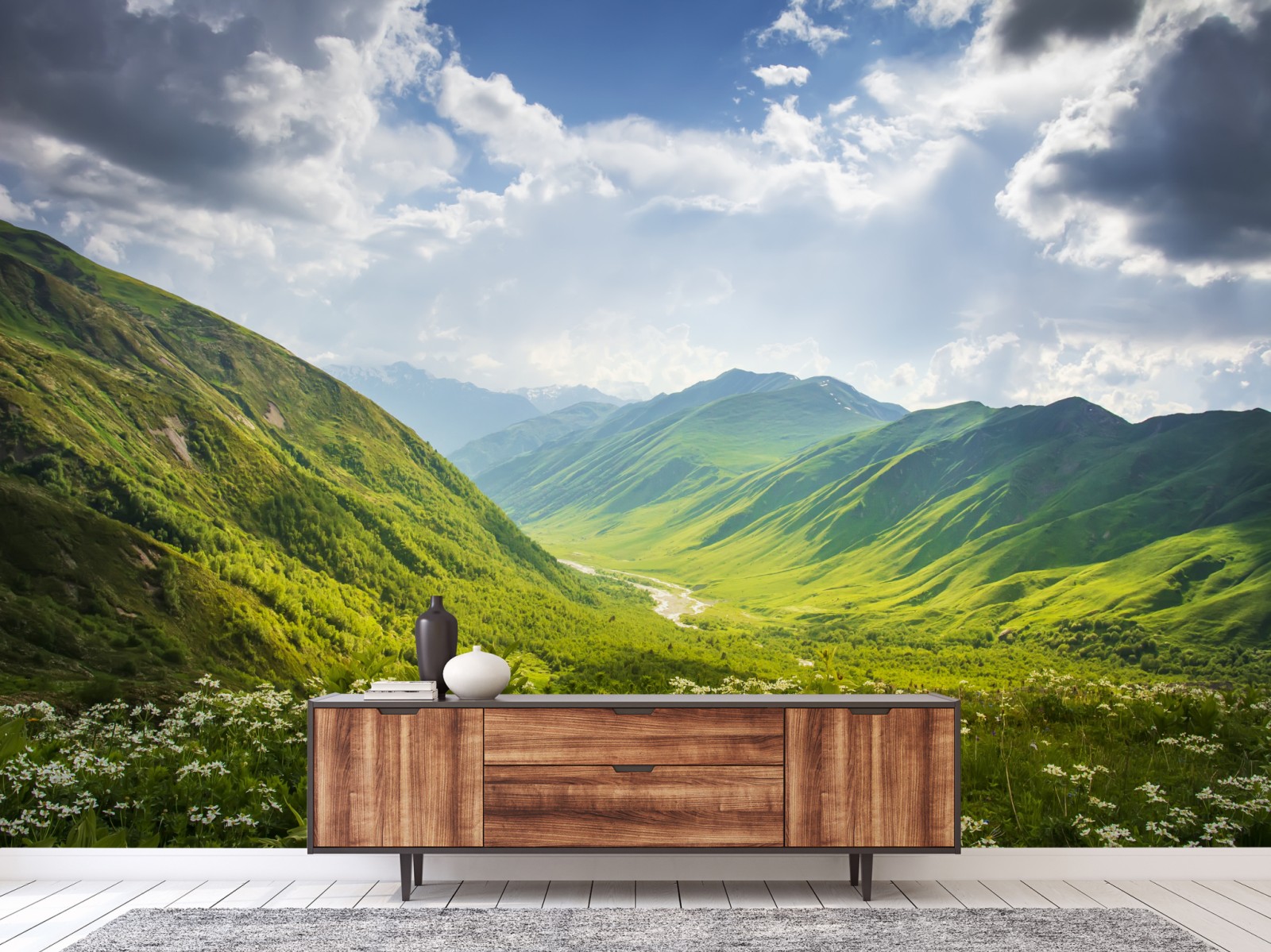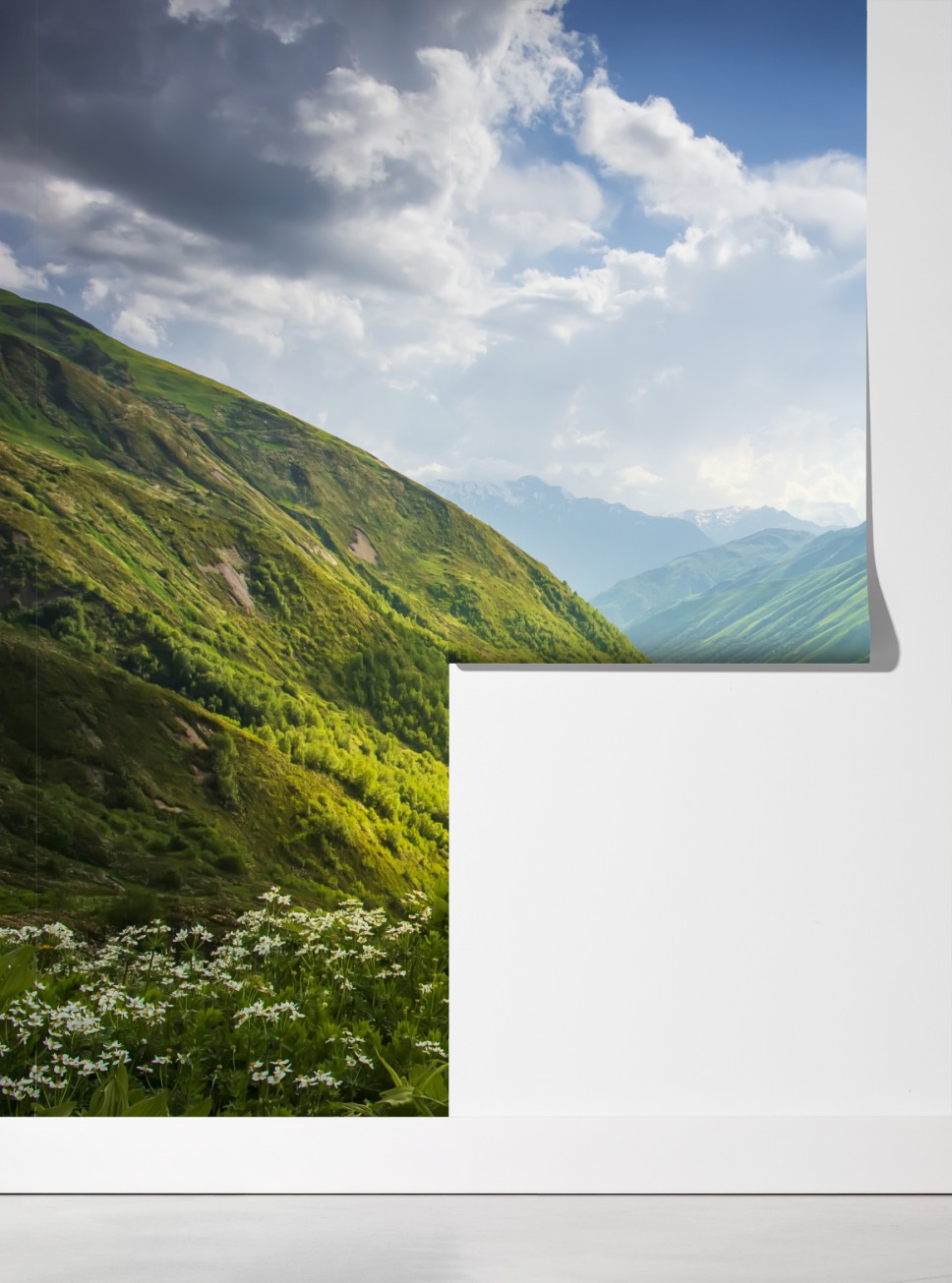 Wprowadź spokój górskich łąk do swojego wnętrza dzięki intensywnym zielonym barwom i dramatycznemu niebu.