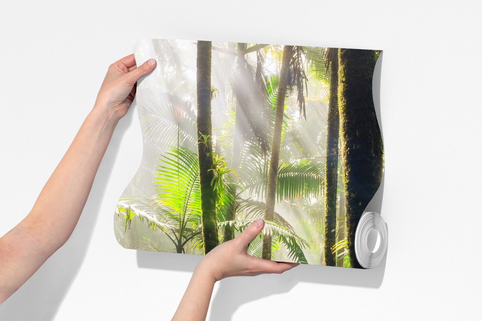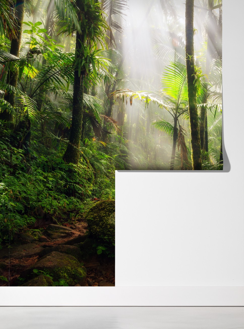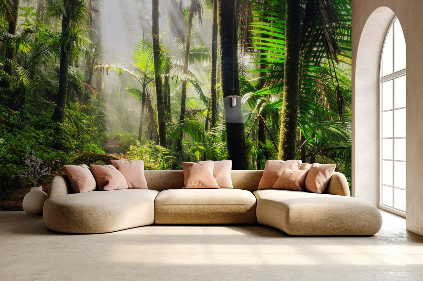 Wprowadź do wnętrza spokój tropikalnego lasu deszczowego oświetlonego miękkimi promieniami słońca.