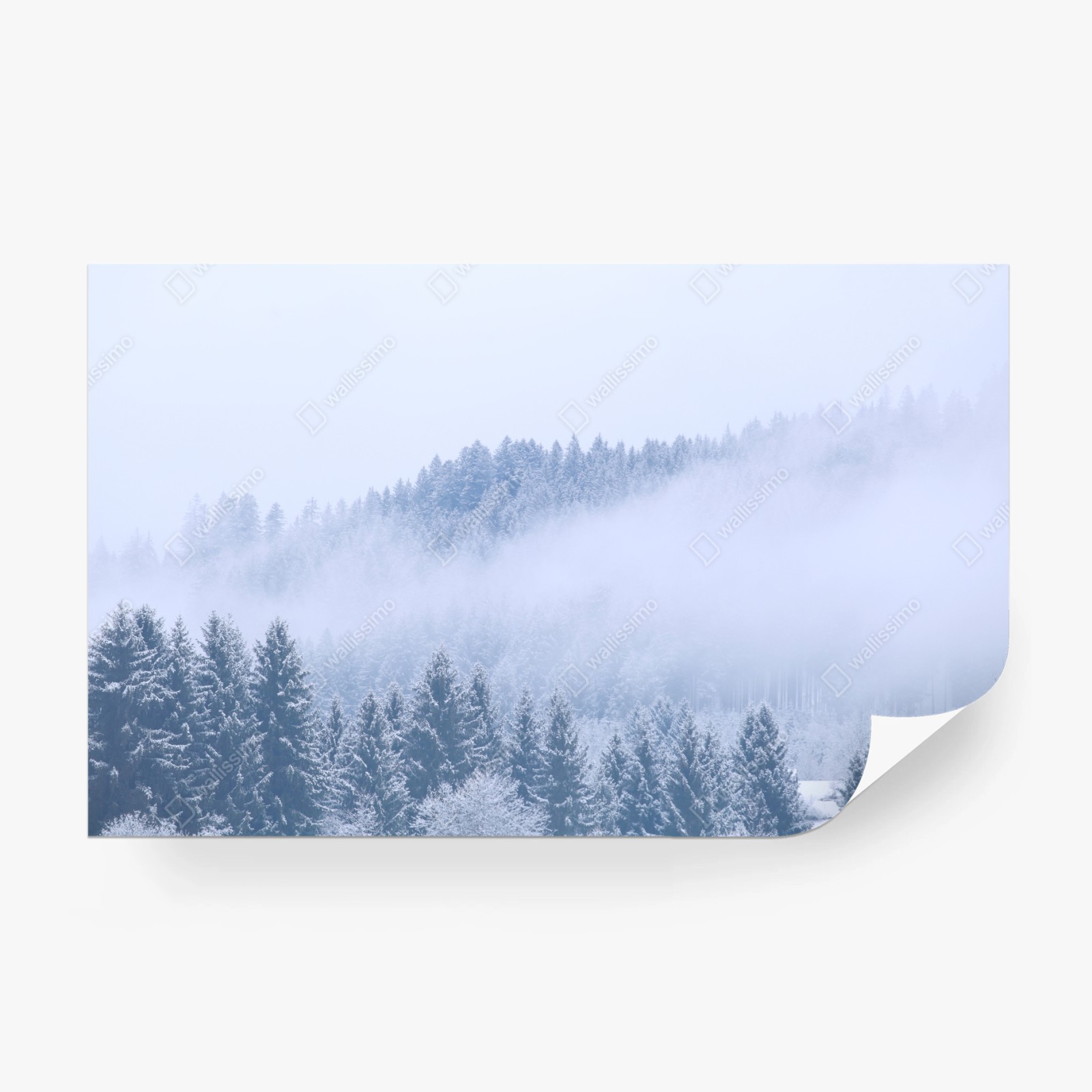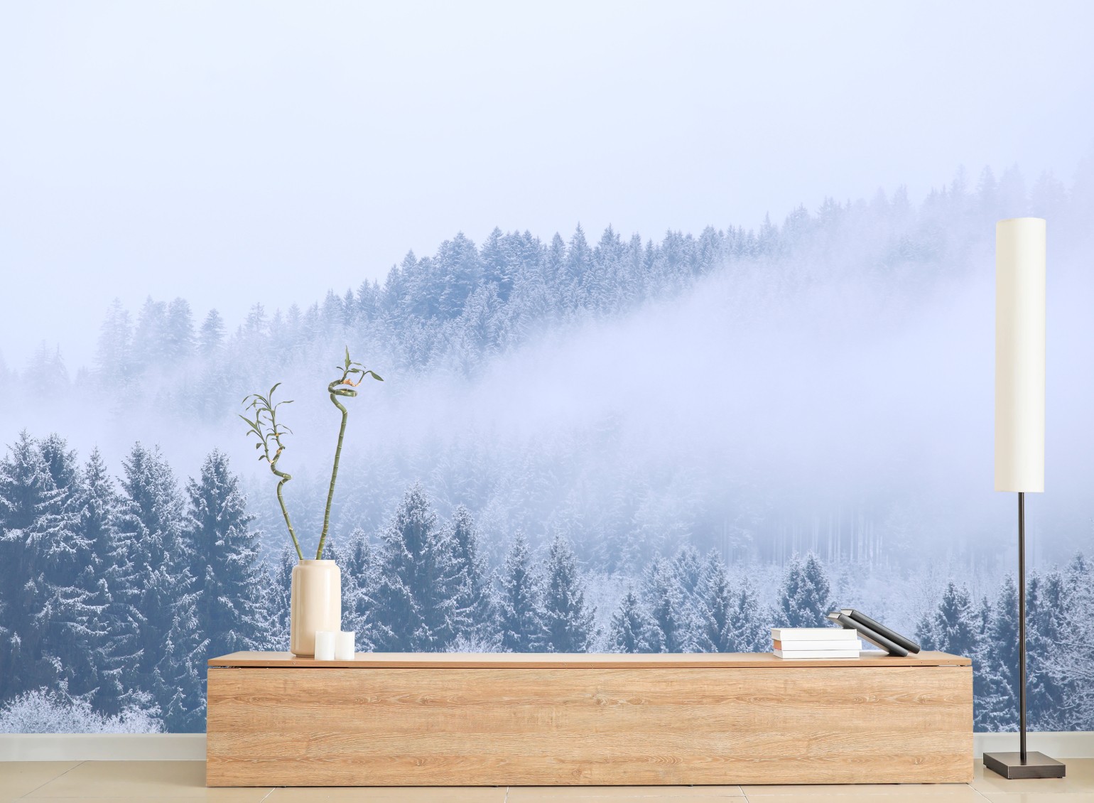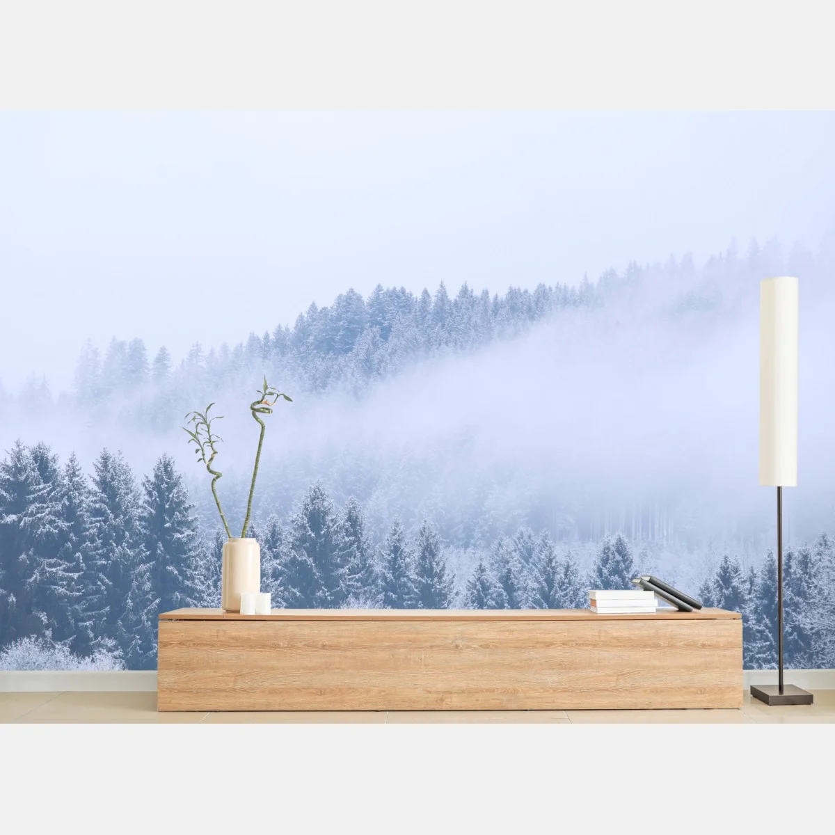 Wprowadź do wnętrza spokojną zimową atmosferę dzięki temu śnieżnemu lasowi iglastemu spowitemu mgłą, idealnemu do nowoczesnych pomieszczeń.WięcejMniej