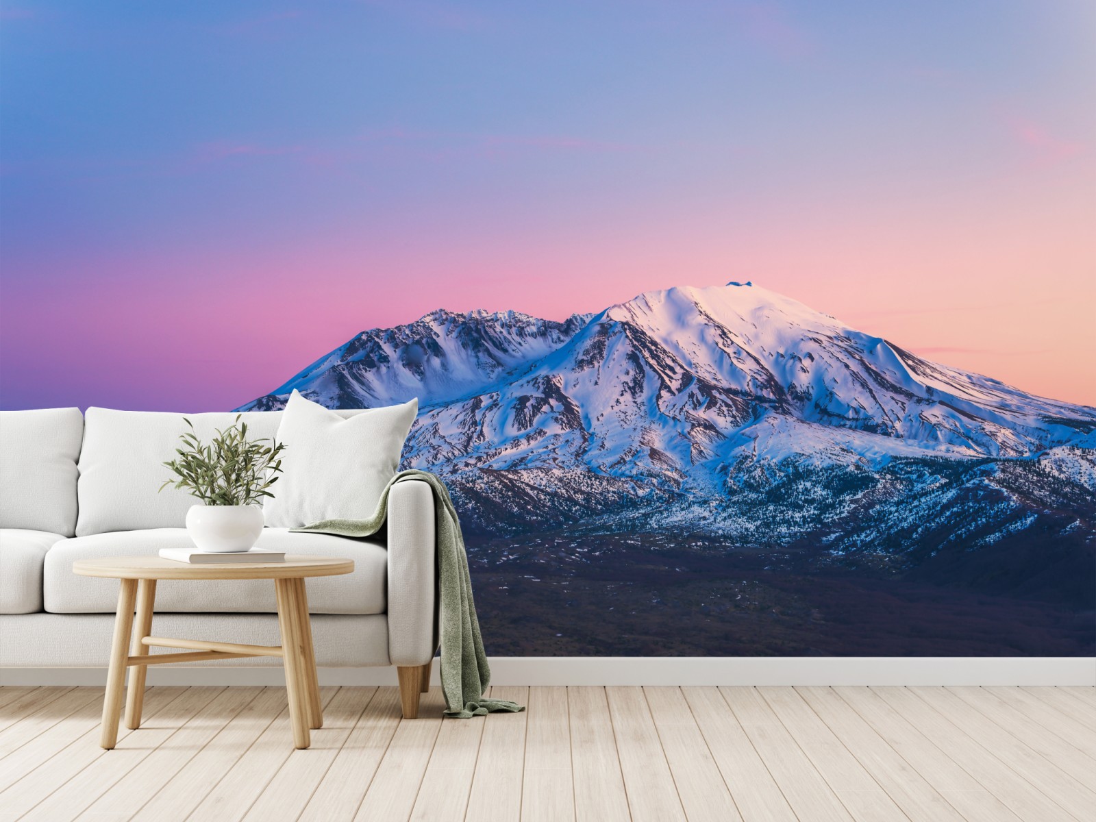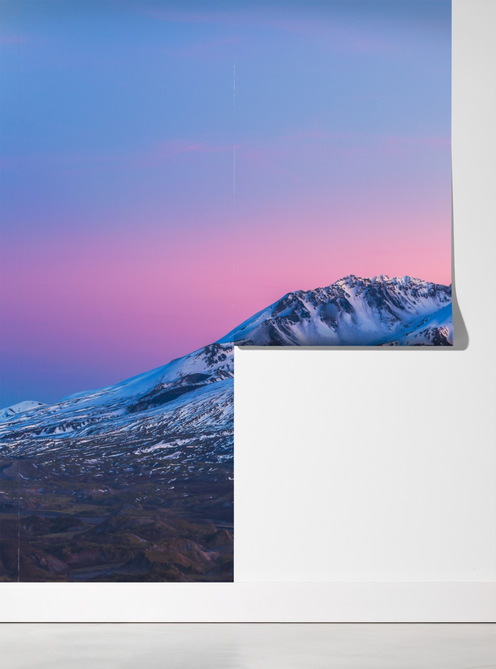 Wprowadź uspokajającą alpejską scenerię do wnętrza dzięki pastelowemu zachodowi słońca nad Mount St. Helens.