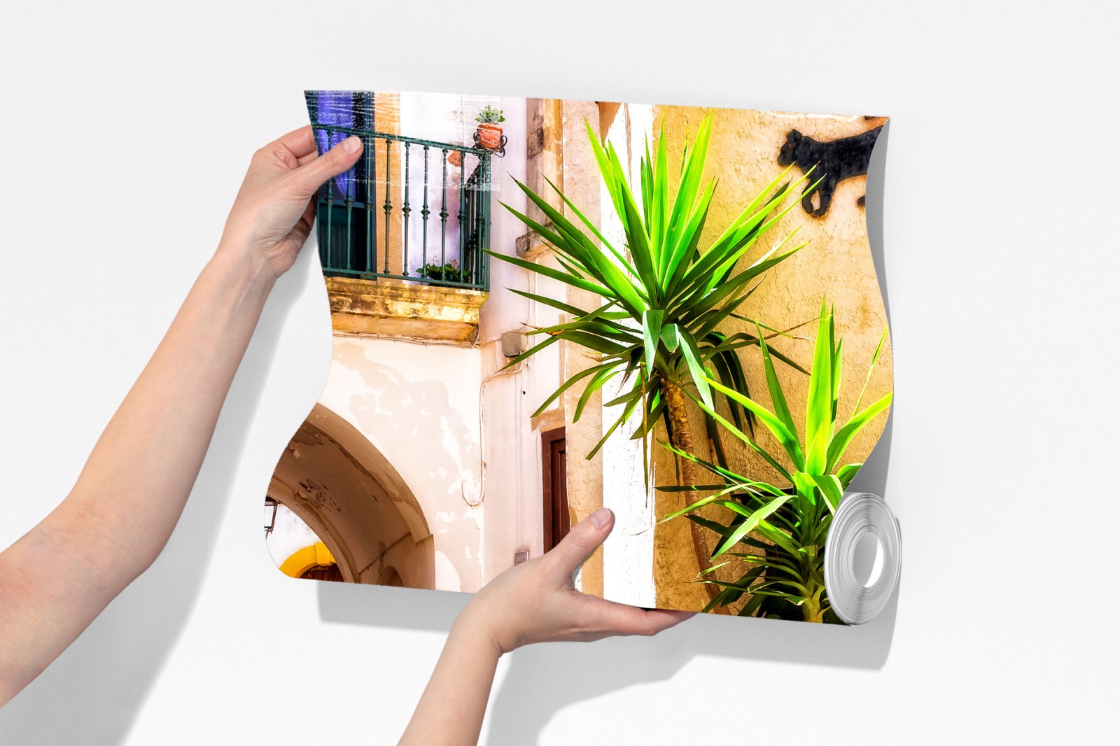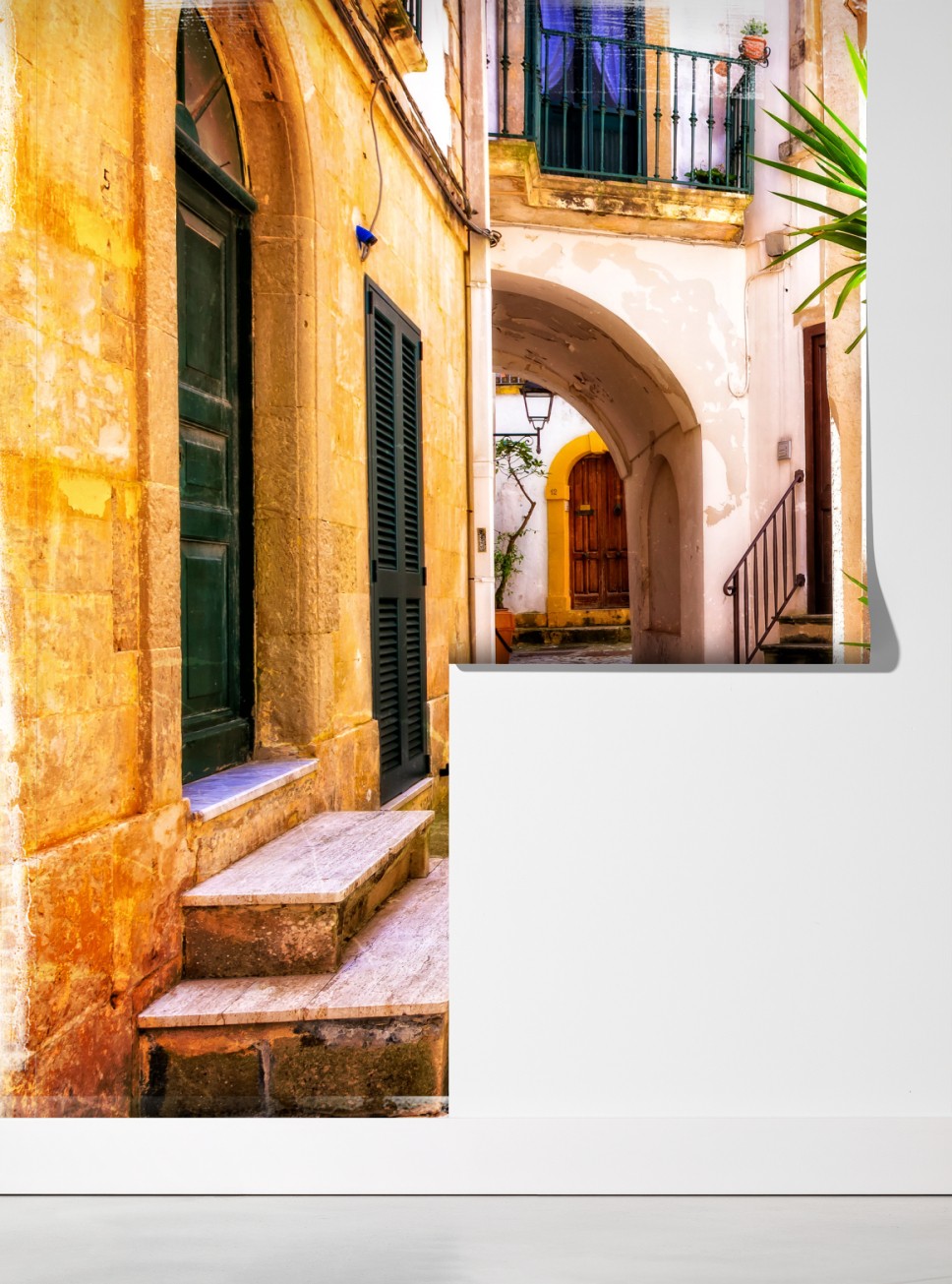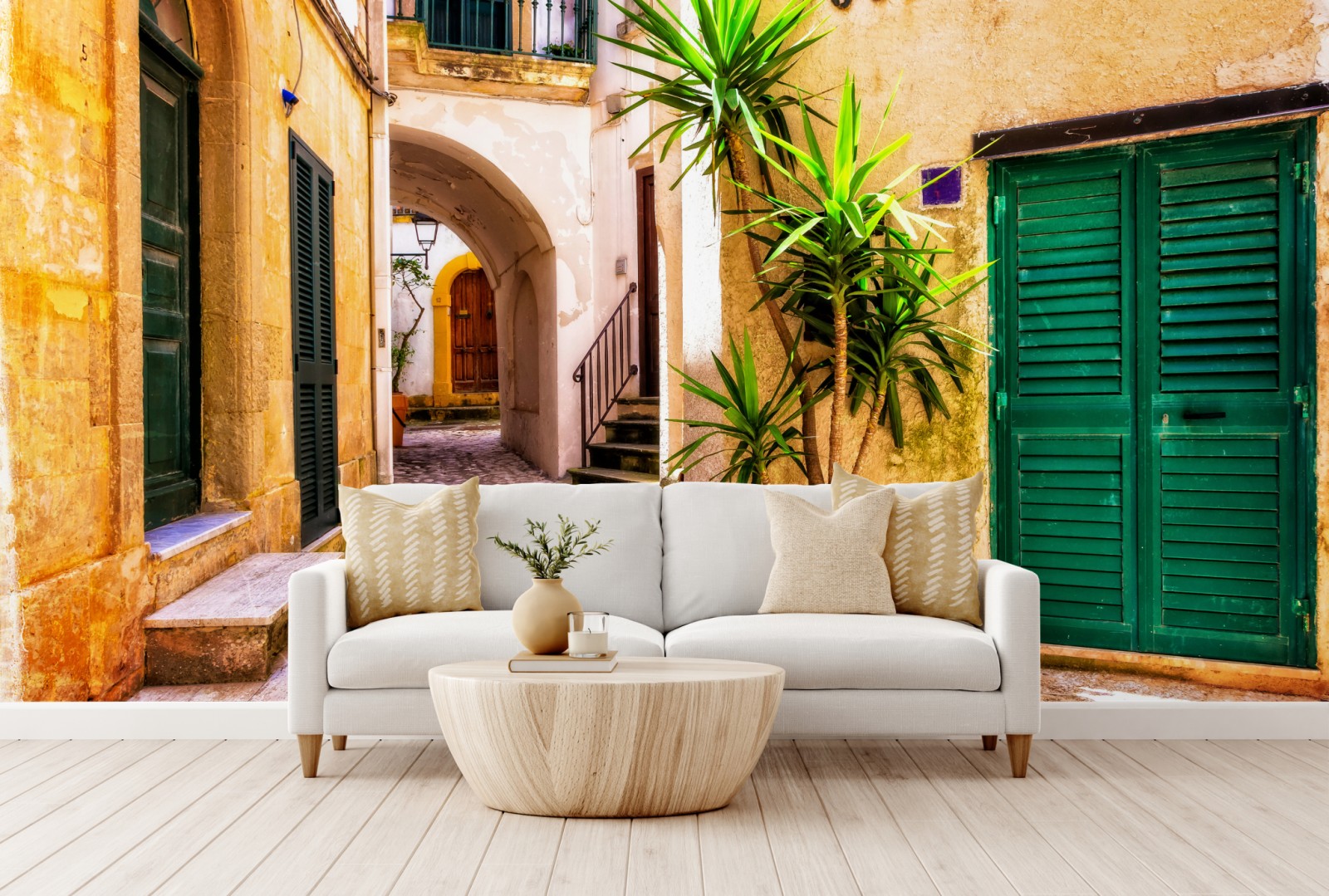 Wprowadź ciepły śródziemnomorski klimat do wnętrza dzięki tej słonecznej uliczce z kostką brukową, zielonymi okiennicami i donicą z palmą.