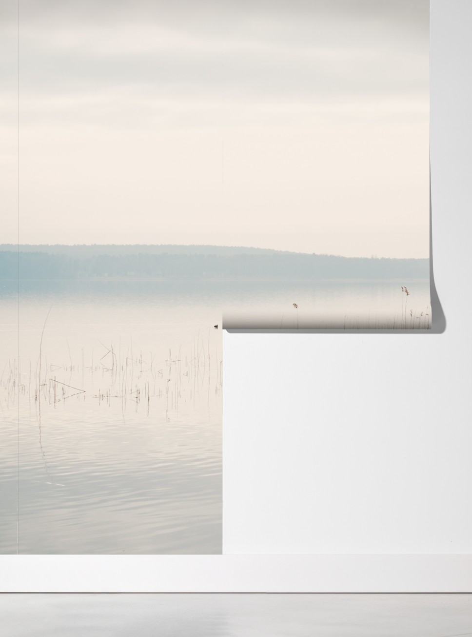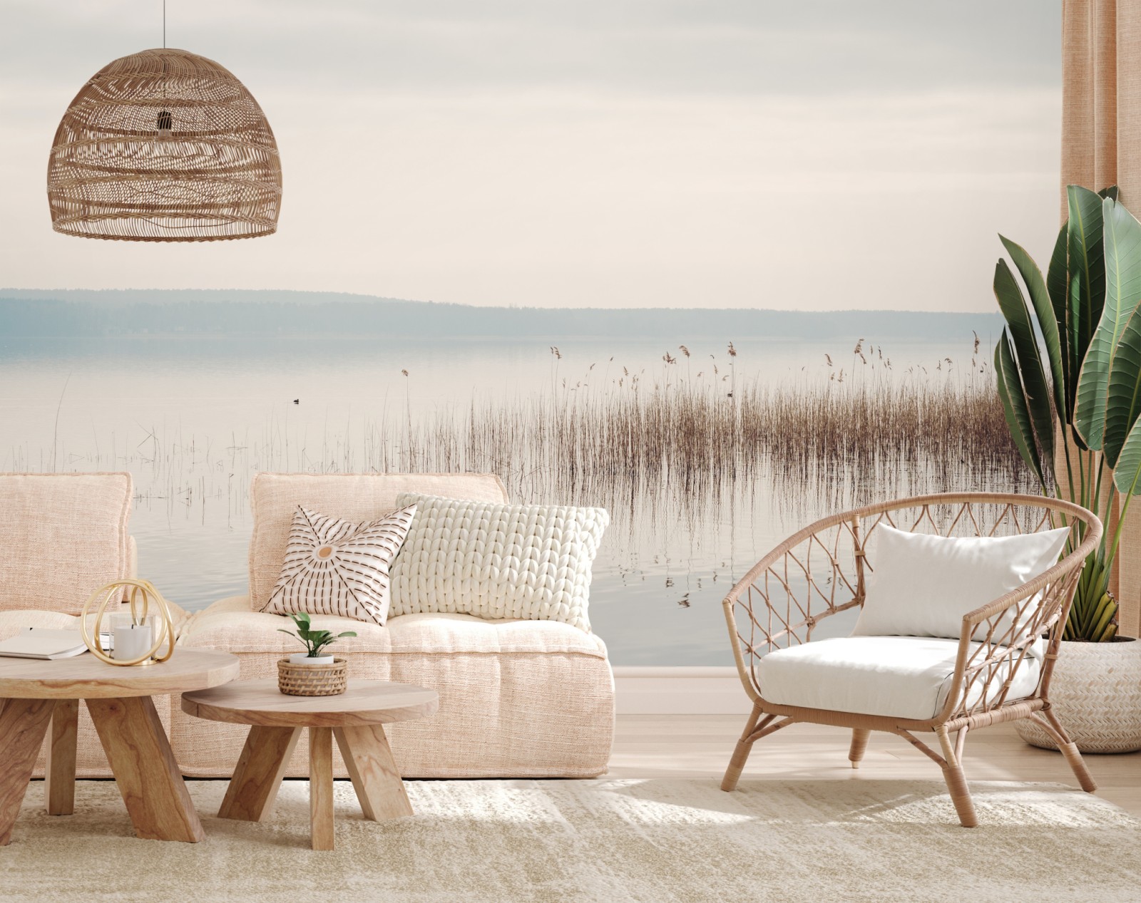 Wprowadź do wnętrza spokojną i minimalistyczną atmosferę dzięki pastelowemu widokowi trzcin nad jeziorem z delikatnymi odbiciami.