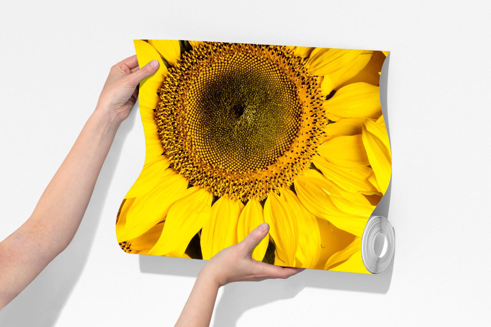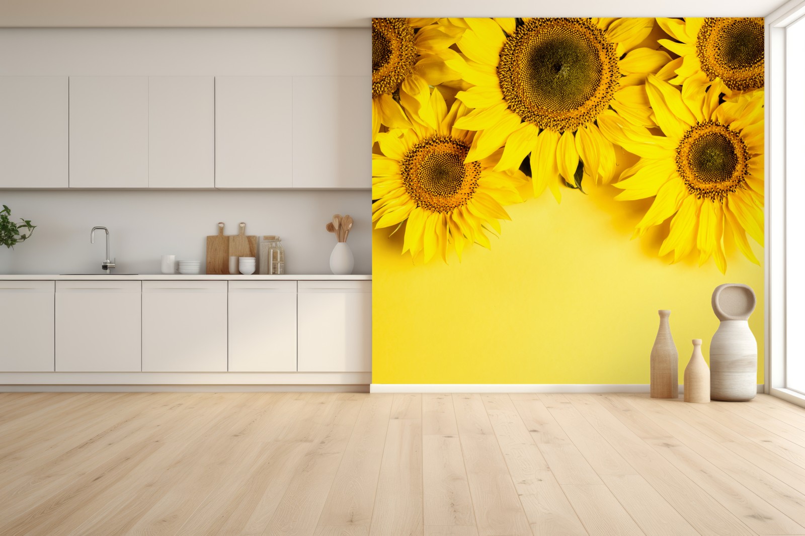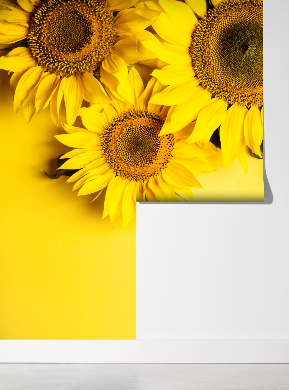 Dodaj żywej, letniej energii do wnętrza dzięki temu zbliżeniu słoneczników na słonecznym żółtym tle.