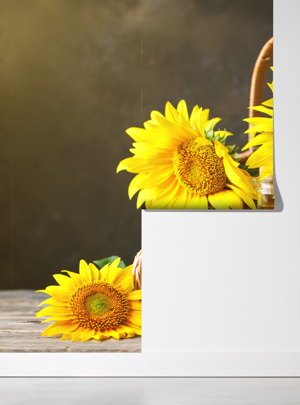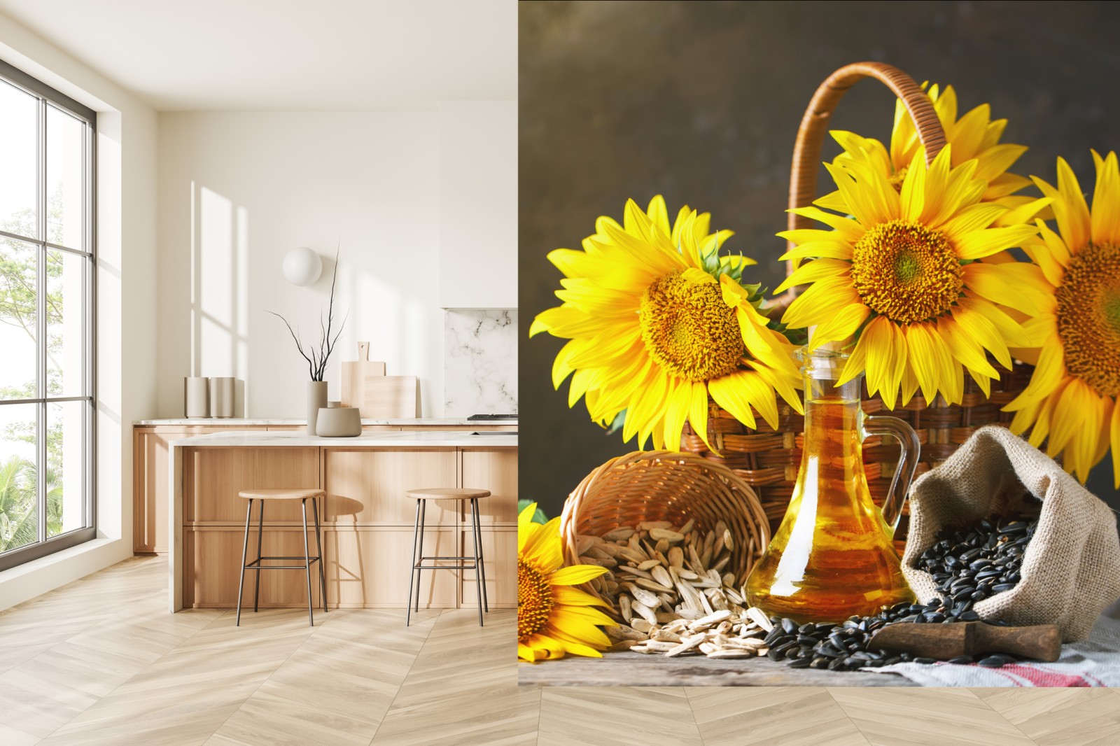 Wprowadź słoneczne ciepło do wnętrza dzięki wyrazistej kompozycji ze słoneczników, ziaren i oleju w rustykalnym stylu.