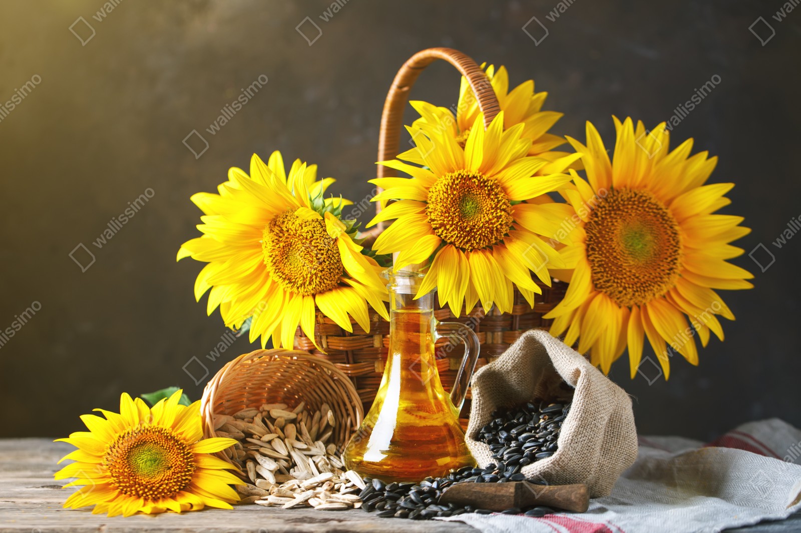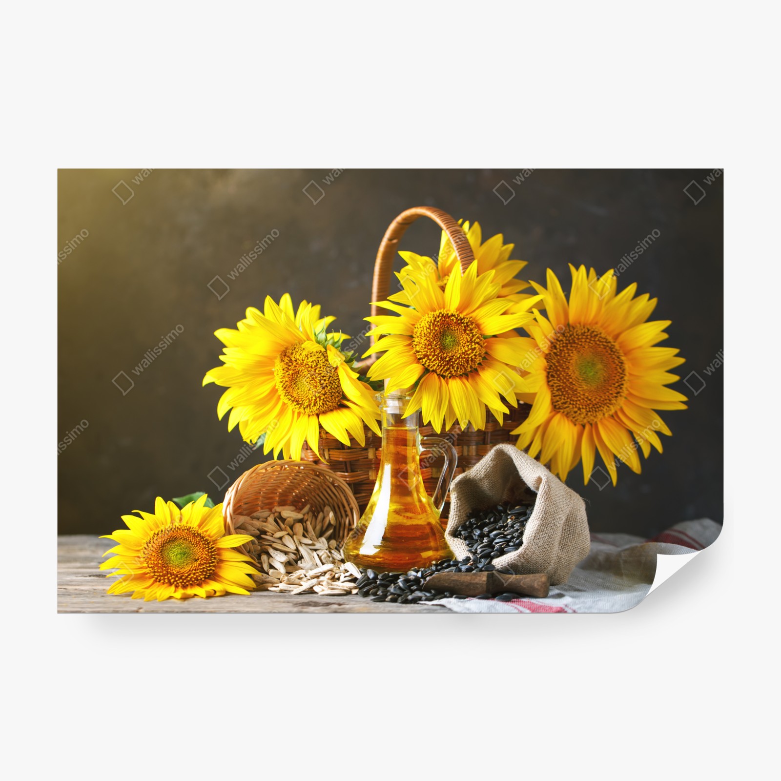 Fototapeta Jasna martwa natura ze słonecznikami, ziarnami i olejem