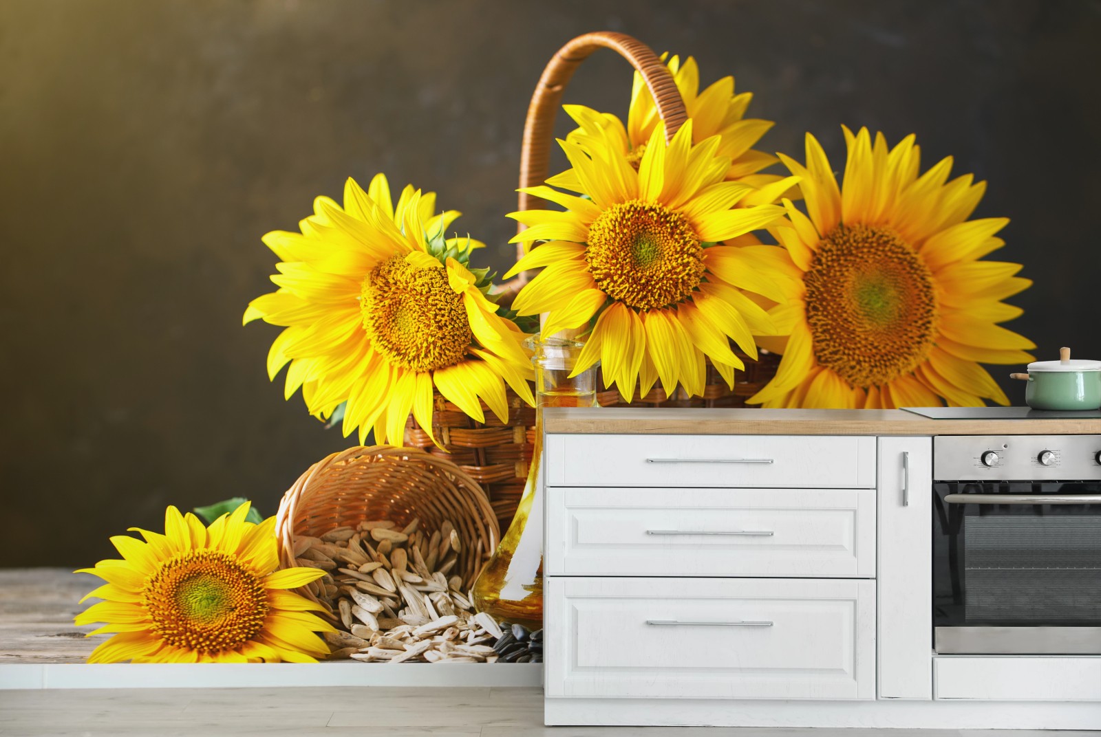 Fototapeta Jasna martwa natura ze słonecznikami, ziarnami i olejem