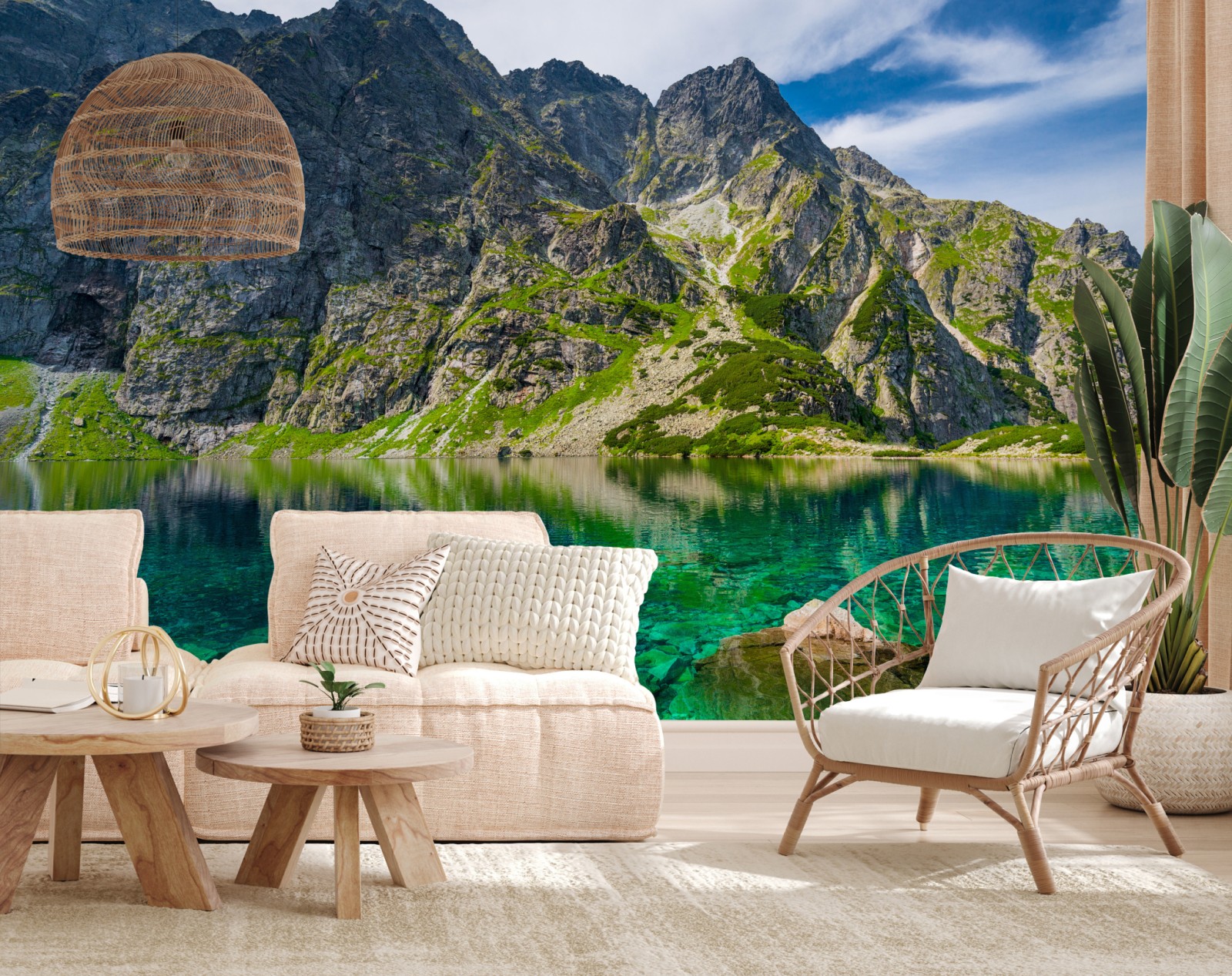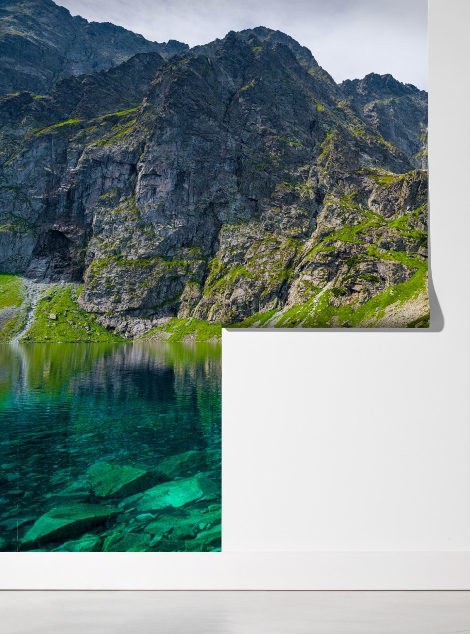 Wprowadź spokojną alpejską atmosferę do wnętrza dzięki temu żywemu krajobrazowi gór i jeziora z krystalicznie czystą turkusową wodą.