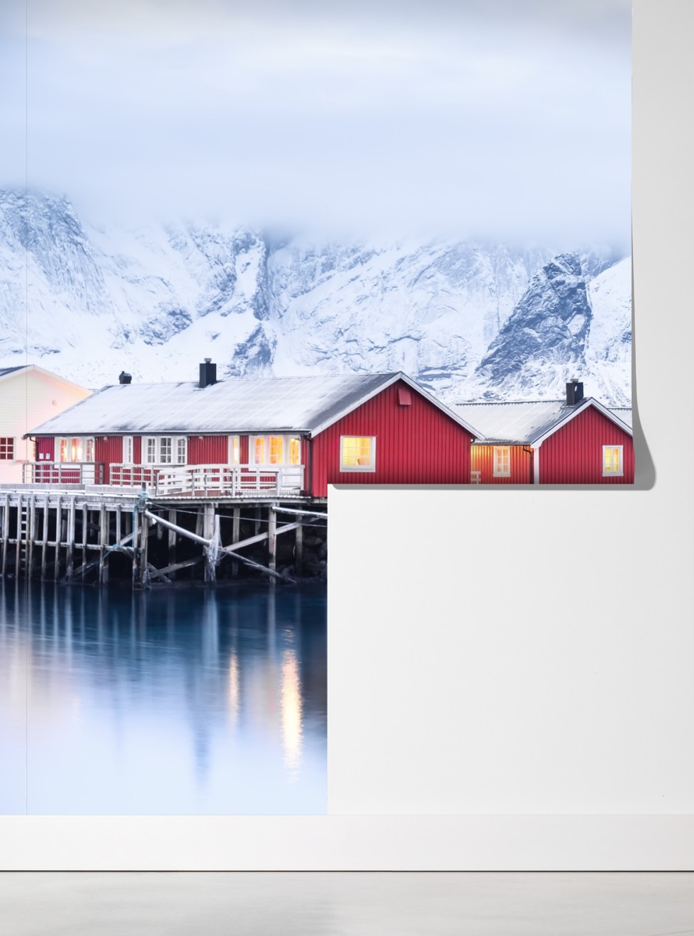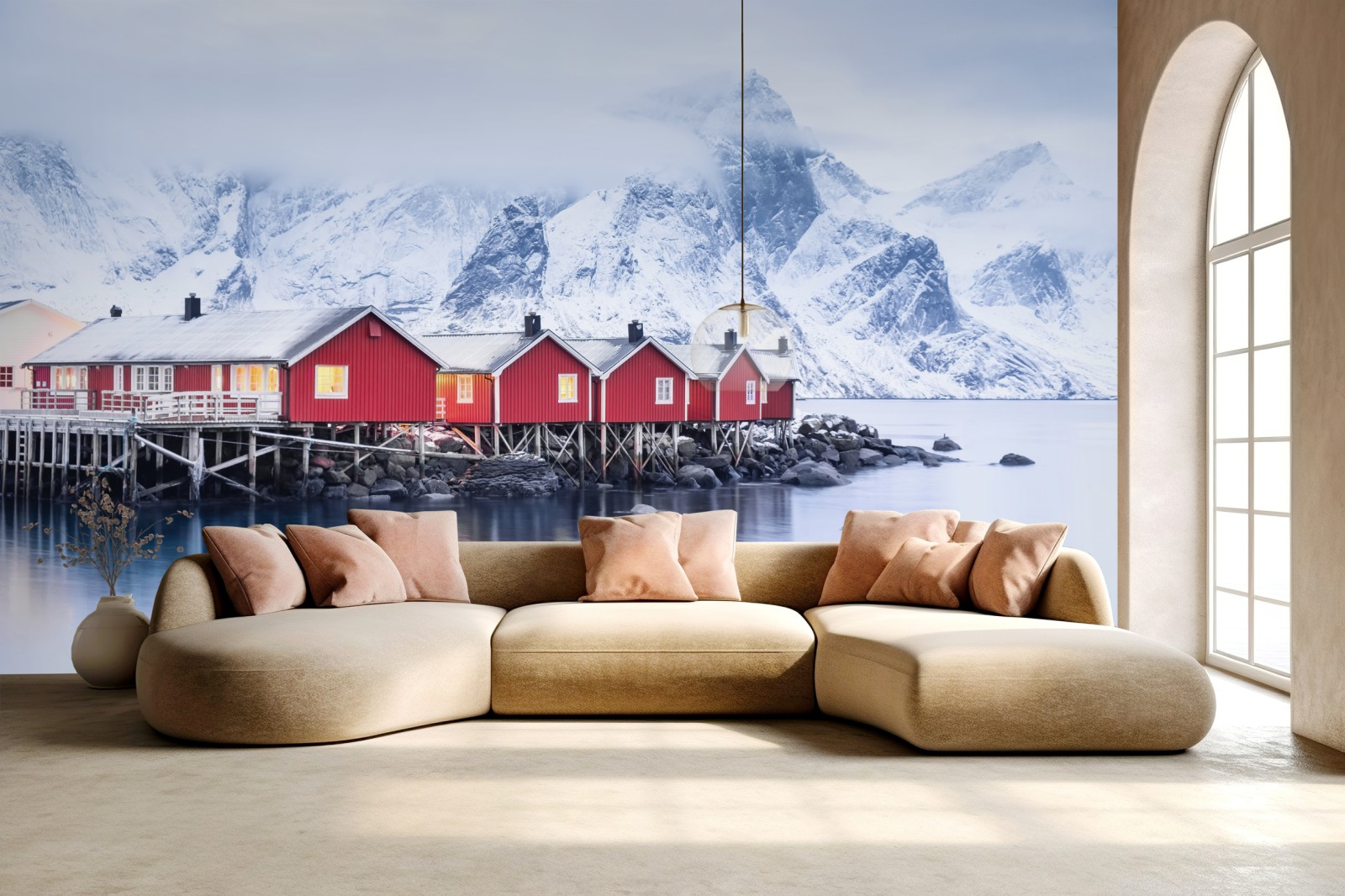 Poczuj spokój arktycznego krajobrazu z charakterystycznymi czerwonymi domkami i majestatycznymi, ośnieżonymi górami.