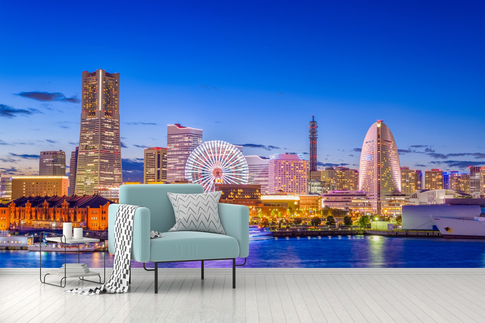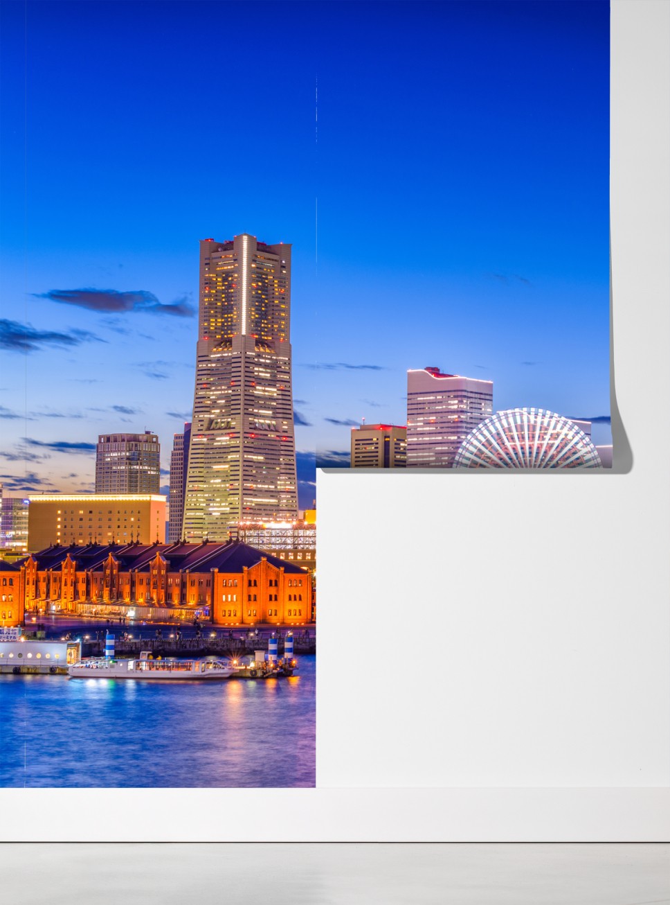 Poczuj energię oświetlonej panoramy Yokohama odbijającej się w zatoce, idealna do nowoczesnych wnętrz.