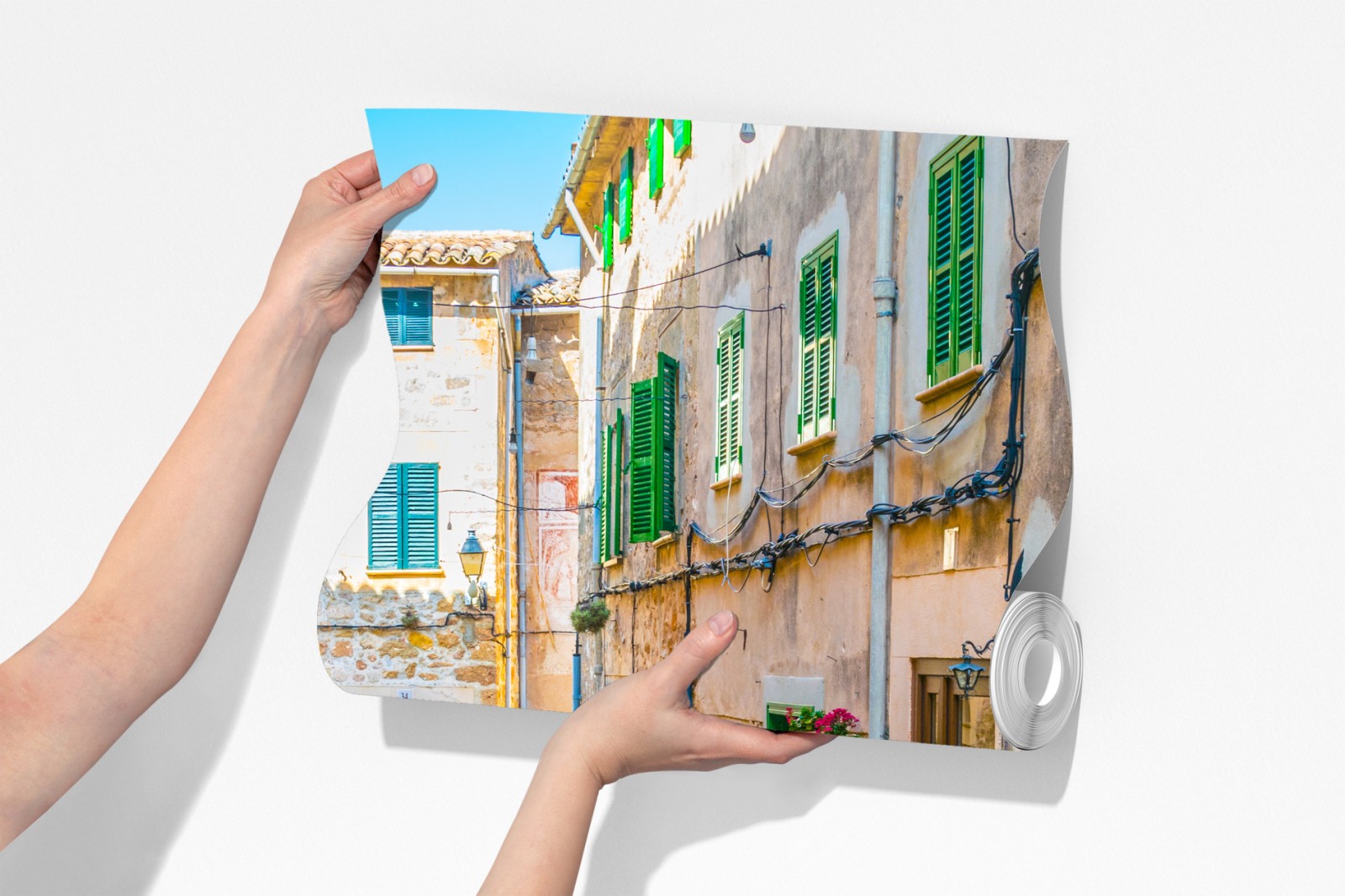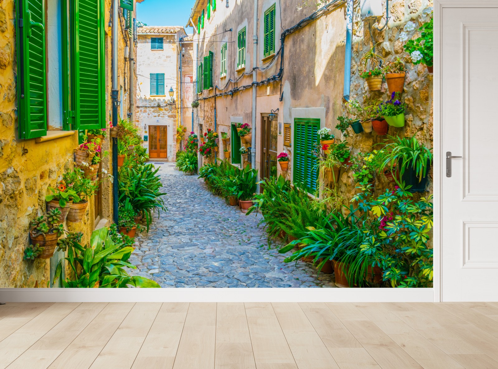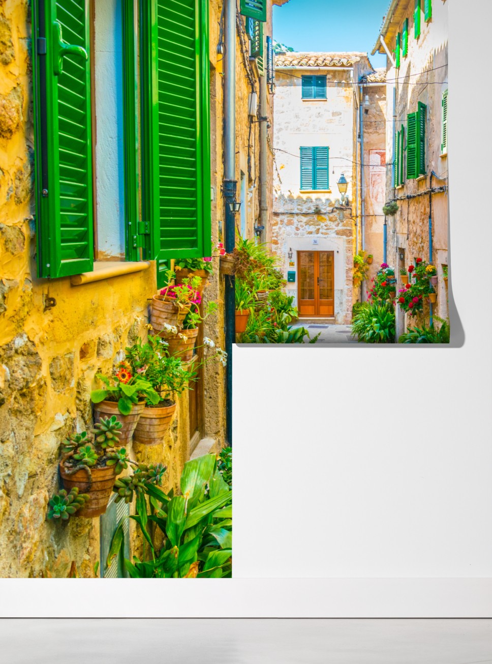 Dodaj śródziemnomorski urok do wnętrza dzięki tej słonecznej brukowanej uliczce z zielonymi okiennicami i bujnymi roślinami w donicach.