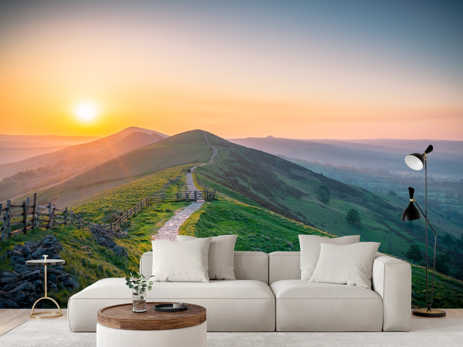 Fototapeta Wschód słońca nad zielonymi wzgórzami z kamienną ścieżką